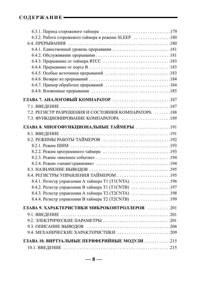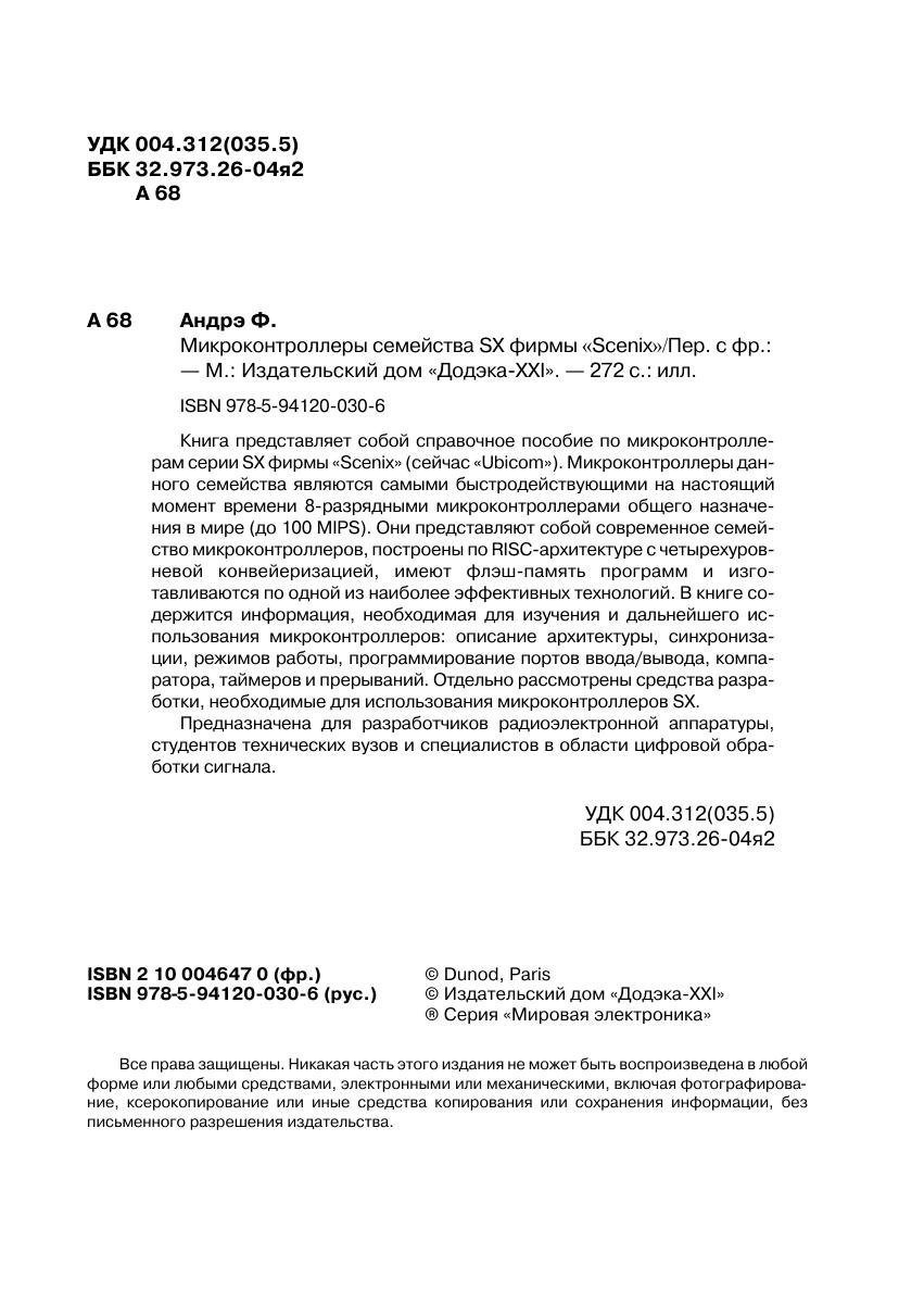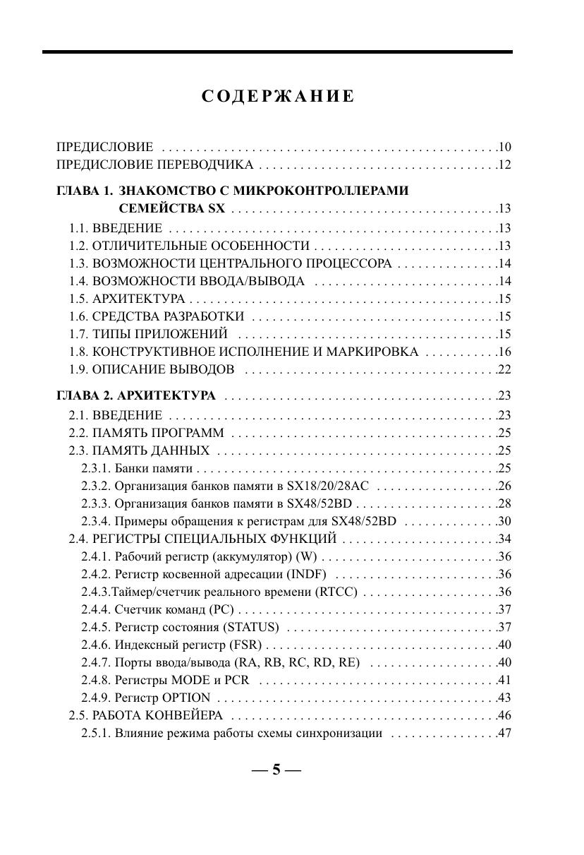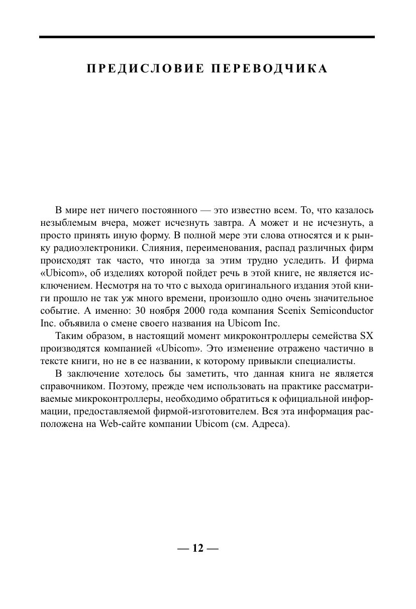 Книга представляет собой справочное пособие по микроконтроллерам серии SX фирмы «Scenix» (сейчас «Ubicom»). Микроконтроллеры данного семейства являются самыми быстродействующими на настоящий момент времени 8 разрядными микроконтроллерами общего назначения в мире (до 100 MIPS). Они представляют собой современное семейство микроконтроллеров, построены по RISC архитектуре с четырехуровневой конвейеризацией, имеют флэш память программ и изготавливаются по одной из наиболее эффективных технологий. В книге содержится информация, необходимая для изучения и дальнейшего использования микроконтроллеров: описание архитектуры, синхронизации, режимов работы, программирование портов ввода/вывода, компаратора, таймеров и прерываний. Отдельно рассмотрены средства разработки, необходимые для использования микроконтроллеров SX. Предназначена для разработчиков радиоэлектронной аппаратуры, студентов технических вузов и специалистов в области цифровой обработки сигнала.