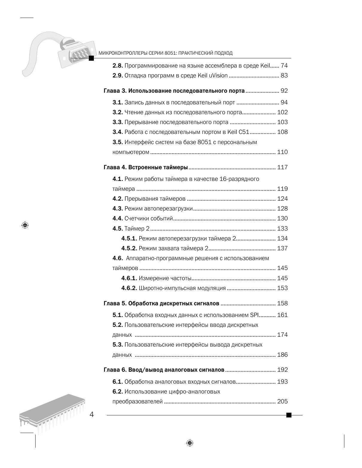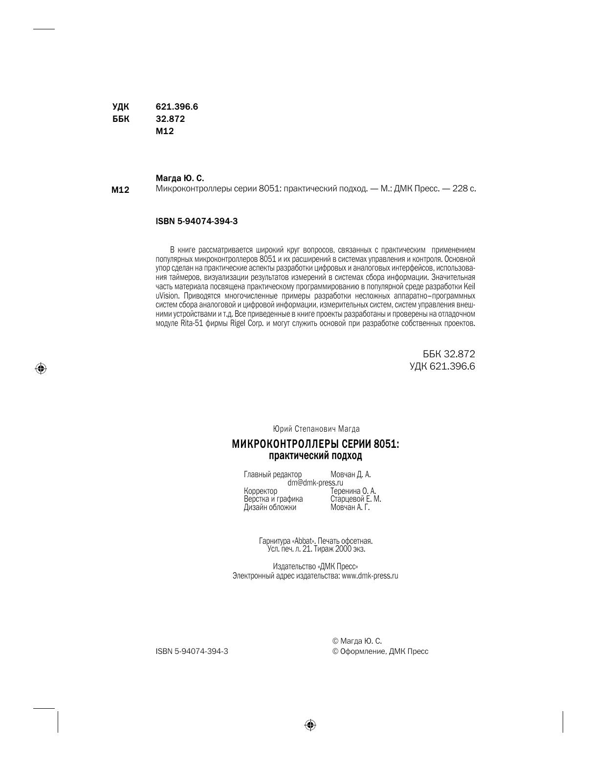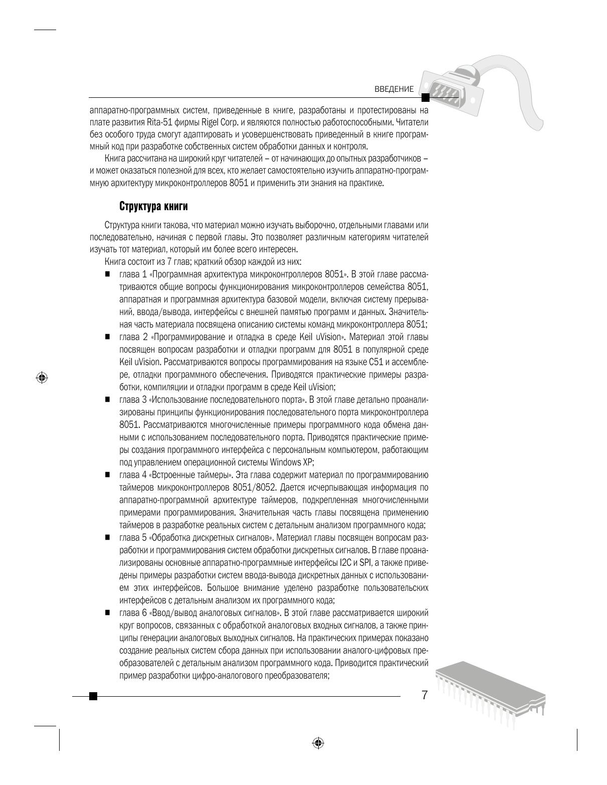 В книге рассматривается широкий круг вопросов, связанных с практическим применением популярных микроконтроллеров 8051 и их расширений в системах управления и контроля. Основной упор сделан на практические аспекты разработки цифровых и аналоговых интерфейсов, использования таймеров, визуализации результатов измерений в системах сбора информации. Значительная часть материала посвящена практическому программированию в популярной среде разработки KeiluVision. Приводятся многочисленные примеры разработки несложных аппаратно–программных систем сбора аналоговой и цифровой информации, измерительных систем, систем управления внешними устройствами и т.д. Все приведенные в книге проекты разработаны и проверены на отладочном модуле Rita-51 фирмы Rigel Corp. и могут служить основой при разработке собственных проектов.