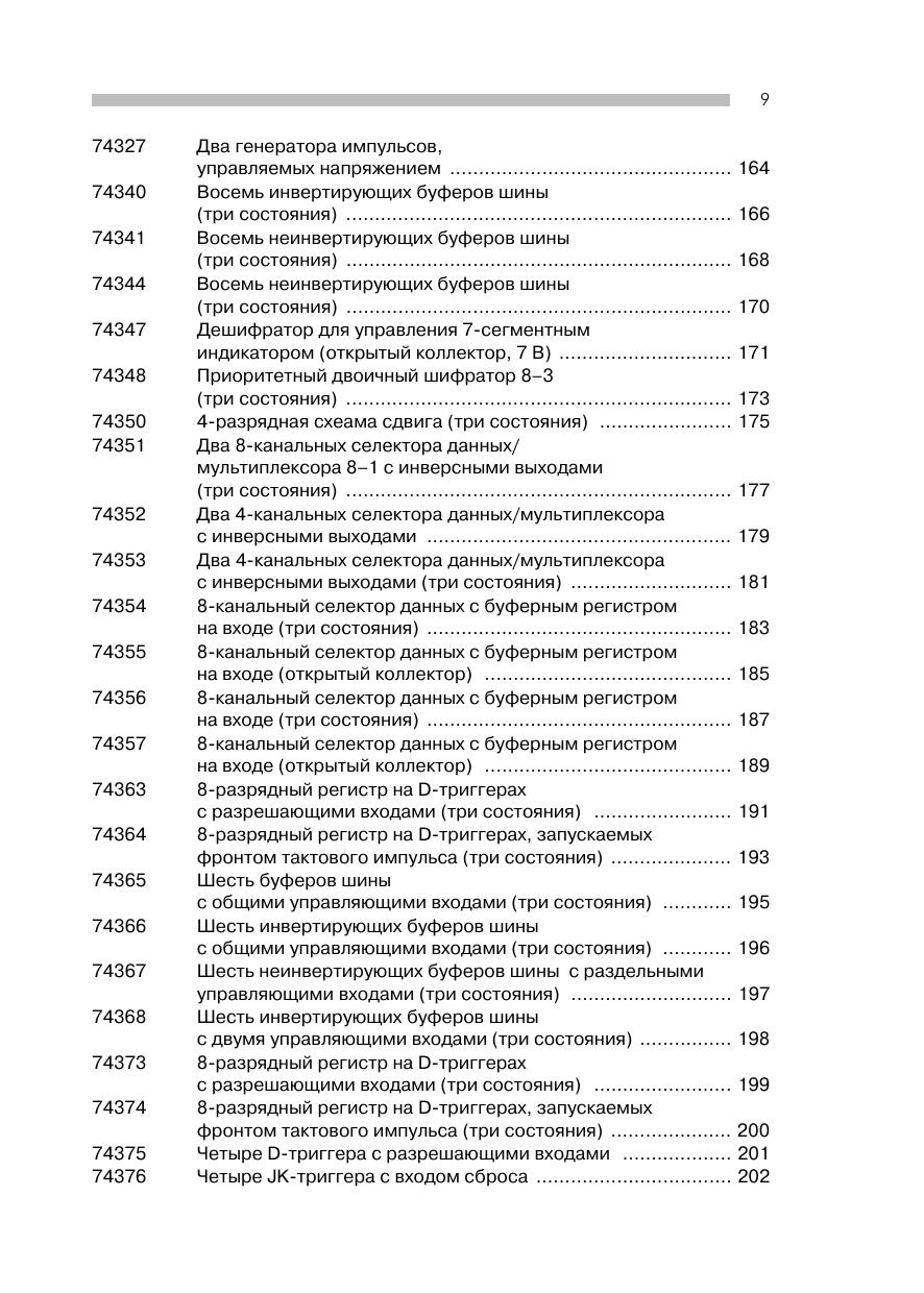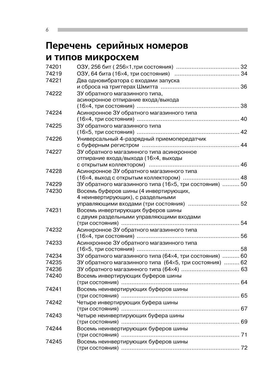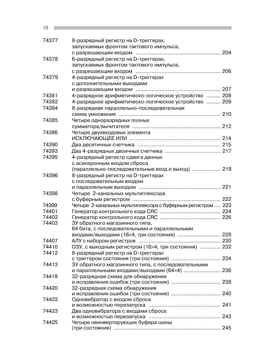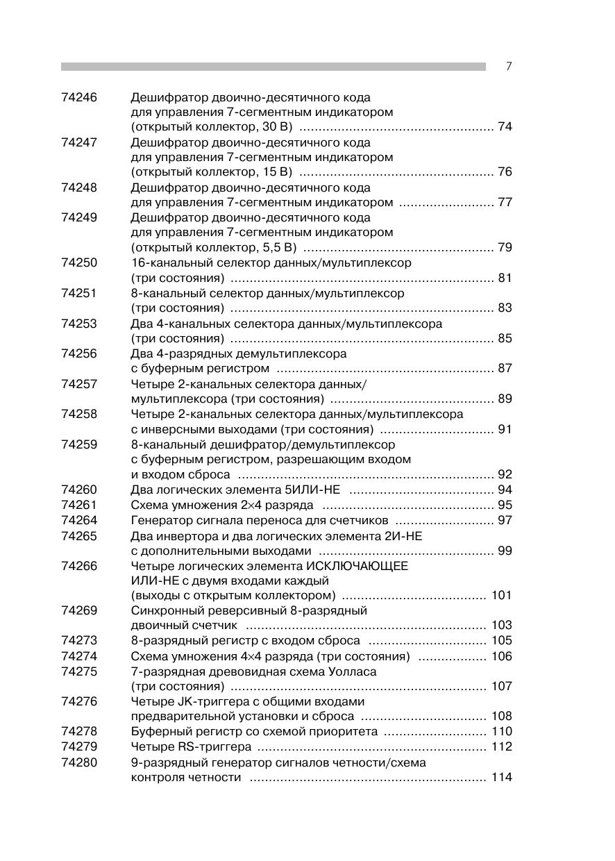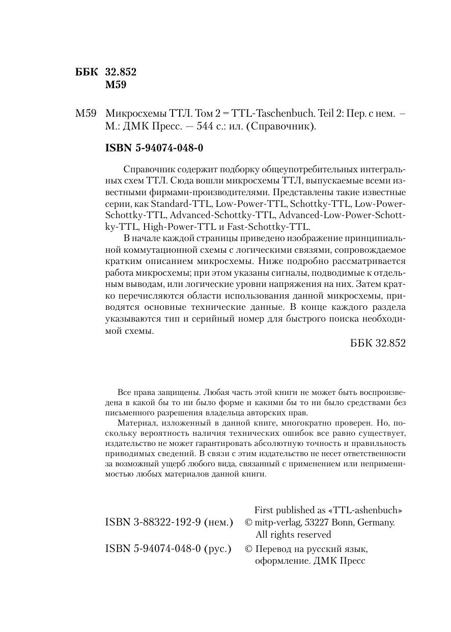 Справочник содержит подборку общеупотребительных интегральных схем ТТЛ. Сюда вошли микросхемы ТТЛ, выпускаемые всеми известными фирмами-производителями. Представлены такие известные серии, как Standard-TTL, Low-Power-TTL, Schottky-TTL, Low-Power-Schottky-TTL, Advanced-Schottky-TTL, Advanced-Low-Power-Schottky-TTL, High-Power-TTL и Fast-Schottky-TTL. В начале каждой страницы приведено изображение принципиальной коммутационной схемы с логическими связями, сопровождаемое кратким описанием микросхемы. Ниже подробно рассматривается работа микросхемы, при этом указаны сигналы, подводимые к отдельным выводам, или логические уровни напряжения на них. Затем кратко перечисляются области использования данной микросхемы, приводятся основные технические данные. В конце каждого раздела указываются тип и серийный номер для быстрого поиска необходимой схемы.