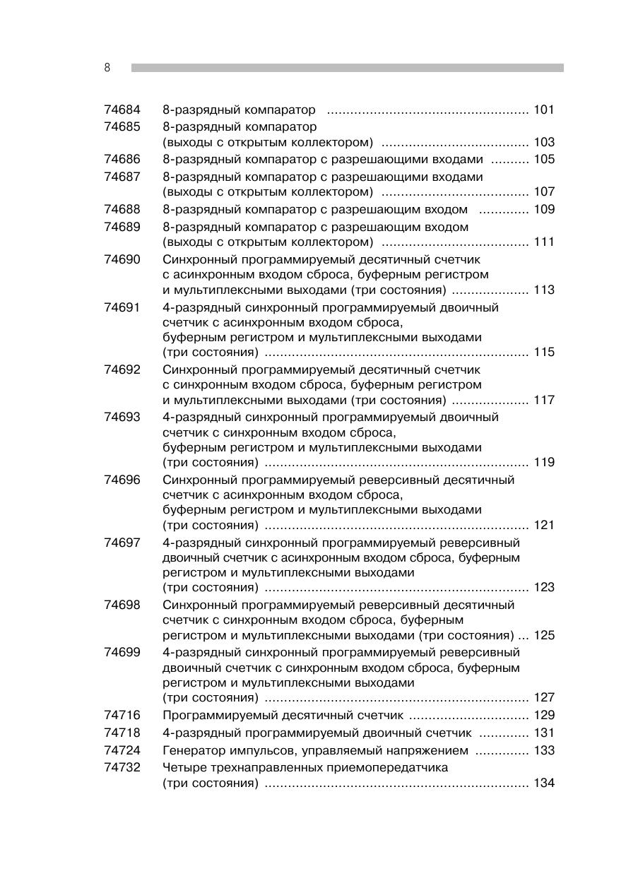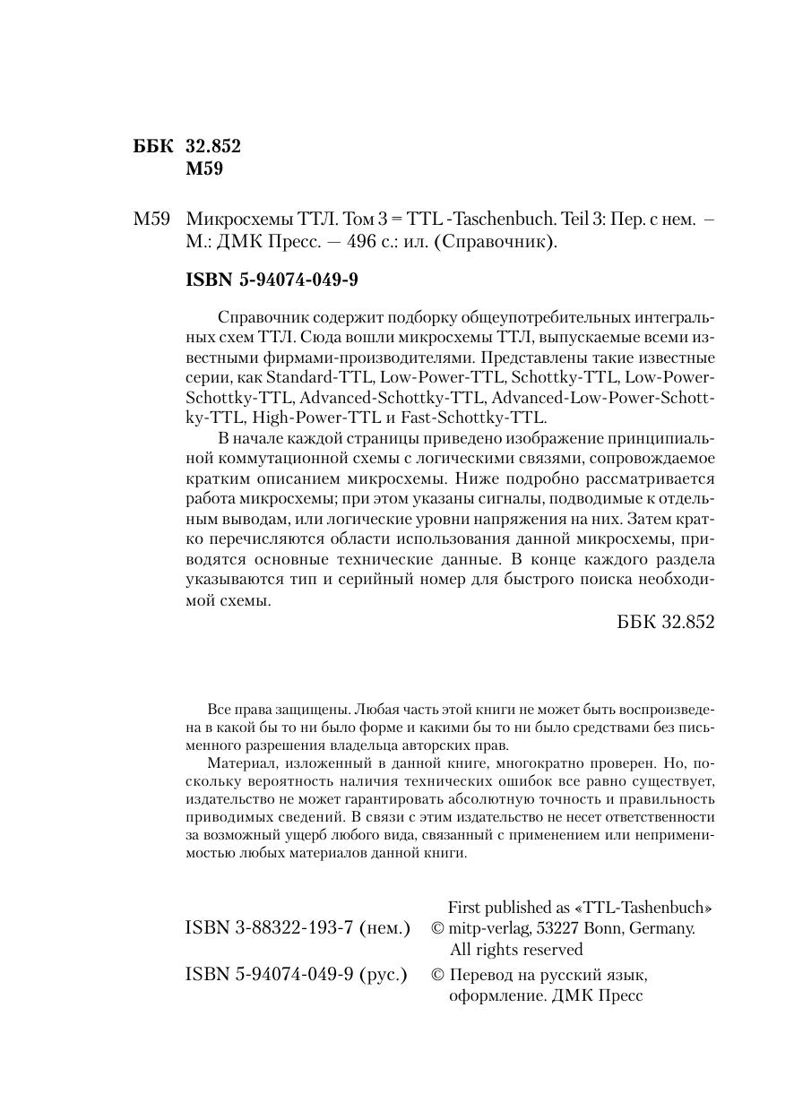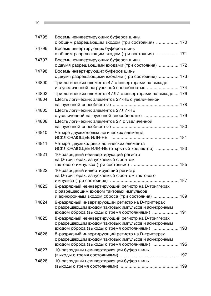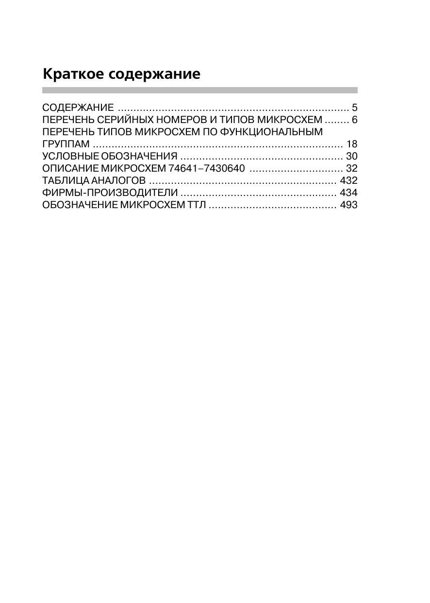 Справочник содержит подборку общеупотребительных интегральных схем ТТЛ. Сюда вошли микросхемы ТТЛ, выпускаемые всеми известными фирмами-производителями. Представлены такие известные серии, как Standard-TTL, Low-Power-TTL, Schottky-TTL, Low-Power-Schottky-TTL, Advanced-Schottky-TTL, Advanced-Low-Power-Schottky-TTL, High-Power-TTL и Fast-Schottky-TTL. В начале каждой страницы приведено изображение принципиальной коммутационной схемы с логическими связями, сопровождаемое кратким описанием микросхемы. Ниже подробно рассматривается работа микросхемы, при этом указаны сигналы, подводимые к отдельным выводам, или логические уровни напряжения на них. Затем кратко перечисляются области использования данной микросхемы, приводятся основные технические данные. В конце каждого раздела указываются тип и серийный номер для быстрого поиска необходимой схемы.