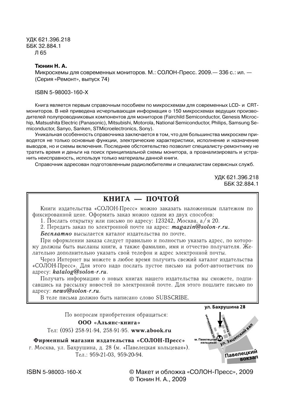Книга является первым справочным пособием по микросхемам для современных LCD- и CRT-мониторов. В ней приведена исчерпывающая информация о 150 микросхемах ведущих производителей полупроводниковых компонентов для мониторов (Fairchild Semiconductor, Genesis Microchip, Matsushita Electric (Panasonic), Mitsubishi, Motorola, National Semiconductor, Philips, Samsung Semiconductor, Sanyo, Sanken, STMicroelectronics, Sony).Уникальная особенность справочника заключается в том, что для большинства микросхем приводятся не только основные функции, электрические характеристики, исполнение и назначение выводов, но и схемы включения. Последнее обстоятельство позволит специалисту-ремонтнику не тратить время и деньги на поиск принципиальной схемы монитора, а проанализировать и устранить неисправность, используя только материалы данной книги.Справочник адресован подготовленным радиолюбителям и специалистам сервисных служб.