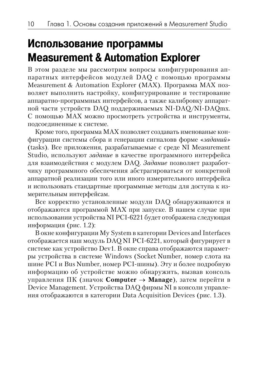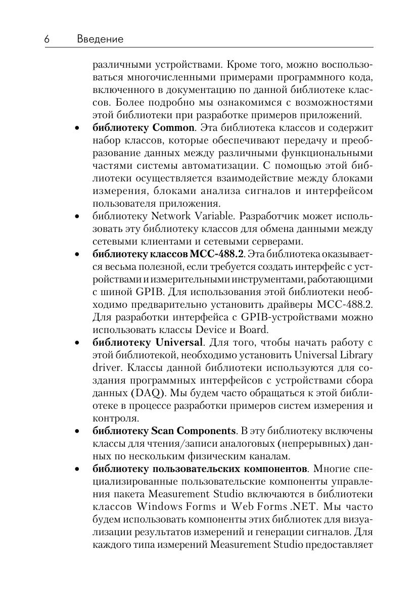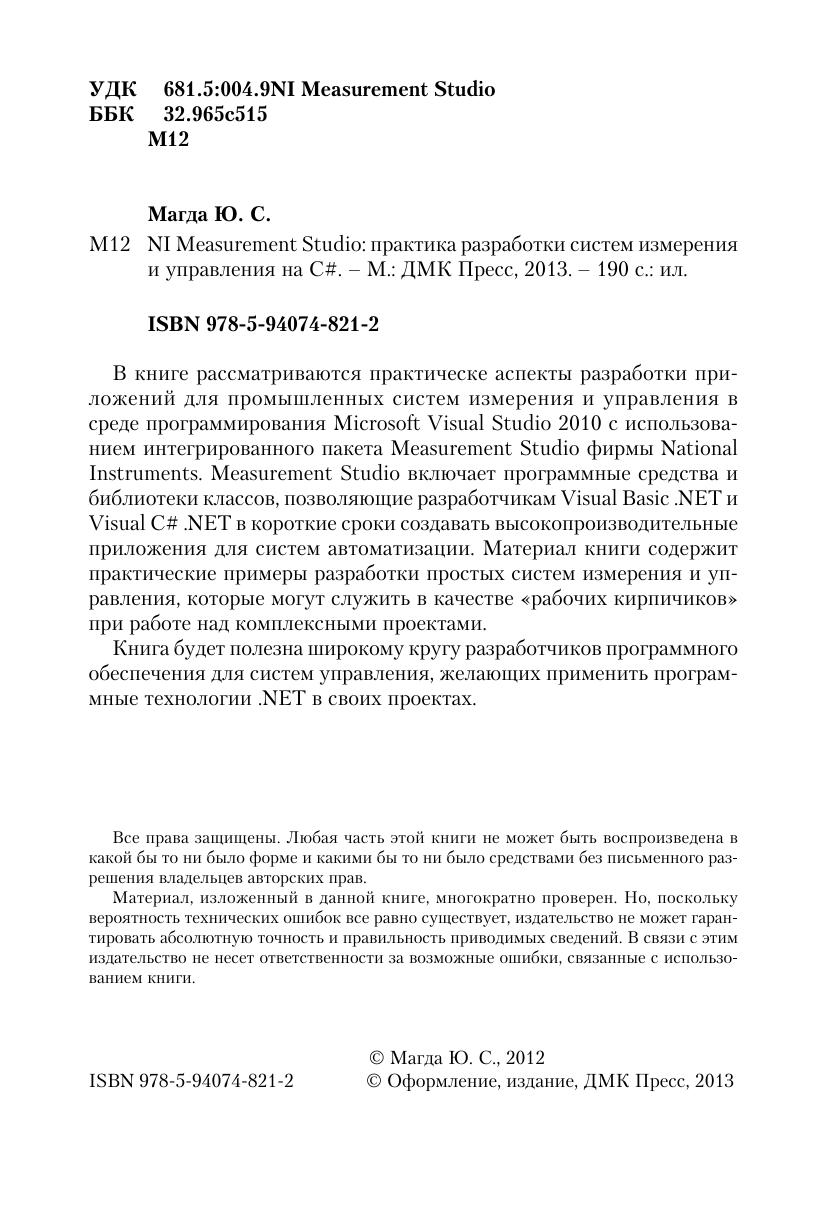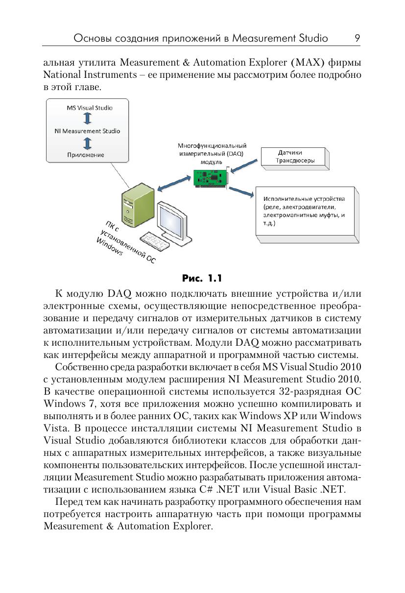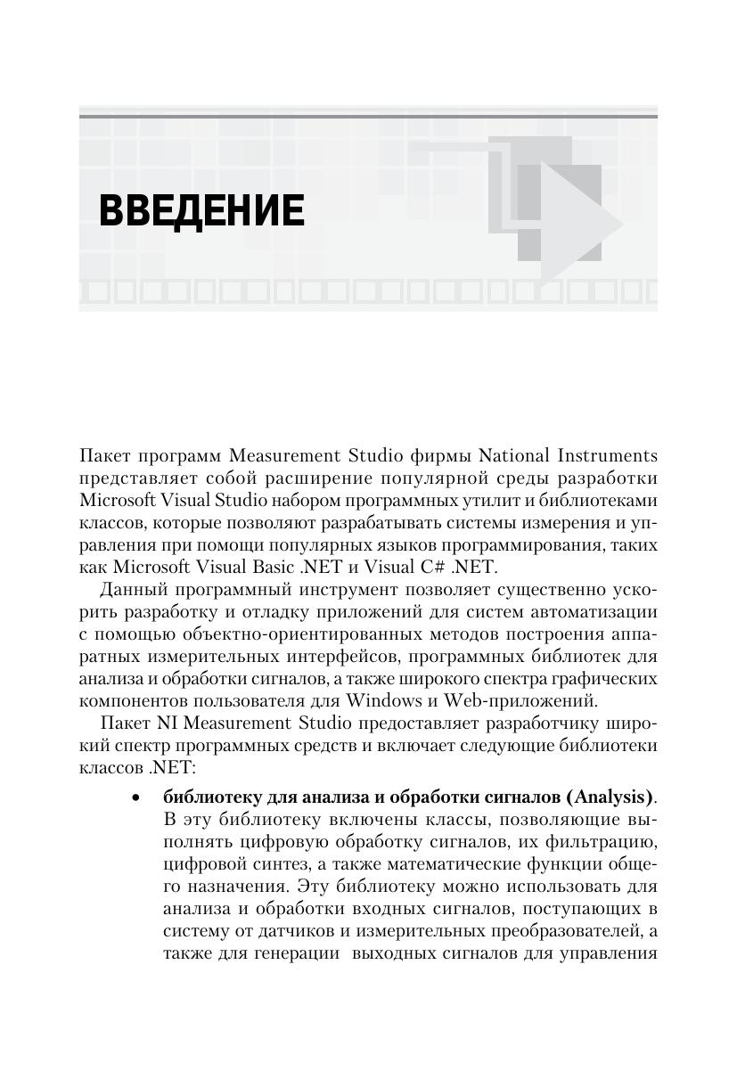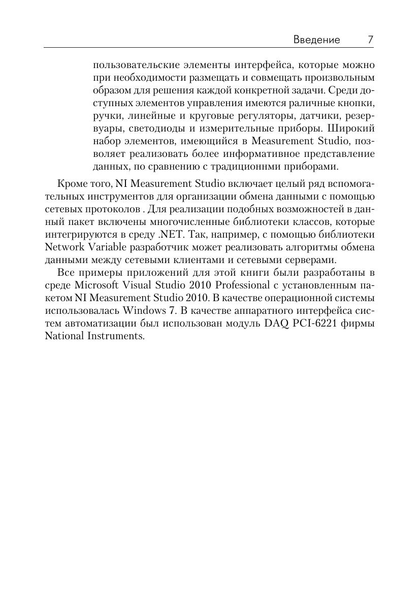 В книге рассматриваются практическе аспекты разработки приложений для промышленных систем измерения и управления в среде программирования Microsoft Visual Studio 2010 с использованием интегрированного пакета Measurement Studio фирмы National Instruments. Measurement Studio включает программные средства и библиотеки классов, позволяющие разработчикам Visual Basic .NET и Visual C# .NET в короткие сроки создавать высокопроизводительные приложения для систем автоматизации. Материал книги содержит практические примеры разработки простых систем измерения и управления, которые могут служить в качестве «рабочих кирпичиков» при работе над комплексными проектами. Книга будет полезна широкому кругу разработчиков программного обеспечения для систем управления, желающих применить программные технологии. NET в своих проектах.