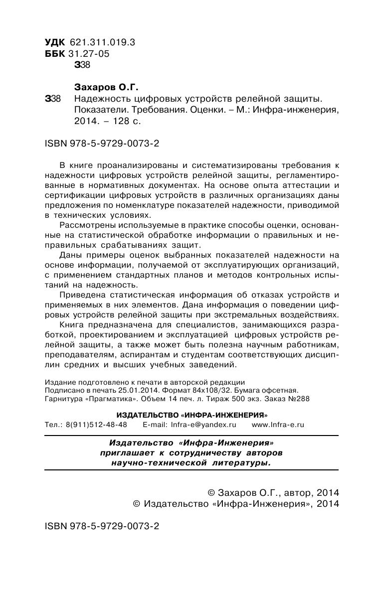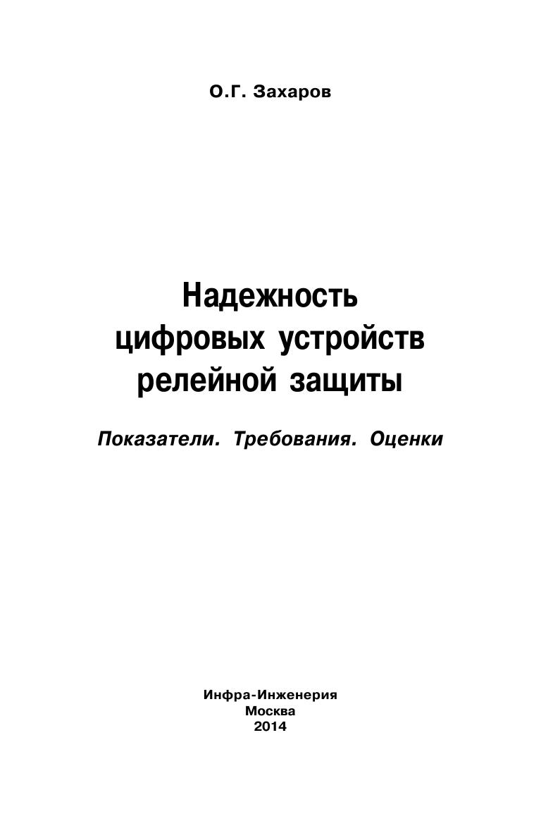 В книге проанализированы и систематизированы требования к надежности цифровых устройств релейной защиты, регламентированные в нормативных документах. На основе опыта аттестации и сертификации цифровых устройств в различных организациях даны предложения по номенклатуре показателей надежности, приводимой в технических условиях. Рассмотрены используемые в практике способы оценки, основанные на статистической обработке информации о правильных и неправильных срабатываниях защит. Даны примеры оценок выбранных показателей надежности на основе информации, получаемой от эксплуатирующих организаций, с применением стандартных планов и методов контрольных испытаний на надежность. Приведена статистическая информация об отказах устройств и применяемых в них элементов. Дана информация о поведении цифровых устройств релейной защиты при экстремальных воздействиях. Книга предназначена для специалистов, занимающихся разработкой, проектированием и эксплуатацией цифровых устройств релейной защиты, а также может быть полезна научным работникам, преподавателям, аспирантам и студентам соответствующих дисциплин средних и высших учебных заведений.