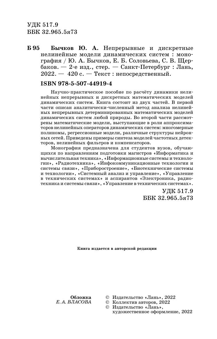 Научно-практическое пособие по расчёту динамики нелинейных непрерывных и дискретных математических моделей динамических систем. Книга состоит из двух частей. В первой части описан аналитически-численный метод анализа нелинейных непрерывных детерминированных математических моделей динамических систем любой природы. Во второй части рассмотрены математические модели, выступающие в роли аппроксиматоров нелинейных операторов динамических систем: многомерные полиномы, регрессионные модели, различные структуры нейронных сетей. Приведены примеры синтеза моделей частотных детекторов, нелинейных фильтров и компенсаторов.
