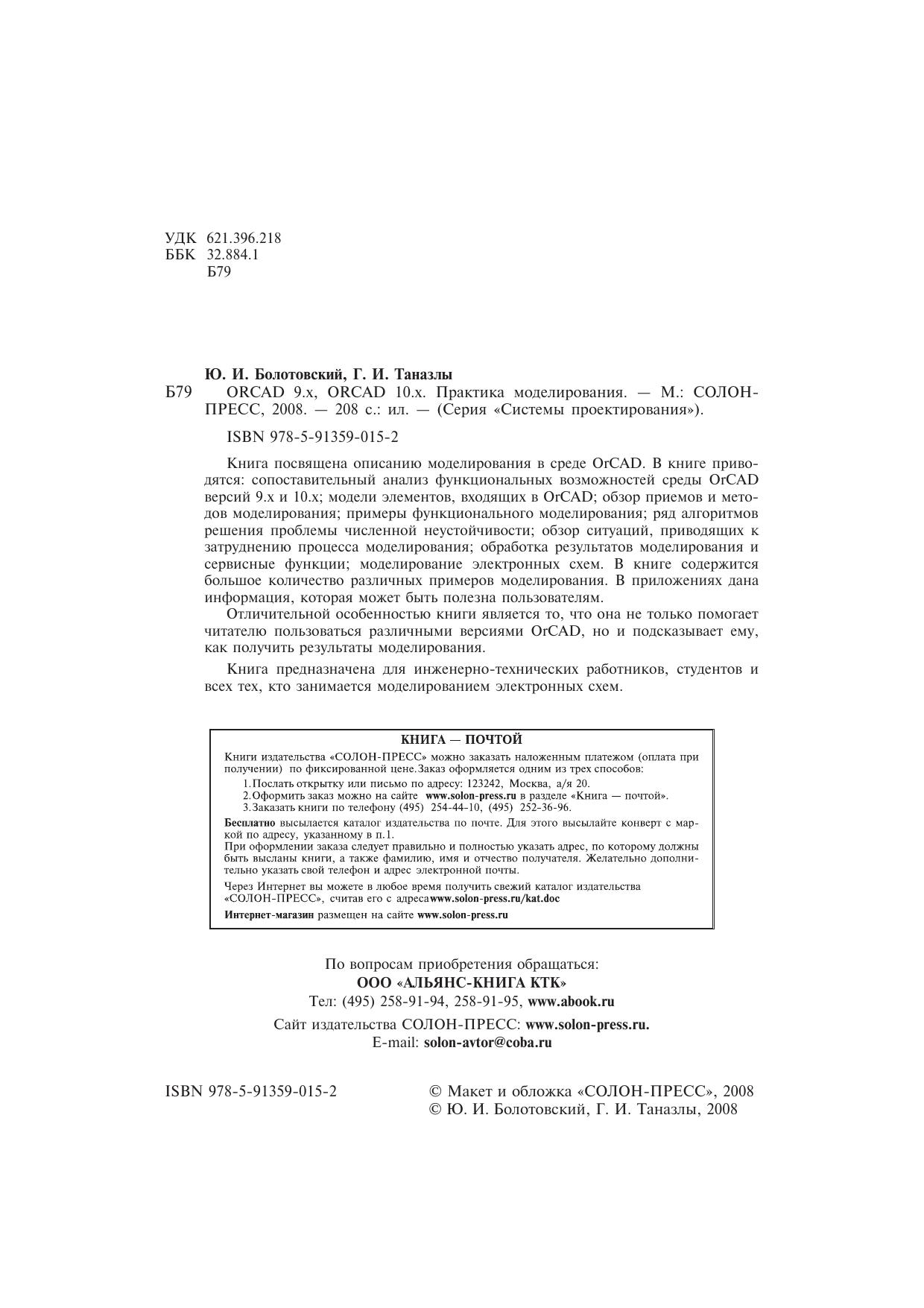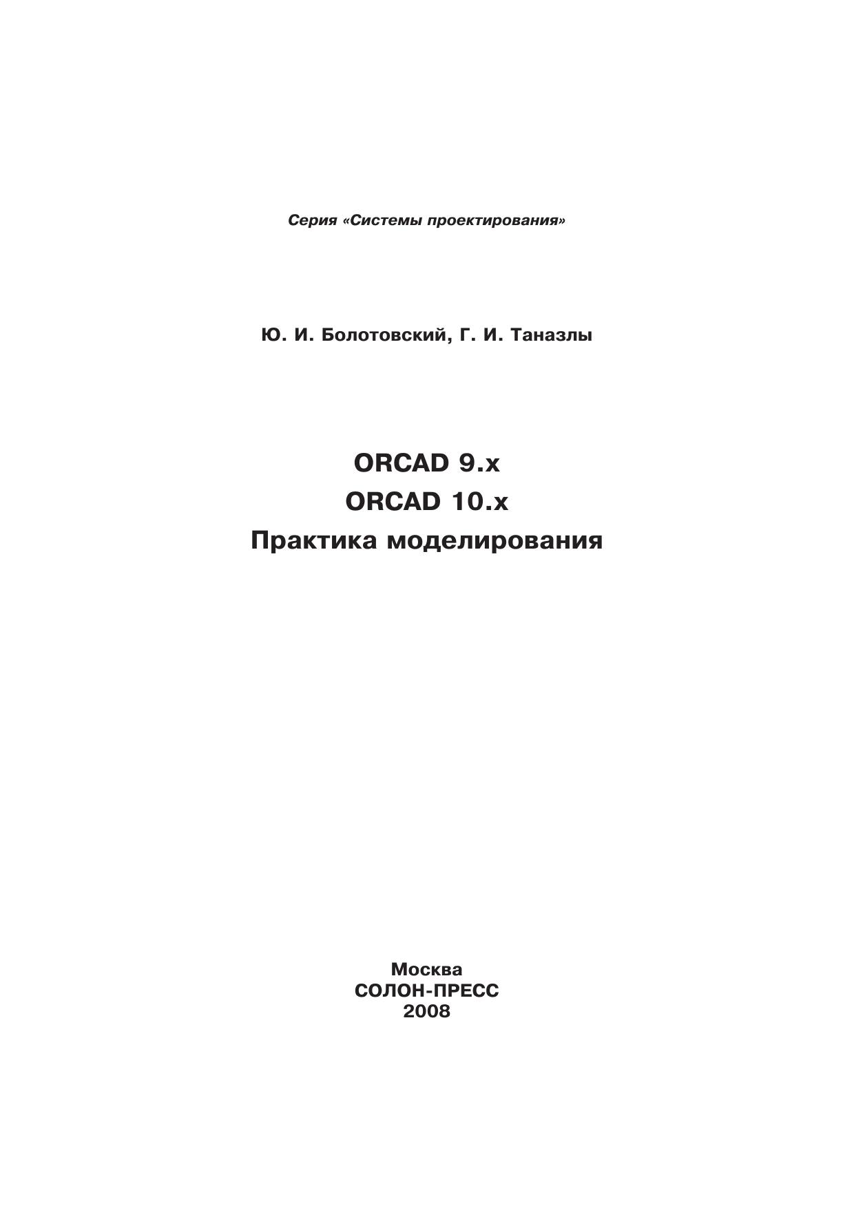 Книга посвящена описанию моделирования в среде OrCAD. В книге приводятся: сопоставительный анализ функциональных возможностей среды OrCAD версий 9.х и 10.х модели элементов, входящих в OrCAD обзор приемов и методов моделирования примеры функционального моделирования ряд алгоритмов решения проблемы численной неустойчивости обзор ситуаций, приводящих к затруднению процесса моделирования обработка результатов моделирования и сервисные функции моделирование электронных схем. В книге содержится большое количество различных примеров моделирования. В приложениях дана информация, которая может быть полезна пользователям.Отличительной особенностью книги является то, что она не только помогает читателю пользоваться различными версиями OrCAD, но и подсказывает ему, как получить результаты моделирования.Книга предназначена для инженерно-технических работников, студентов и всех тех, кто занимается моделированием электронных схем.