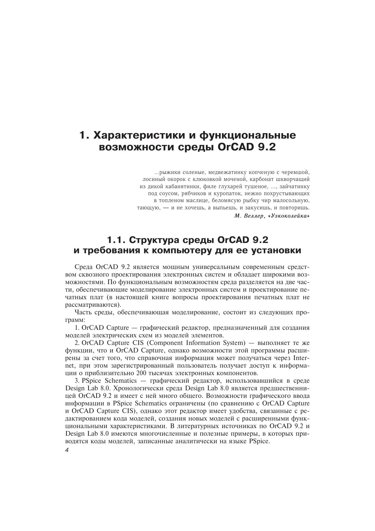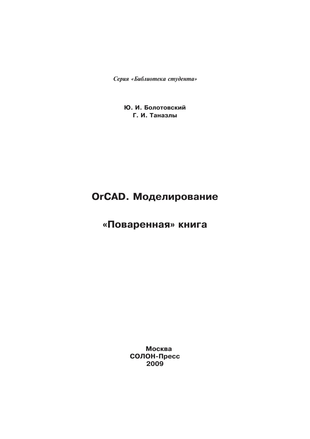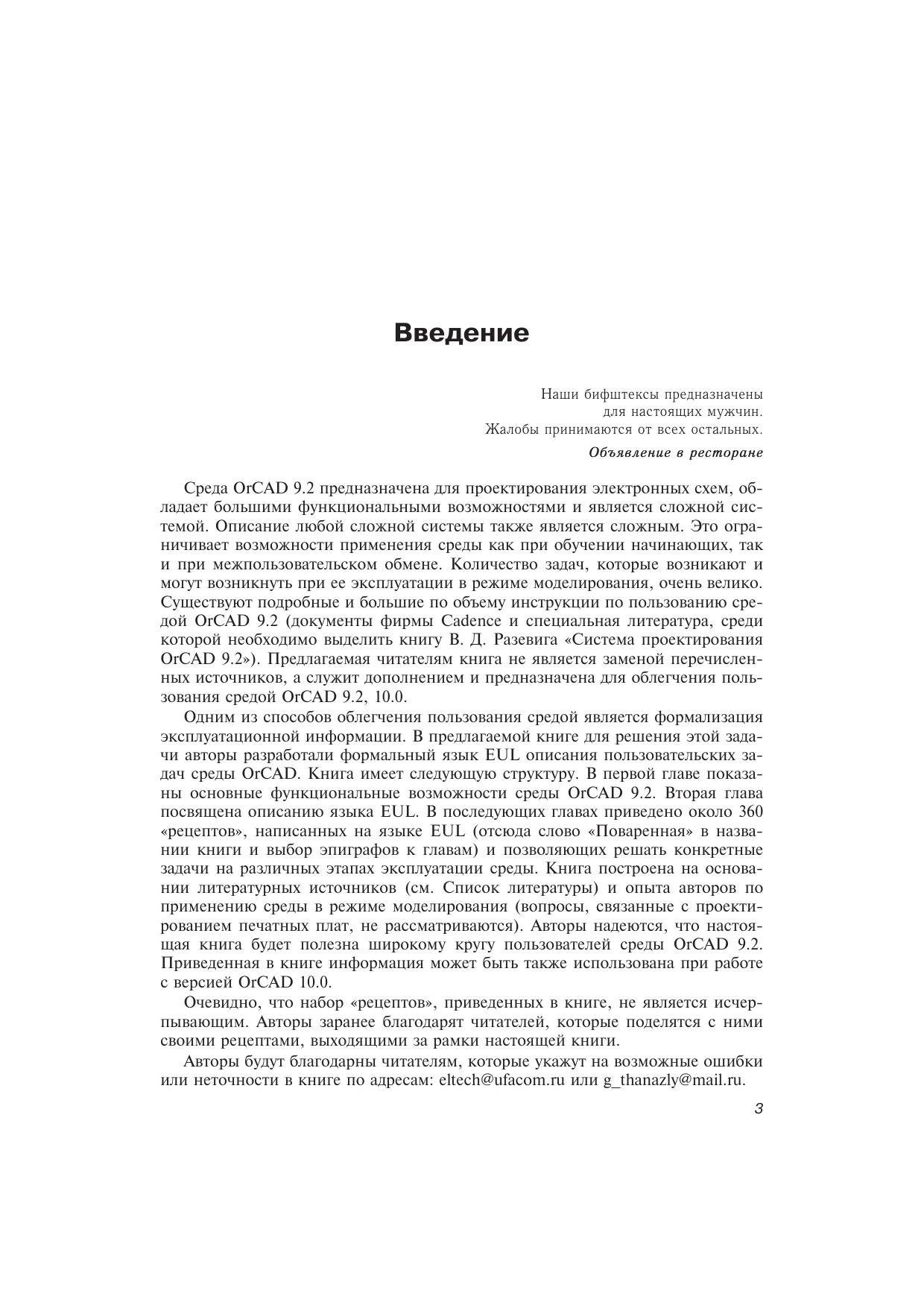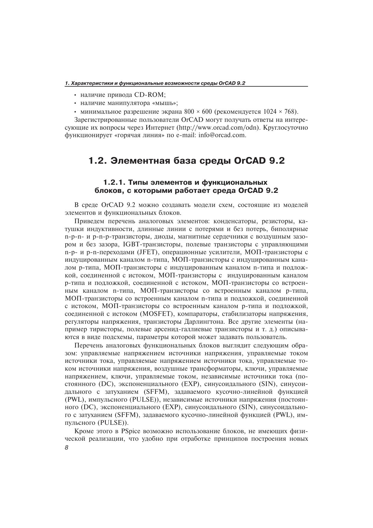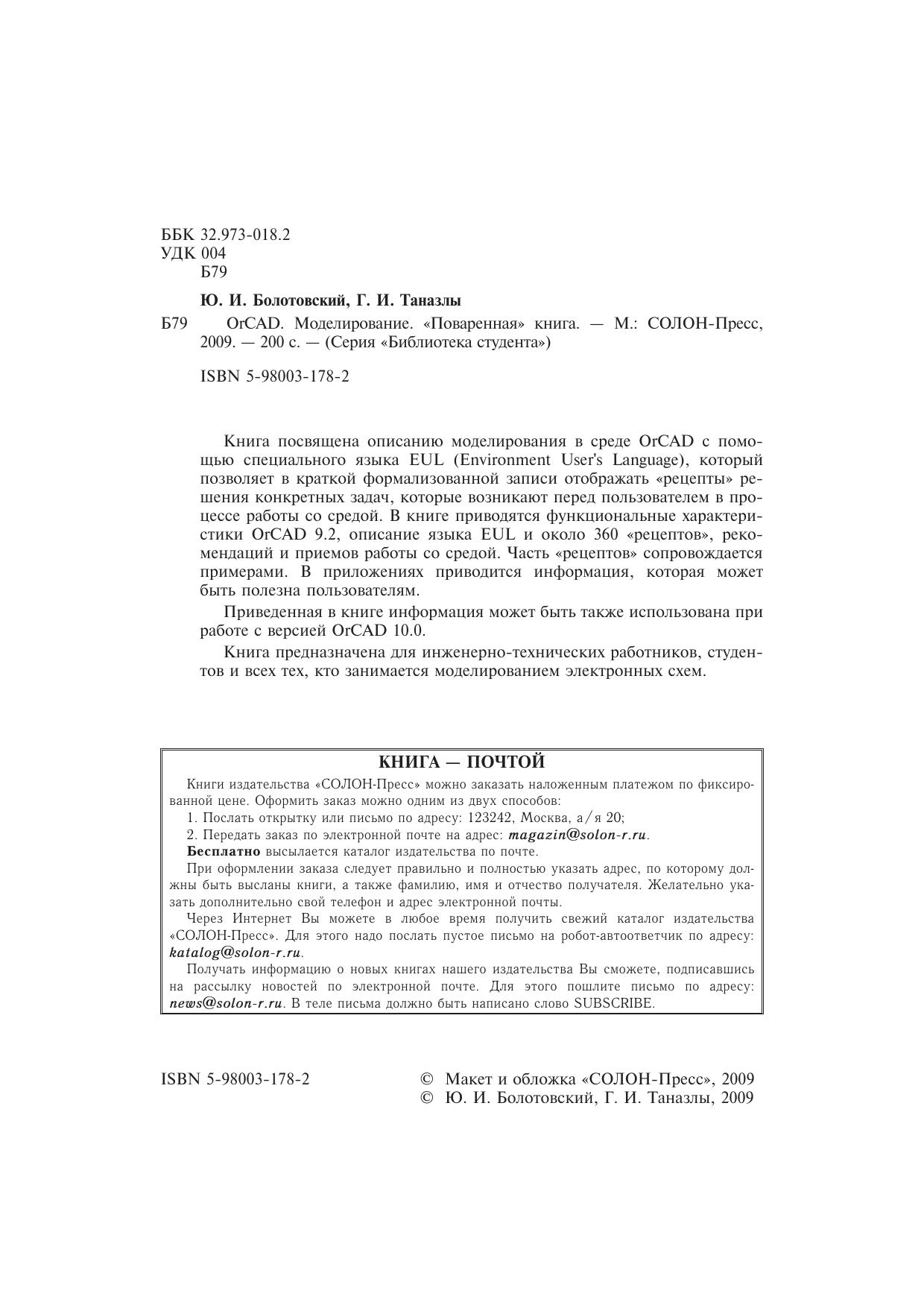 Книга посвящена описанию моделирования в среде OrCAD с помощью специального языка EUL (Environment User's Language), который позволяет в краткой формализованной записи отображать «рецепты» решения конкретных задач, которые возникают перед пользователем в процессе работы со средой. В книге приводятся функциональные характеристики OrCAD 9.2, описание языка EUL и около 360 «рецептов», рекомендаций и приемов работы со средой. Часть «рецептов» сопровождается примерами. В приложениях приводится информация, которая может быть полезна пользователям.Приведенная в книге информация может быть также использована при работе с версией OrCAD 10.0.Книга предназначена для инженерно-технических работников, студентов и всех тех, кто занимается моделированием электронных схем.