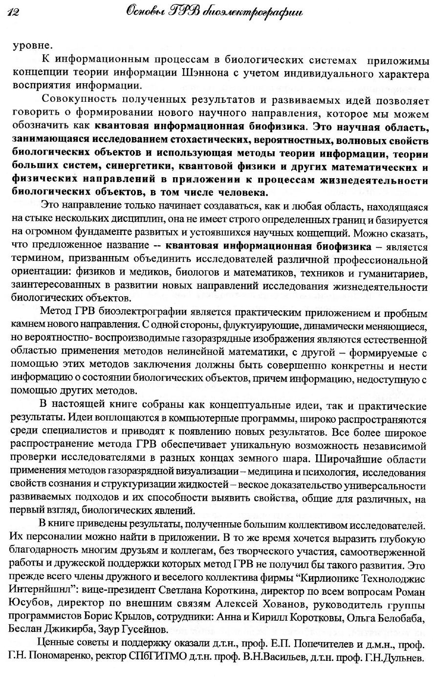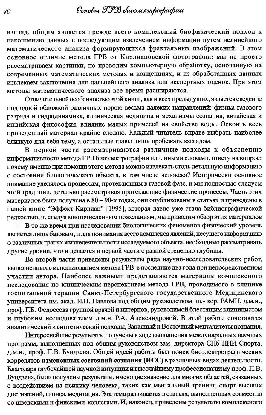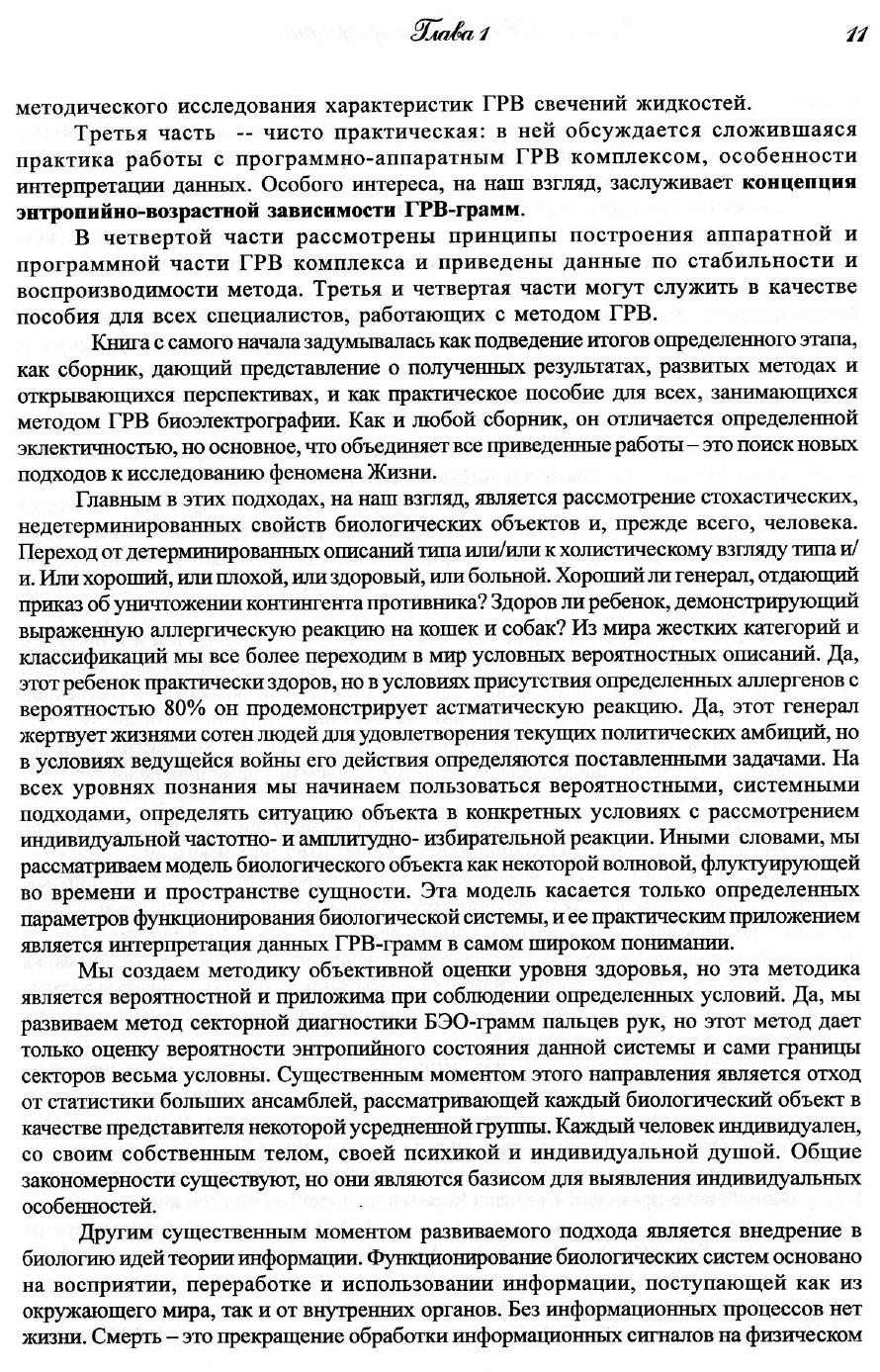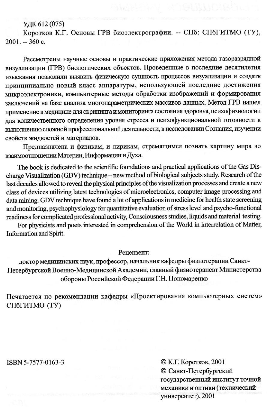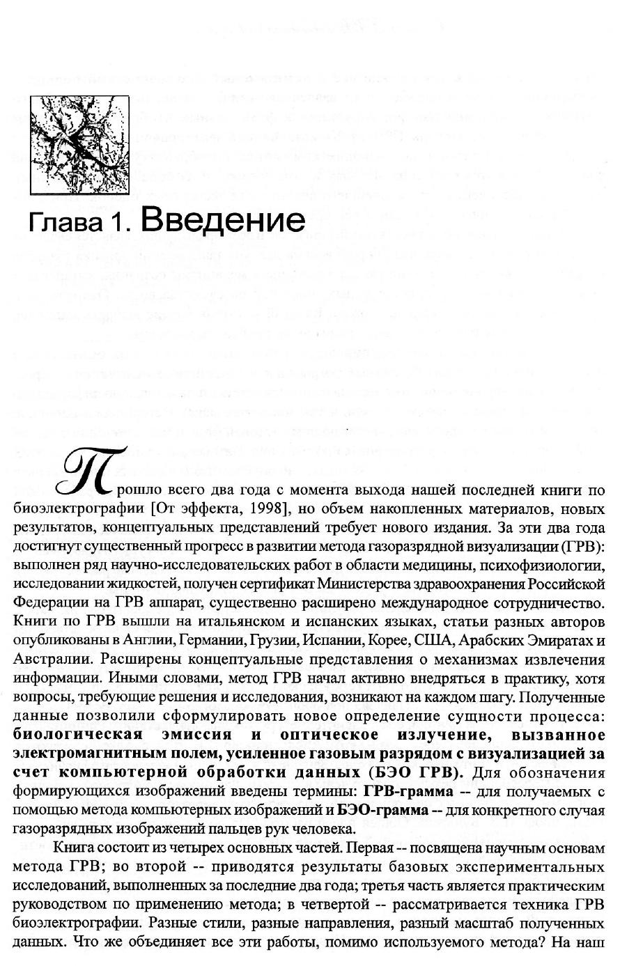 Рассмотрены научные основы и практические приложения метода газоразрядной визуализации (ГРВ) биологических объектов. Проведенные в последние десятилетия изыскания позволили выявить физическую сущность процессов визуализации и создать принципиально новый класс аппаратуры, использующей последние достижения микроэлектроники, компьютерные методы обработки изображений и формирования заключений на базе анализа многопараметрических массивов данных. Метод ГРВ нашел применение в медицине для скрининга и мониторинга состояния здоровья, психофизиологии для количественного определения уровня стресса и психофункциональной готовности к выполнению сложной профессиональной деятельности, в исследовании Сознания, изучении свойств жидкостей и материалов. Предназначена и физикам, и лирикам, стремящимся познать картину мира во взаимоотношении Материи, Информации и Духа.