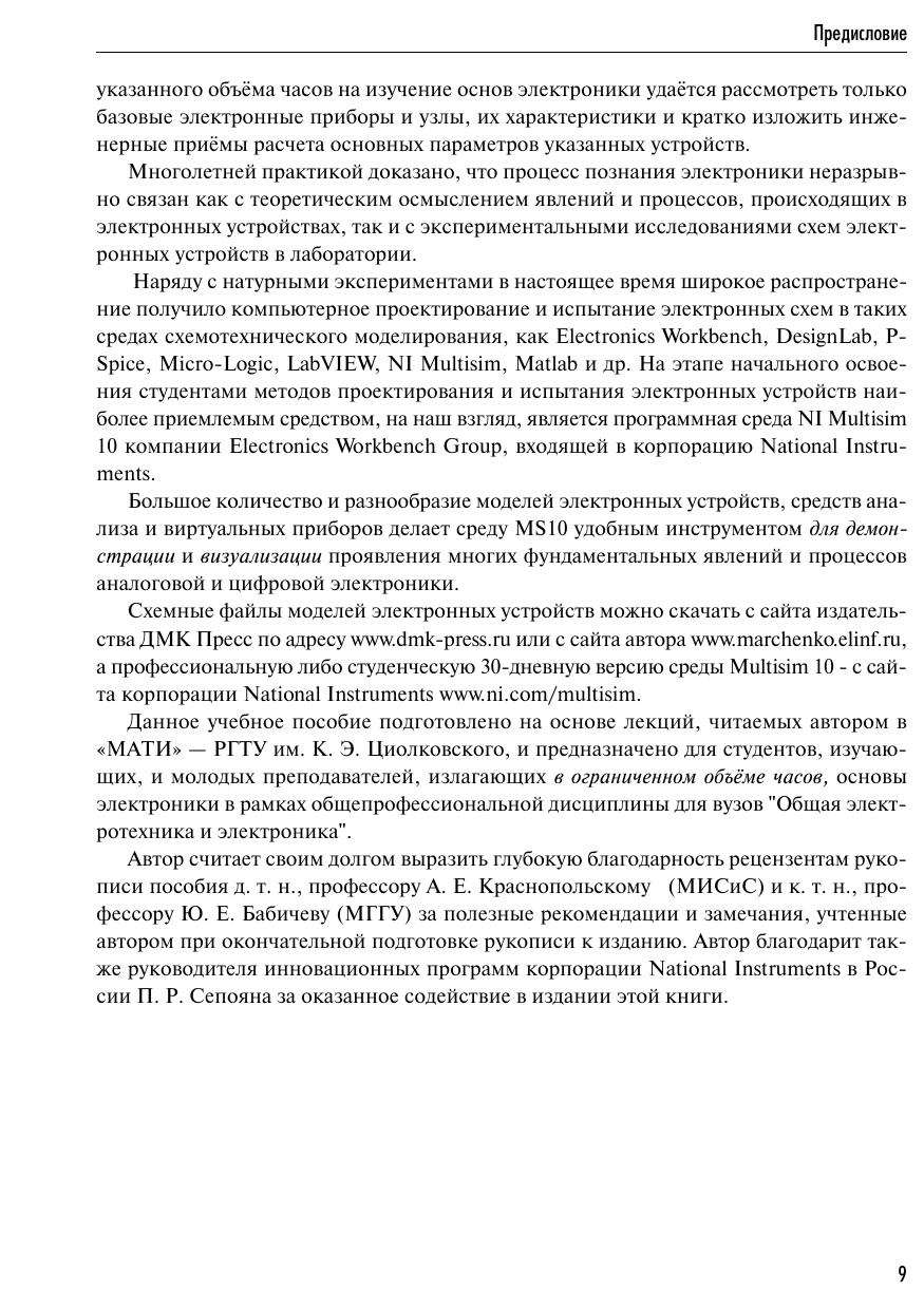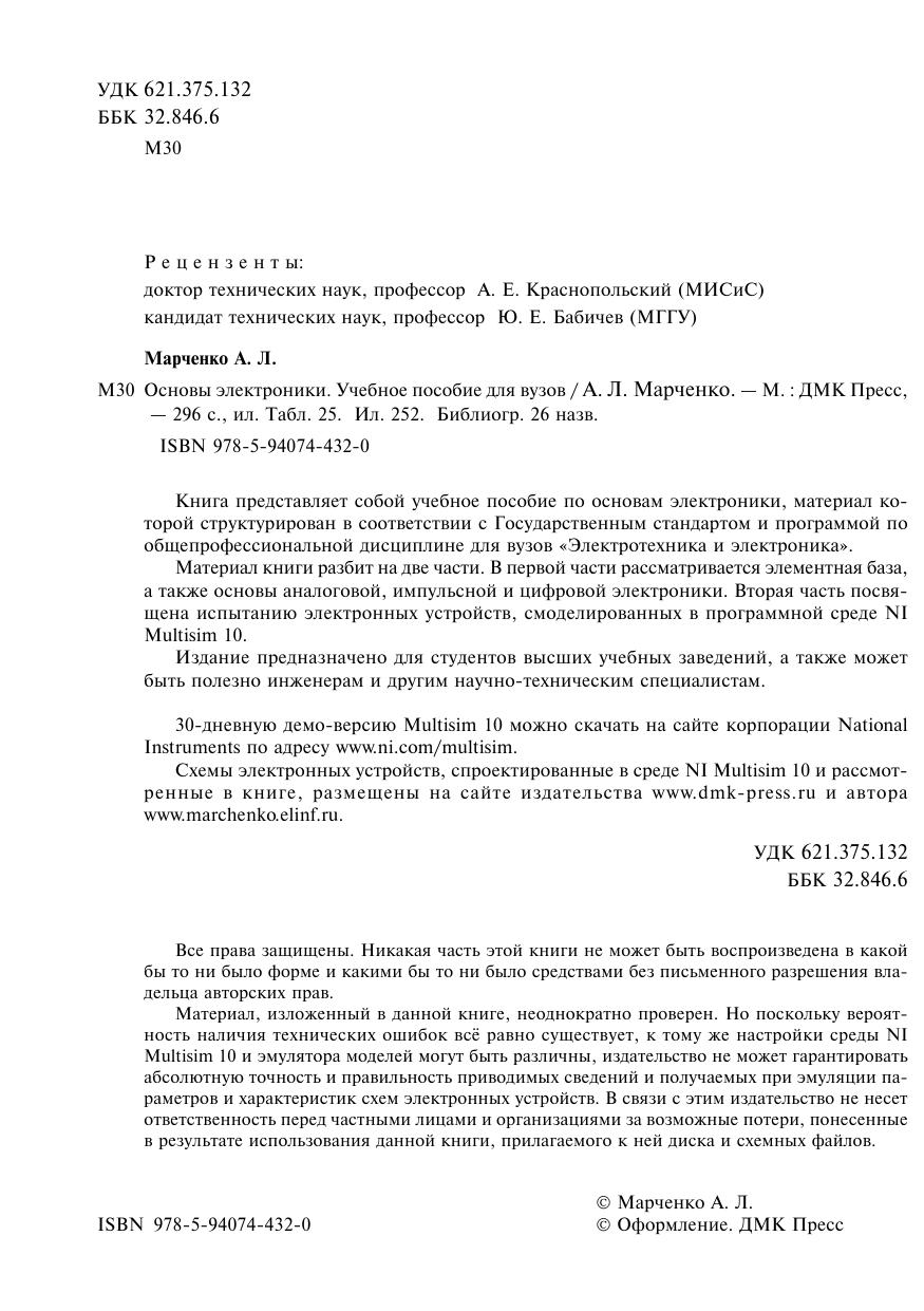 Книга представляет собой учебное пособие по основам электроники, материал которой структурирован в соответствии с Государственным стандартом и программой по общепрофессиональной дисциплине для вузов «Электротехника и электроника». Материал книги разбит на две части. В первой части рассматривается элементная база, а также основы аналоговой, импульсной и цифровой электроники. Вторая часть посвящена испытанию электронных устройств, смоделированных в программной среде NI Multisim 10. Издание предназначено для студентов высших учебных заведений, а также может быть полезно инженерам и другим научно-техническим специалистам.