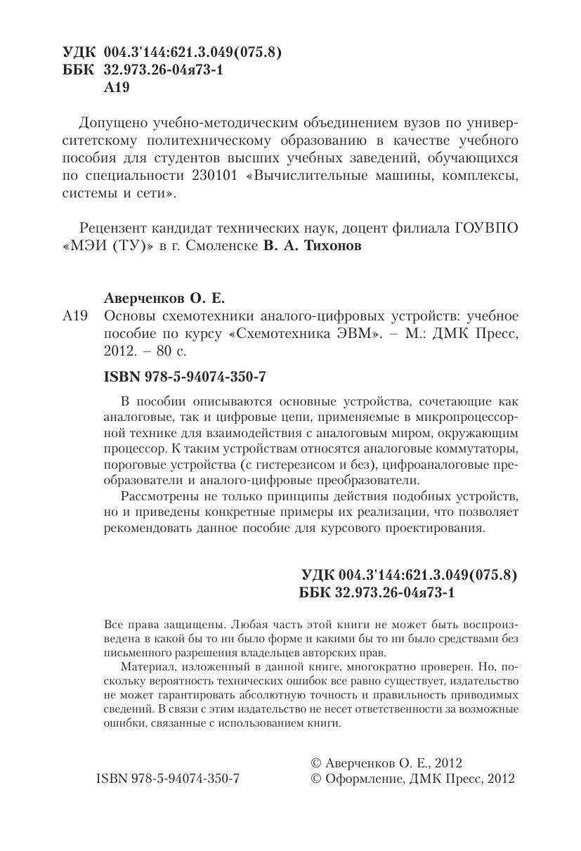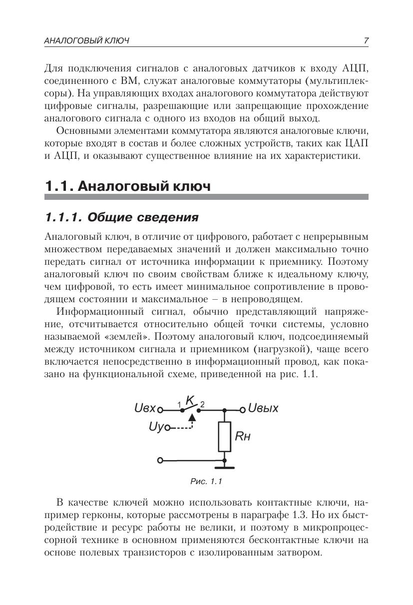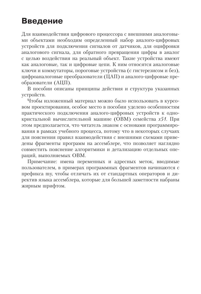 В пособии описываются основные устройства, сочетающие как аналоговые, так и цифровые цепи, применяемые в микропроцессорной технике для взаимодействия с аналоговым миром, окружающим процессор. К таким устройствам относятся аналоговые коммутаторы, пороговые устройства (с гистерезисом и без), цифроаналоговые преобразователи и аналого-цифровые преобразователи. Рассмотрены не только принципы действия подобных устройств, но и приведены конкретные примеры их реализации, что позволяет рекомендовать данное пособие для курсового проектирования.