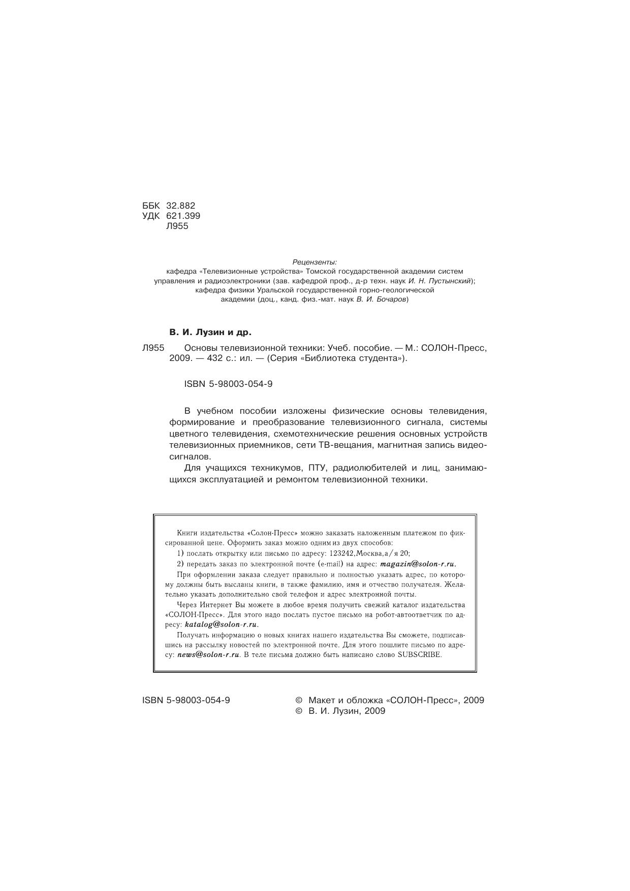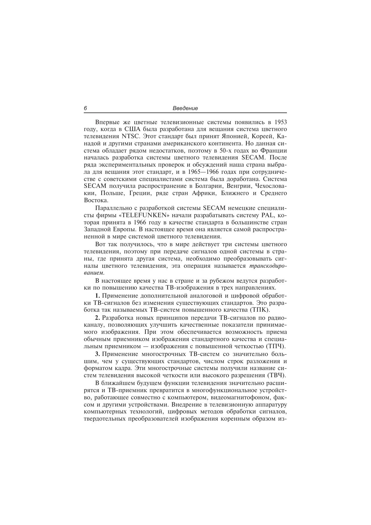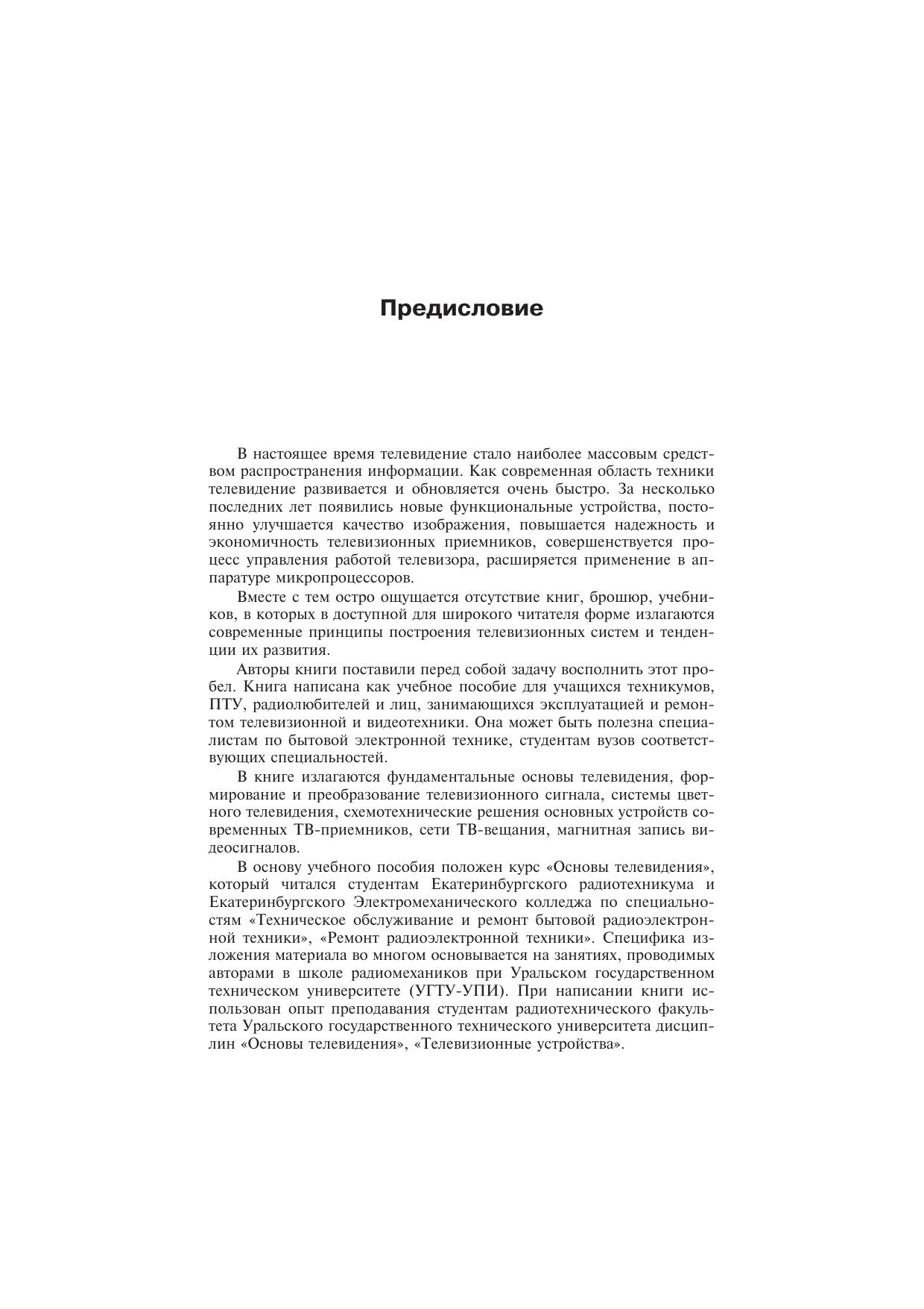 В учебном пособии изложены физические основы телевидения, формирование и преобразование телевизионного сигнала, системы цветного телевидения, схемотехнические решения основных устройств телевизионных приемников, сети ТВ-вещания, магнитная запись видеосигналов.Для учащихся техникумов, ПТУ, радиолюбителей и лиц, занимающихся эксплуатацией и ремонтом телевизионной техники.