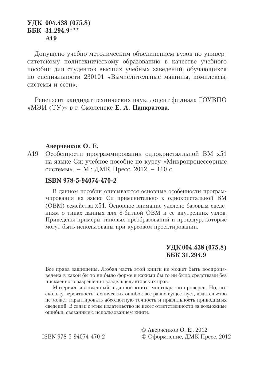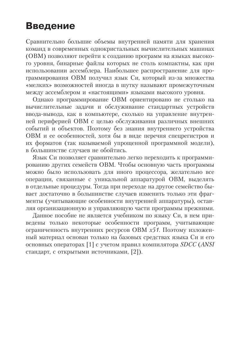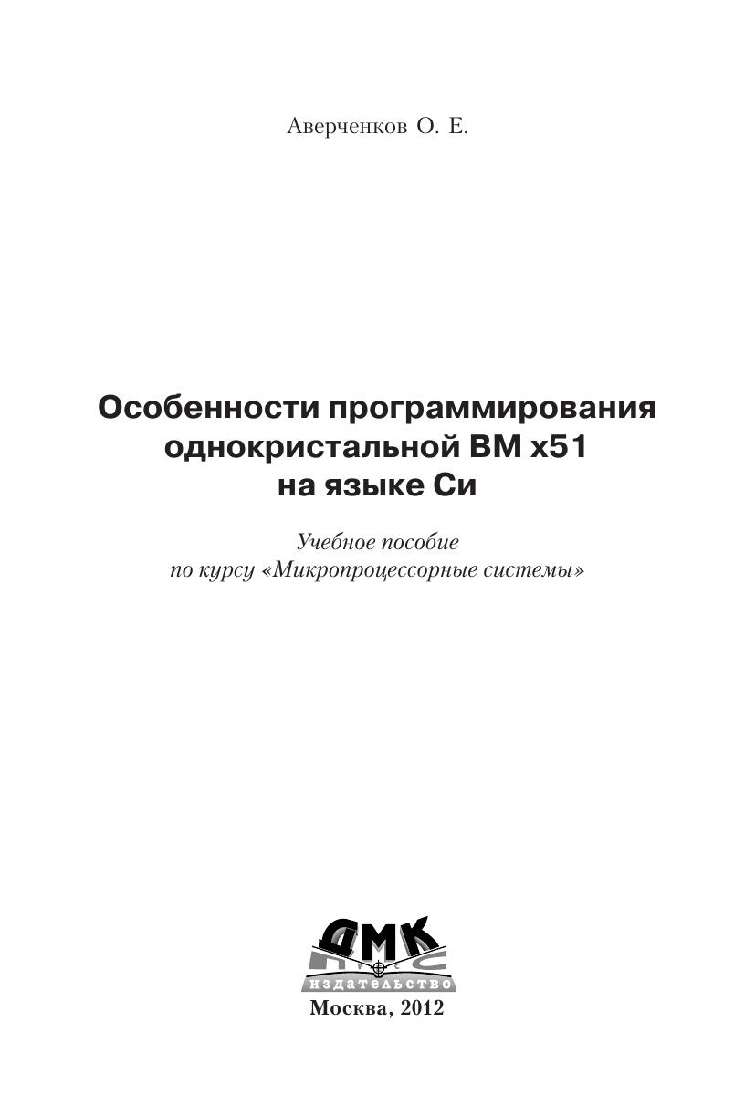 В данном пособии описываются основные особенности программирования на языке Си применительно к однокристальной ВМ (ОВМ) семейства х51. Основное внимание уделено базовым сведениям о типах данных для 8-битной ОВМ и ее внутренних узлов. Приведены примеры типовых преобразований и процедур, которые могут быть использованы при курсовом проектировании.