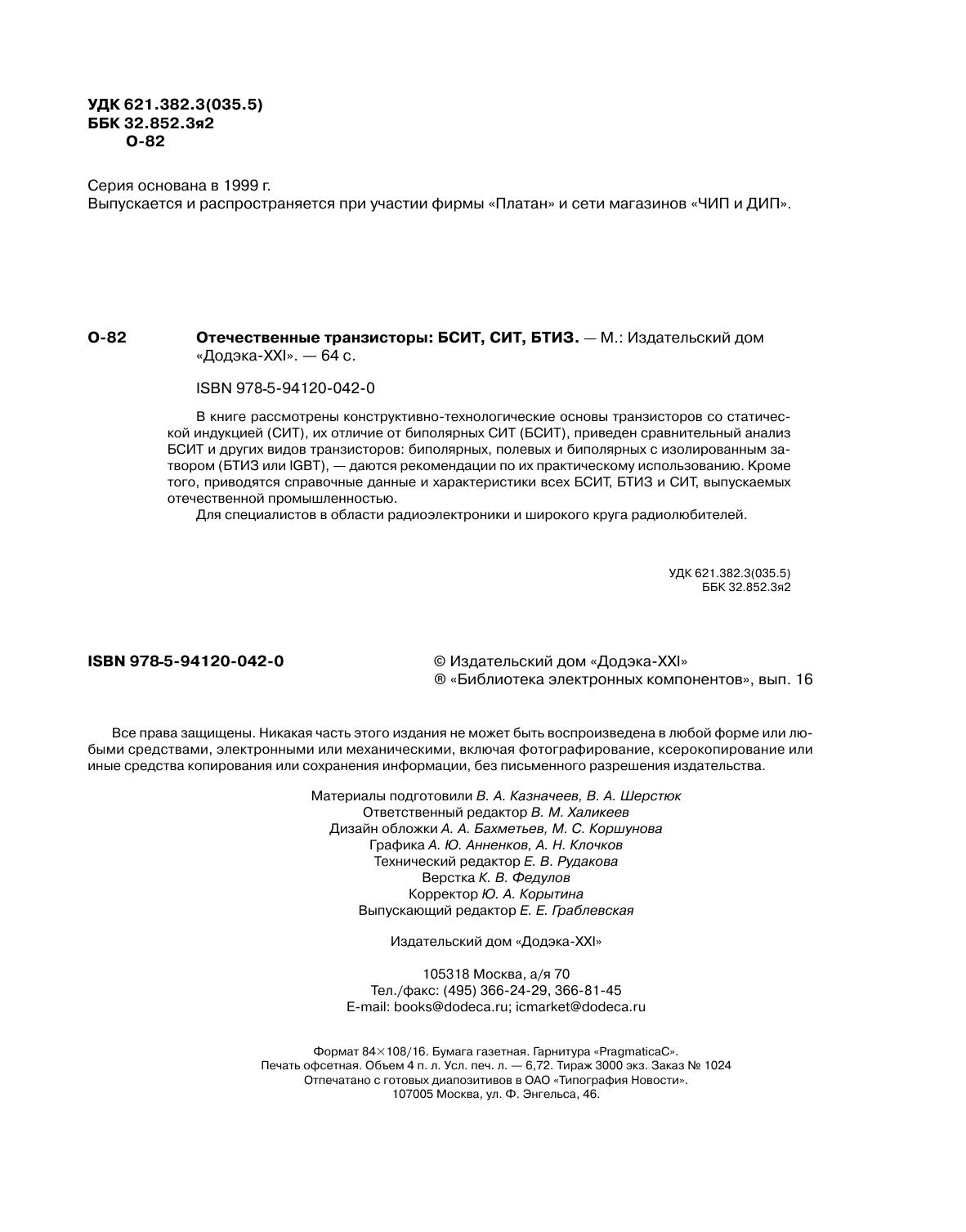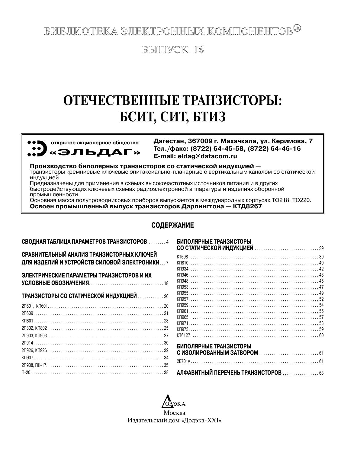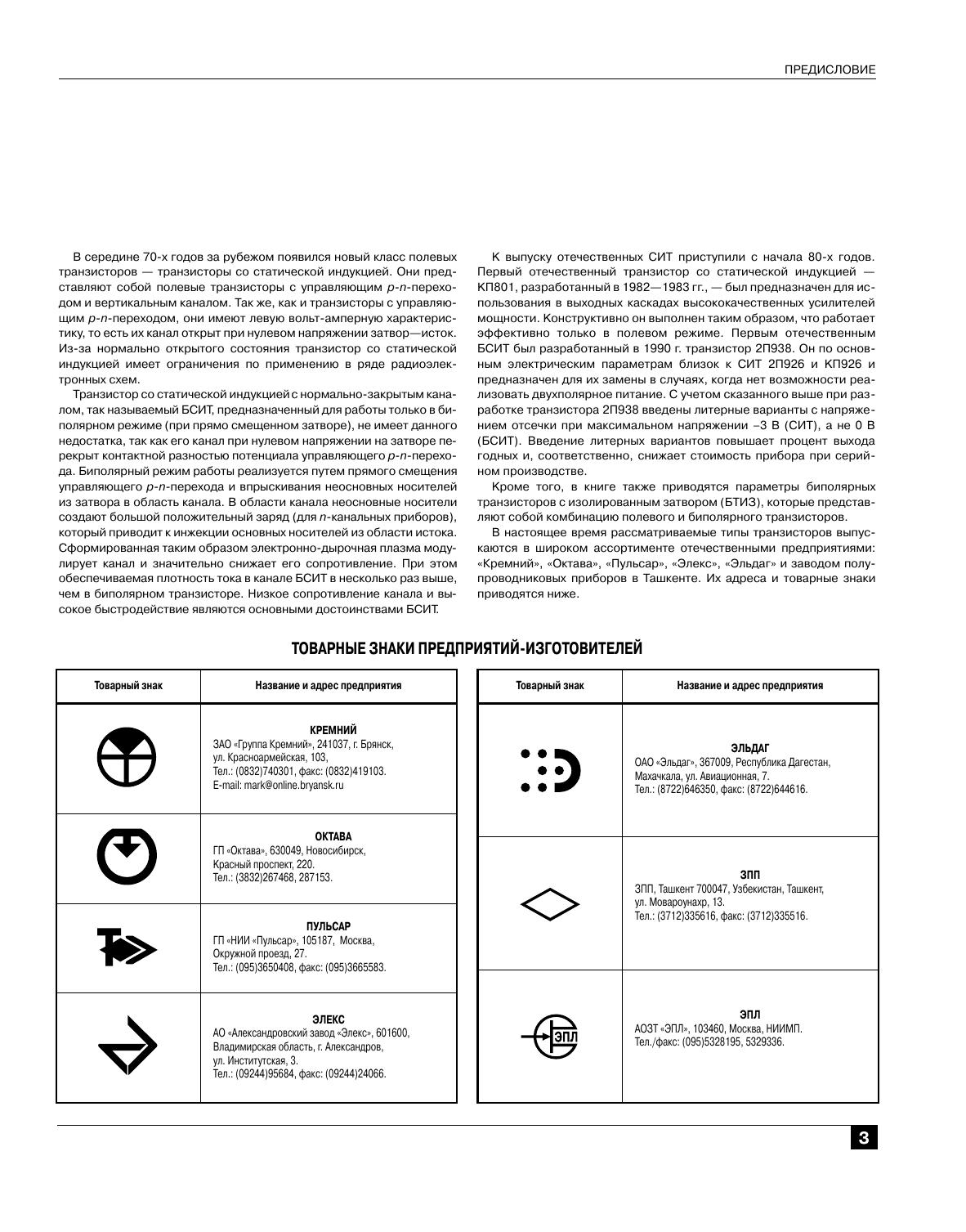 В книге рассмотрены конструктивно-технологические основы транзисторов со статической индукцией (СИТ), их отличие от биполярных СИТ (БСИТ), приведен сравнительный анализ БСИТ и других видов транзисторов: биполярных, полевых и биполярных с изолированным затвором (БТИЗ или IGBT), — даются рекомендации по их практическому использованию. Kроме того, приводятся справочные данные и характеристики всех БСИТ, БТИЗ и СИТ, выпускаемых отечественной промышленностью. Для специалистов в области радиоэлектроники и широкого круга радиолюбителей.