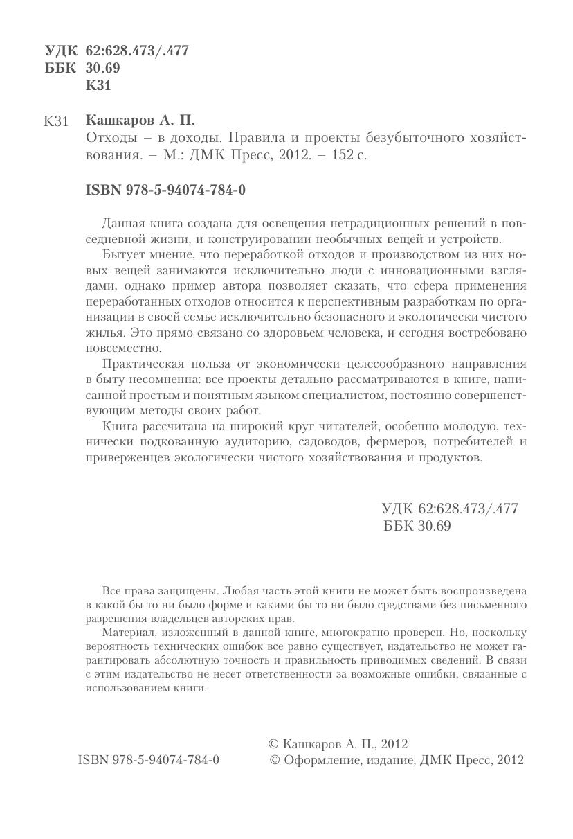 Данная книга создана для освещения нетрадиционных решений в повседневной жизни, и конструировании необычных вещей и устройств.Бытует мнение, что переработкой отходов и производством из них новых вещей занимаются исключительно люди с инновационными взглядами, однако пример автора позволяет сказать, что сфера применения переработанных отходов относится к перспективным разработкам по организации в своей семье исключительно безопасного и экологически чистого жилья. Это прямо связано со здоровьем человека, и сегодня востребовано повсеместно. Практическая польза от экономически целесообразного направления в быту несомненна: все проекты детально рассматриваются в книге, написанной простым и понятным языком специалистом, постоянно совершенствующим методы своих работ. Книга рассчитана на широкий круг читателей, особенно молодую, технически подкованную аудиторию, садоводов, фермеров, потребителей и приверженцев экологически чистого хозяйствования и продуктов.