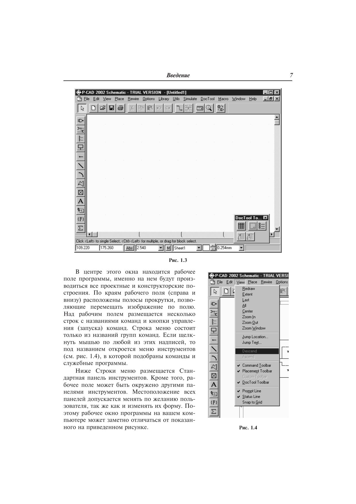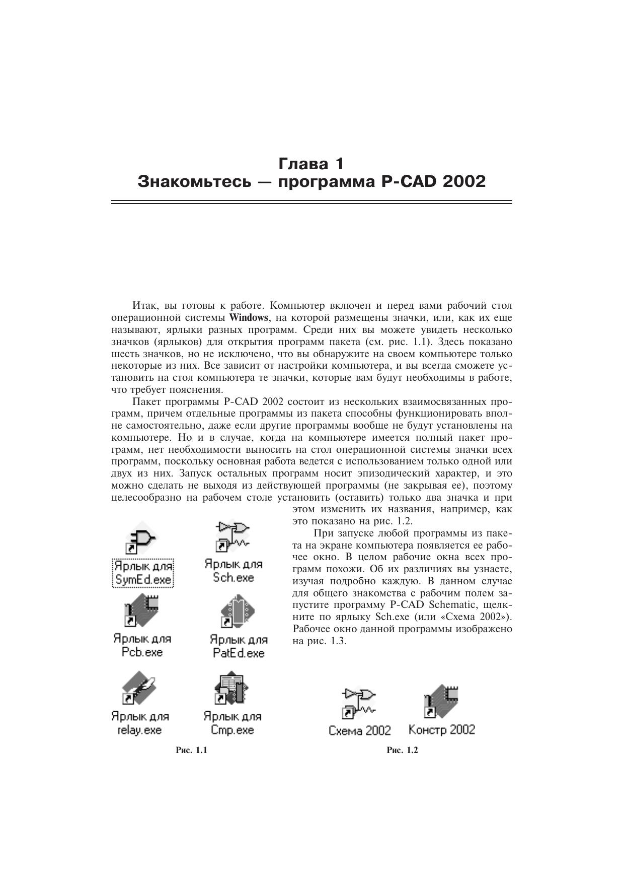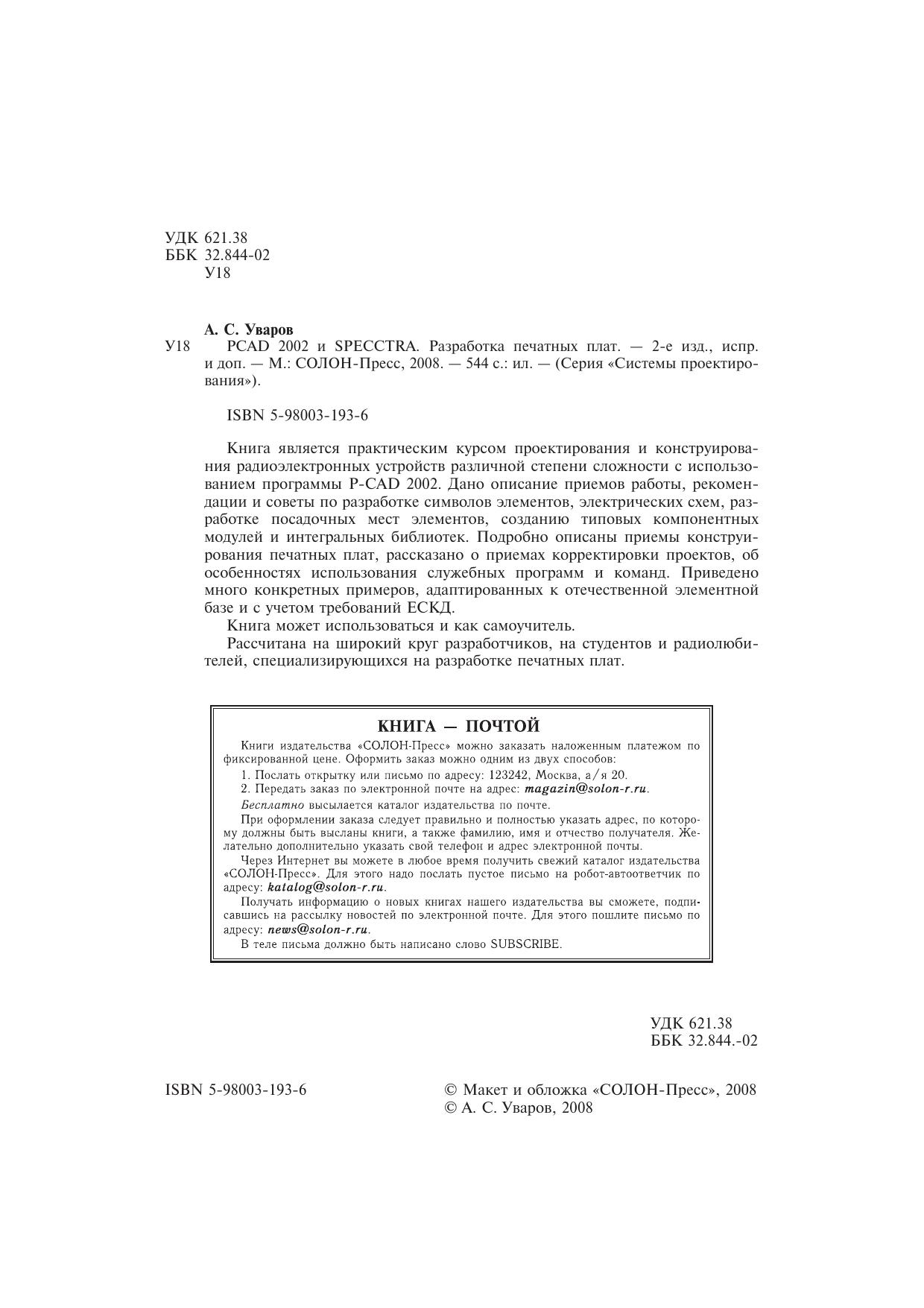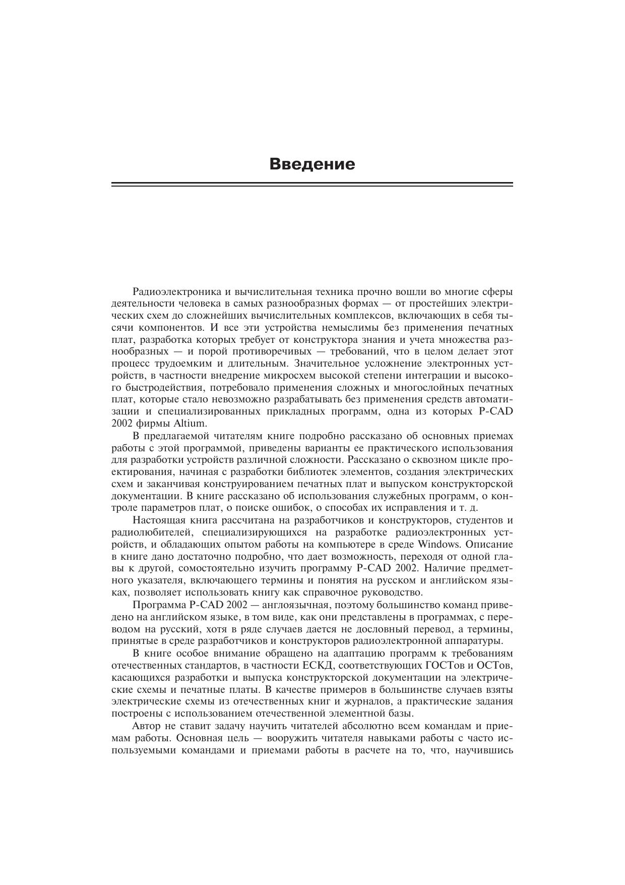 Книга является практическим курсом проектирования и конструирования радиоэлектронных устройств различной степени сложности с использованием программы P-CAD 2002. Дано описание приемов работы, рекомендации и советы по разработке символов элементов, электрических схем, разработке посадочных мест элементов, созданию типовых компонентных модулей и интегральных библиотек. Подробно описаны приемы конструирования печатных плат, рассказано о приемах корректировки проектов, об особенностях использования служебных программ и команд. Приведено много конкретных примеров, адаптированных к отечественной элементной базе и с учетом требований ЕСКД.Книга может использоваться и как самоучитель.Рассчитана на широкий круг разработчиков, на студентов и радиолюбителей, специализирующихся на разработке печатных плат.