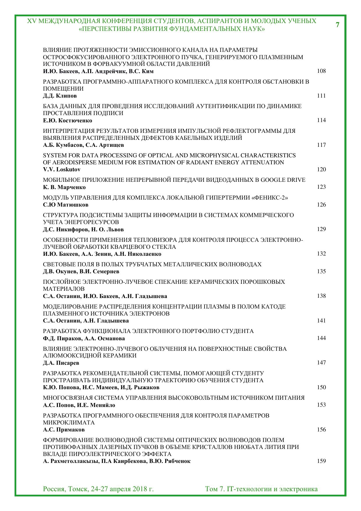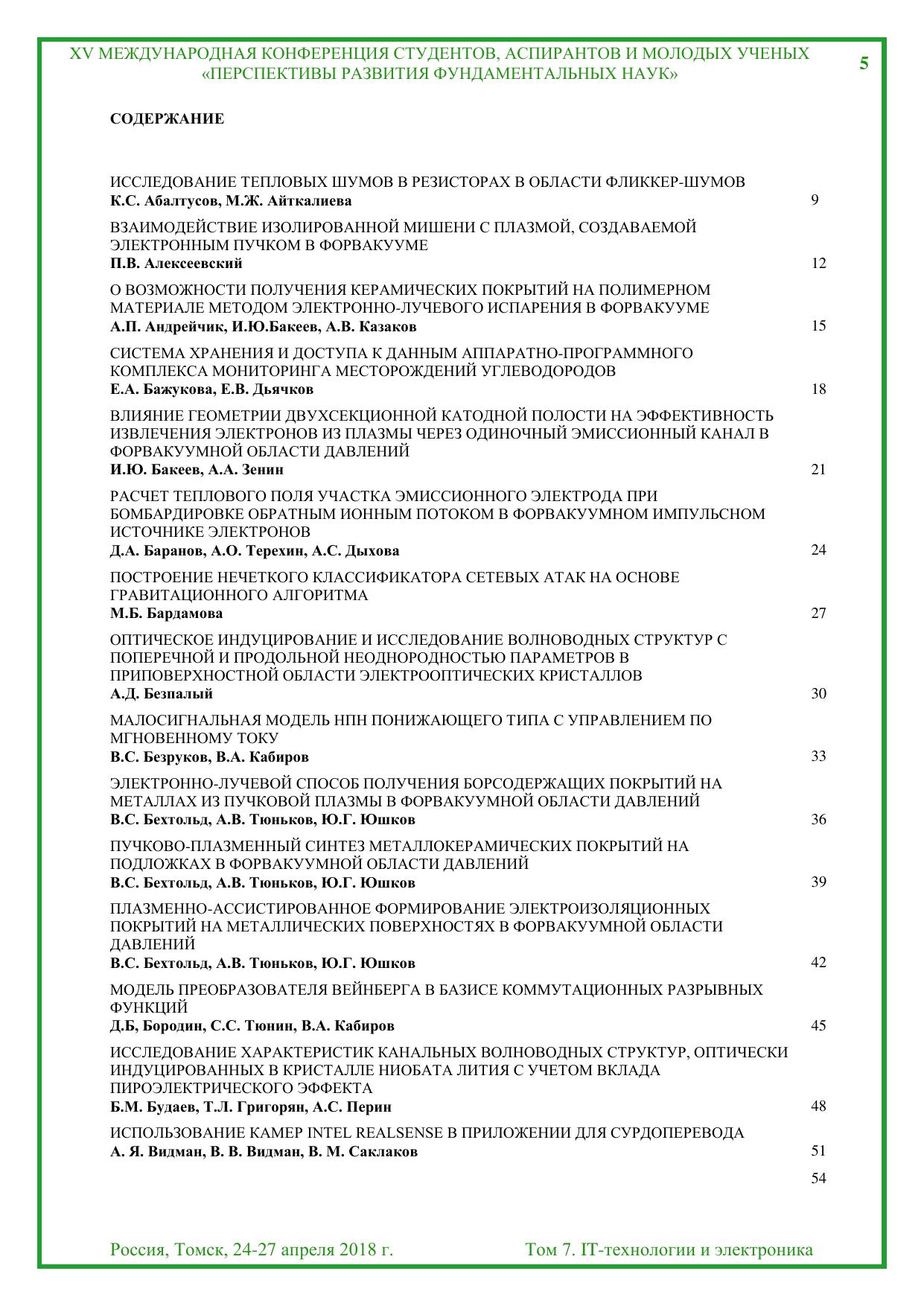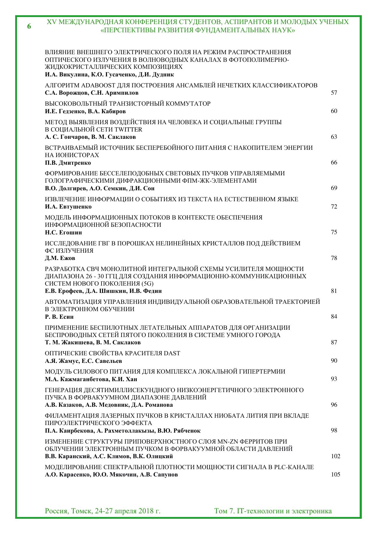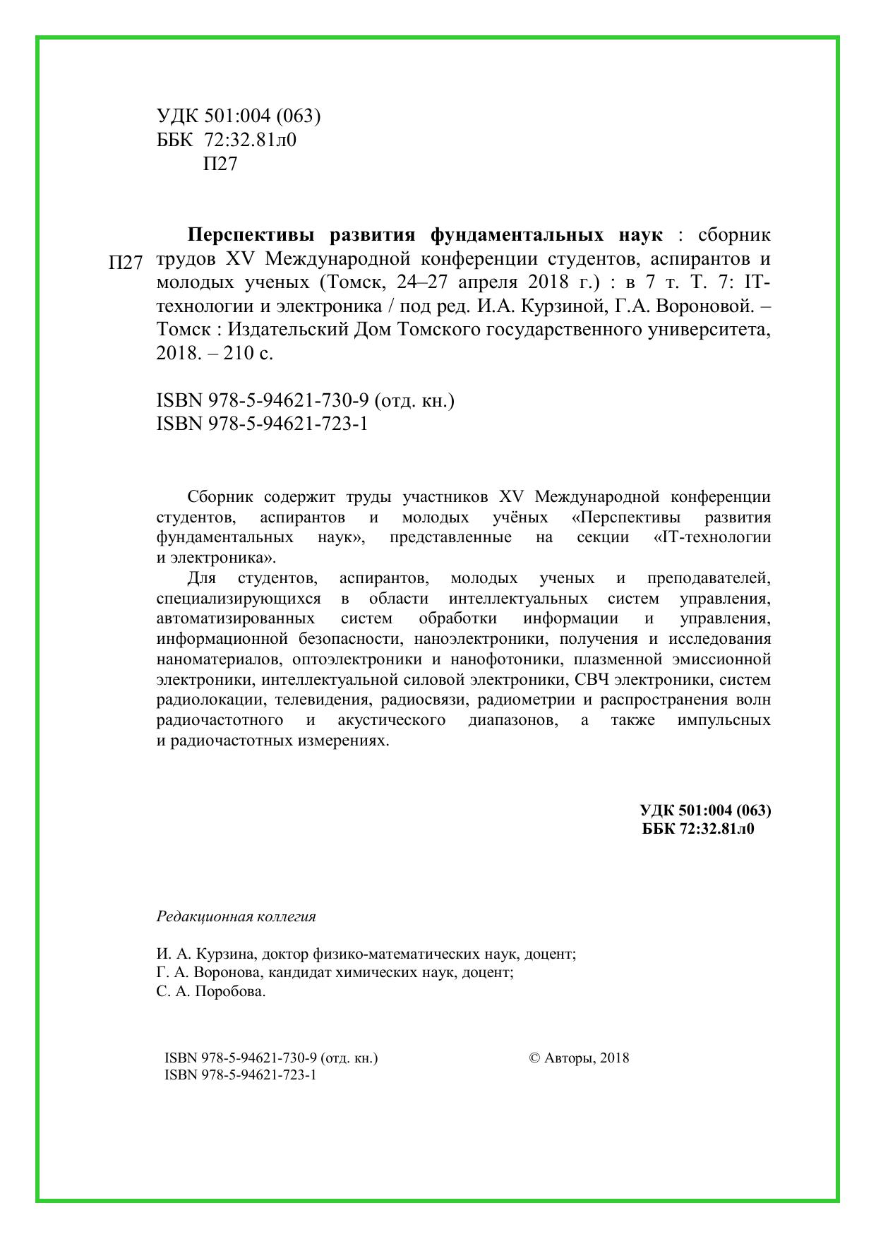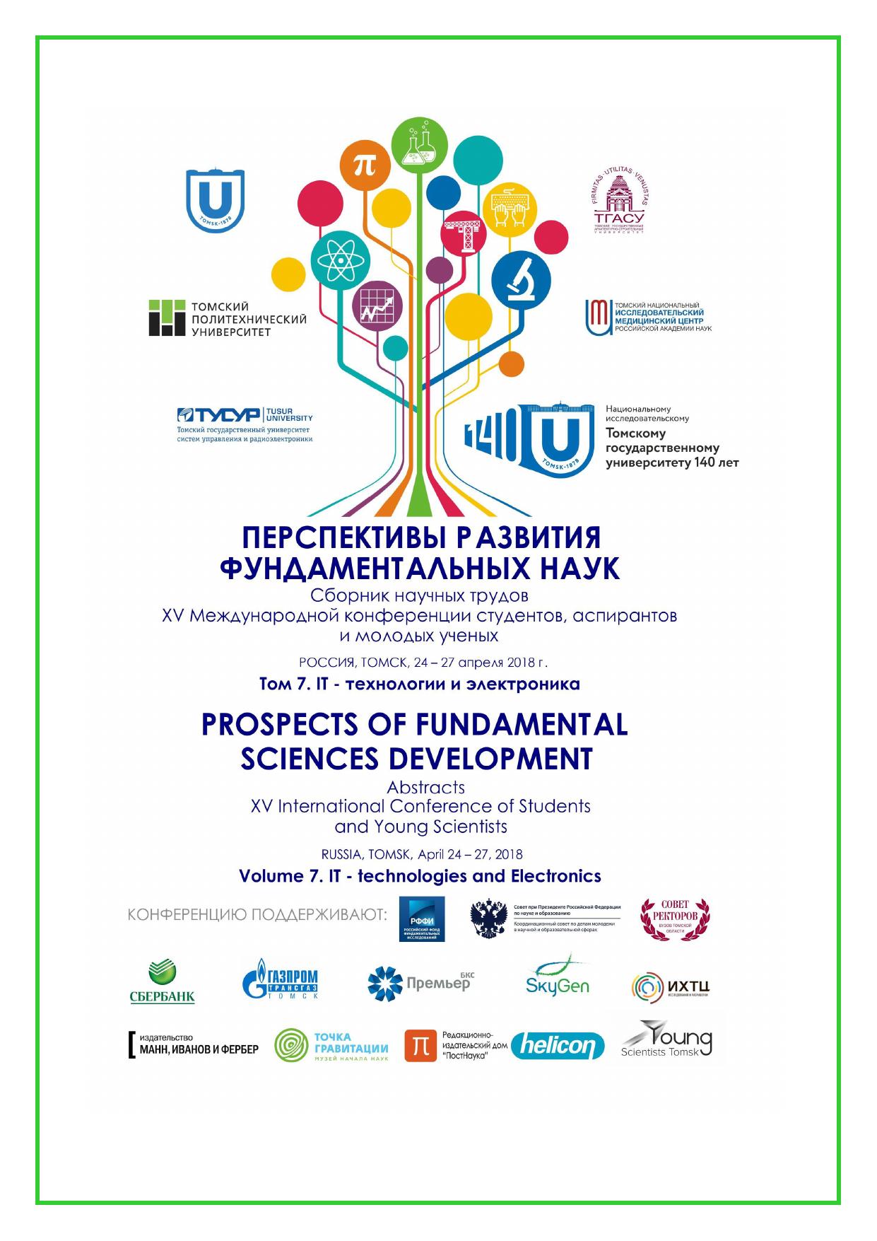 Сборник содержит труды участников XV Международной конференции студентов, аспирантов и молодых учёных «Перспективы развития фундаментальных наук», представленные на секции «IT-технологии и электроника». Для студентов, аспирантов, молодых ученых и преподавателей,специализирующихся в области интеллектуальных систем управления, автоматизированных систем обработки информации и управления, информационной безопасности, наноэлектроники, получения и исследования наноматериалов, оптоэлектроники и нанофотоники, плазменной эмиссионной электроники, интеллектуальной силовой электроники, СВЧ электроники, систем радиолокации, телевидения, радиосвязи, радиометрии и распространения волн радиочастотного и акустического диапазонов, а также импульсных и радиочастотных измерениях.