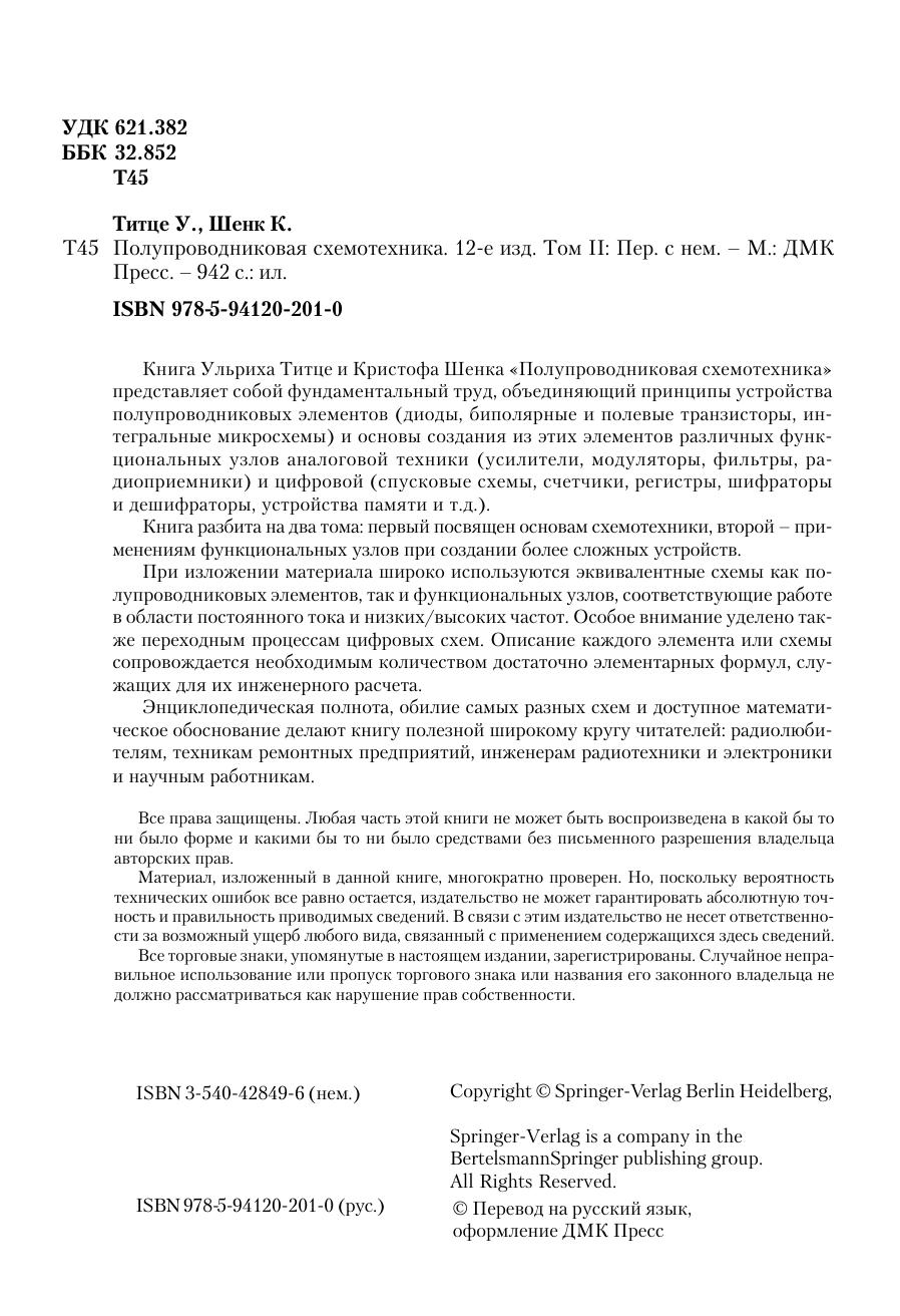 Книга Ульриха Титце и Кристофа Шенка «Полупроводниковая схемотехника» представляет собой фундаментальный труд, объединяющий принципы устройства полупроводниковых элементов (диоды, биполярные и полевые транзисторы, интегральные микросхемы) и основы создания из этих элементов различных функциональных узлов аналоговой техники (усилители, модуляторы, фильтры, радиоприемники) и цифровой (спусковые схемы, счетчики, регистры, шифраторы и дешифраторы, устройства памяти и т.д.). Книга разбита на два тома: первый посвящен основам схемотехники, второй – применениям функциональных узлов при создании более сложных устройств. При изложении материала широко используются эквивалентные схемы как полупроводниковых элементов, так и функциональных узлов, соответствующие их работе в области постоянного и переменного тока. Особое внимание уделено также переходным процессам цифровых схем. Описание каждого элемента или схемы сопровождается необходимым количеством достаточно элементарных формул, служащих для их инженерного расчета. Энциклопедическая полнота, обилие самых разных схем и доступное математическое обоснование делают книгу полезной широкому кругу читателей: радиолюбителям, инженерам радиотехники и электроники и научным работникам.
