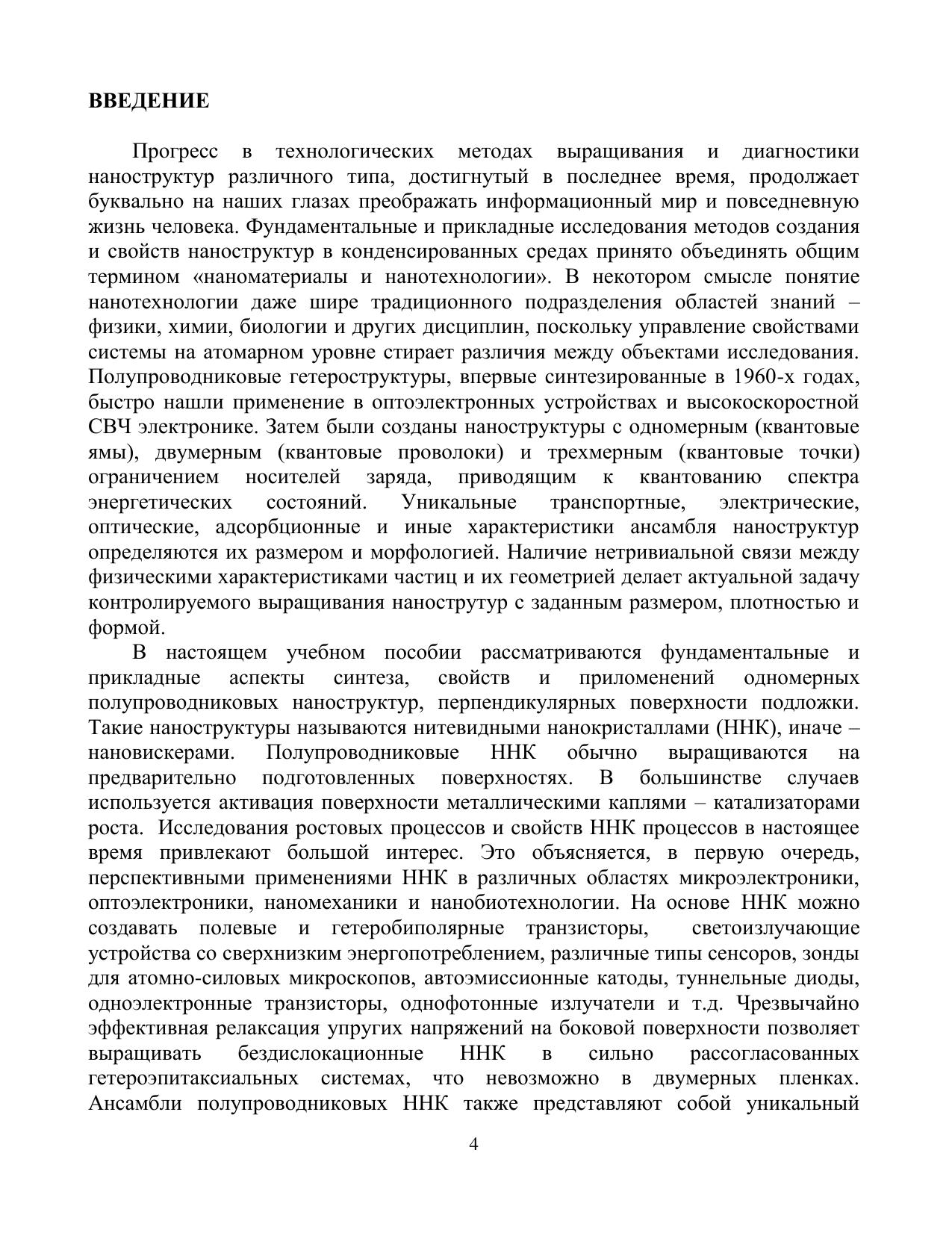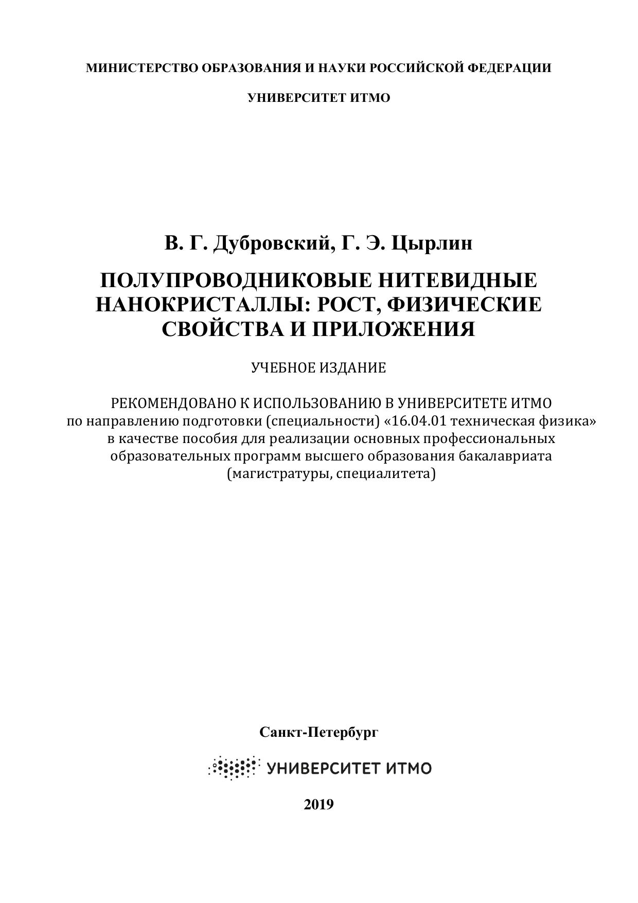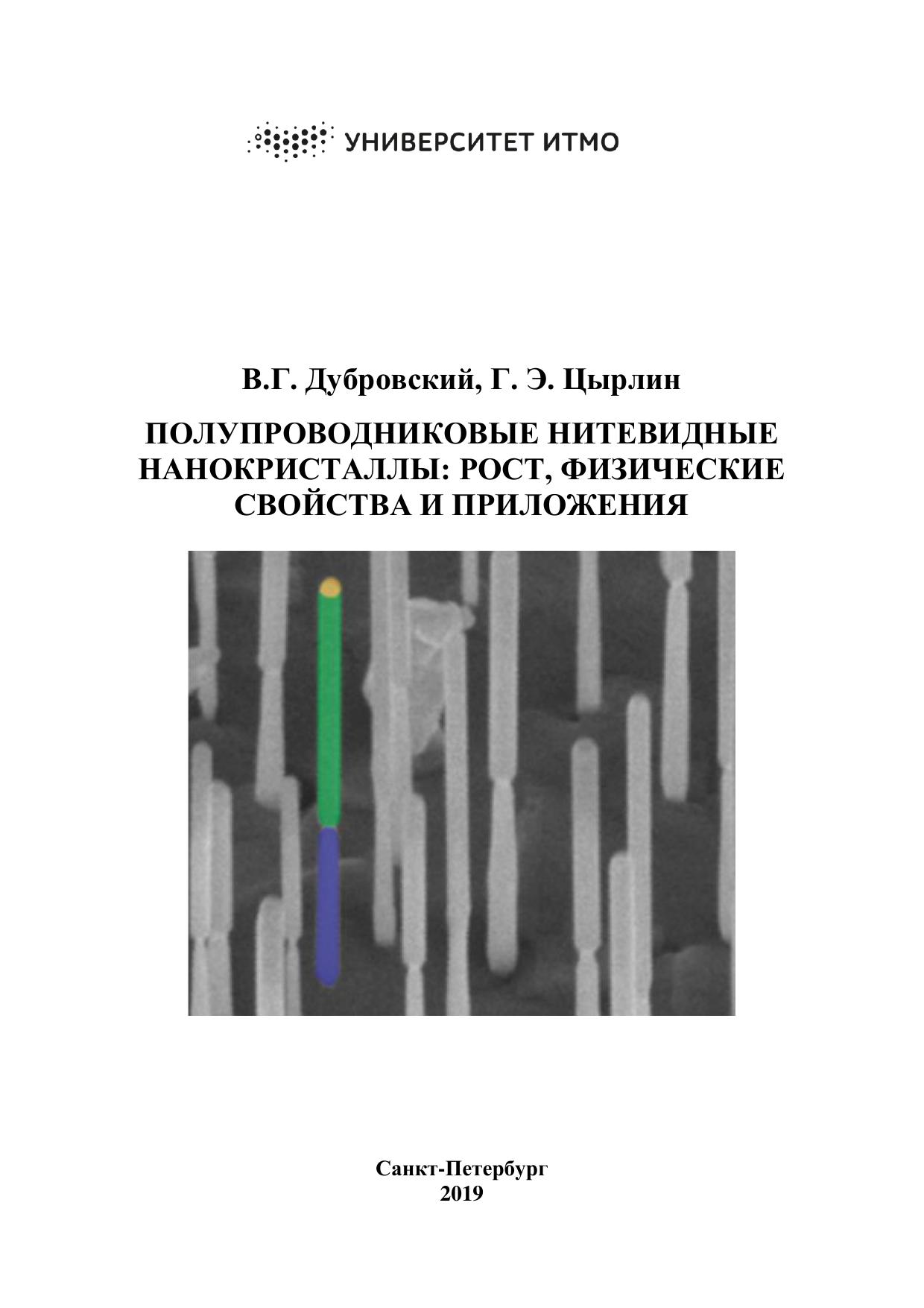 В настоящем учебном пособии дано введение в современное состояние исследований полупроводниковых нитевидных нанокристаллов (ННК), в особенности, ННК полупроводниковых соединений III-V. Изложены физические основы выращивания ННК по механизму «пар-жидкость-кристалл» и основные эпитаксиальные технологии синтеза ННК. Детально рассмотрены термодинамические и кинетические факторы, определяющие морфологические свойства, состав и кристаллическую структуру ННК. Изложены основные теоретические модели роста и структуры ННК. Приведены данные по физическим свойствам ННК и возможностям их применений в нанофотонике, наноэлектронике и нанобиотехнологии. Учебное пособие предназначено для магистров, обучающихся по направлению подготовки «16.01.04 техническая физика»