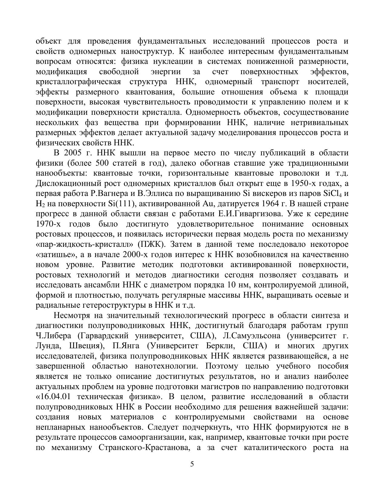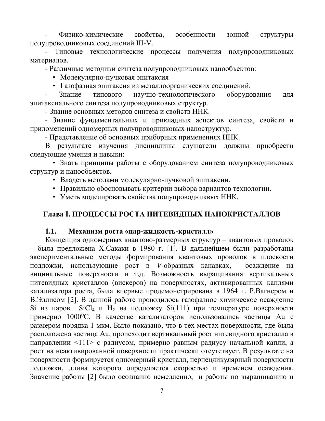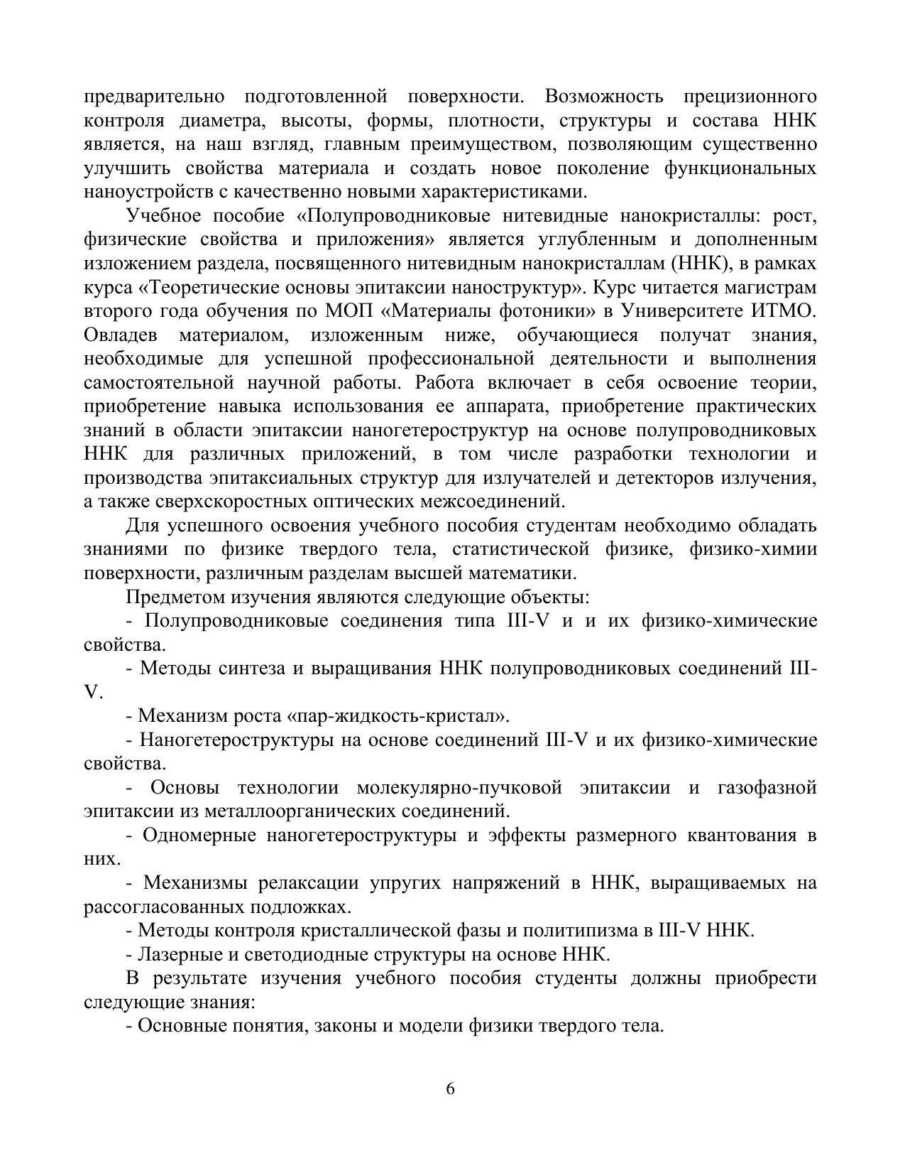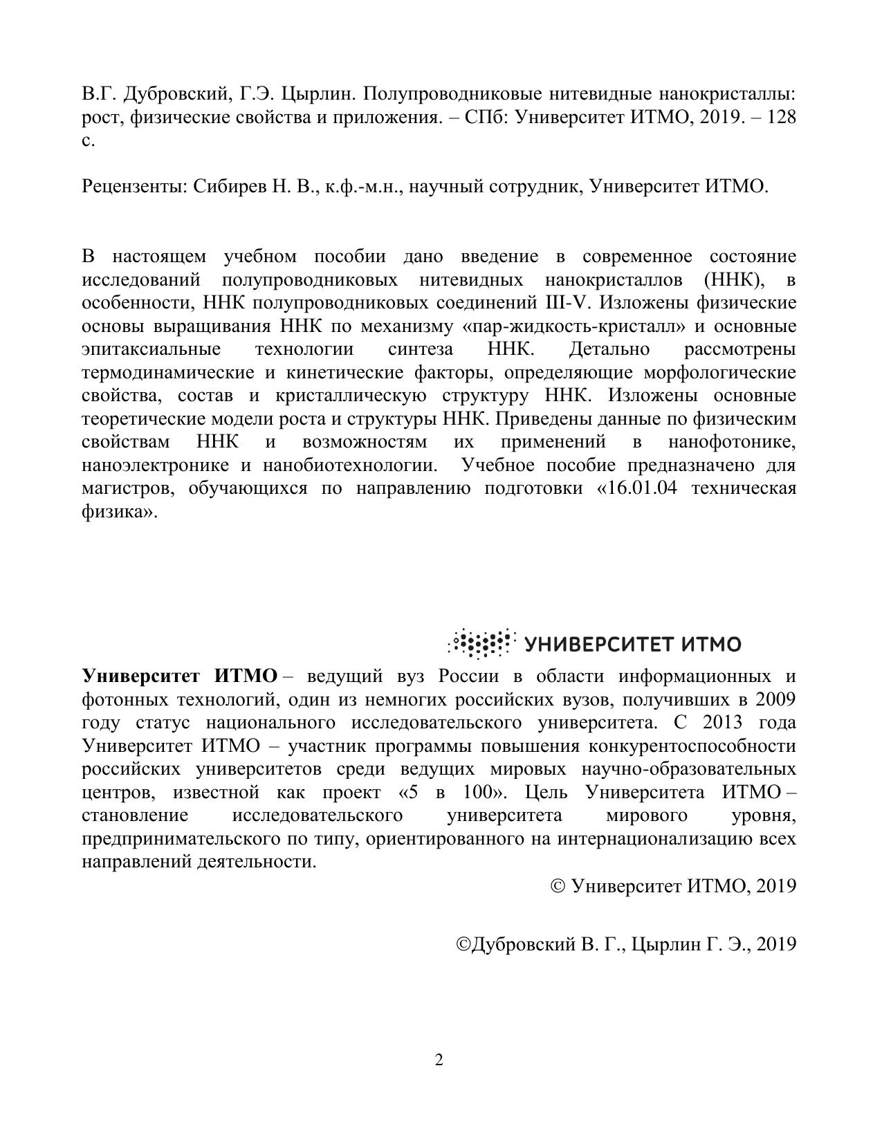 В настоящем учебном пособии дано введение в современное состояние исследований полупроводниковых нитевидных нанокристаллов (ННК), в особенности, ННК полупроводниковых соединений III-V. Изложены физические основы выращивания ННК по механизму «пар-жидкость-кристалл» и основные эпитаксиальные технологии синтеза ННК. Детально рассмотрены термодинамические и кинетические факторы, определяющие морфологические свойства, состав и кристаллическую структуру ННК. Изложены основные теоретические модели роста и структуры ННК. Приведены данные по физическим свойствам ННК и возможностям их применений в нанофотонике, наноэлектронике и нанобиотехнологии. Учебное пособие предназначено для магистров, обучающихся по направлению подготовки «16.01.04 техническая физика»