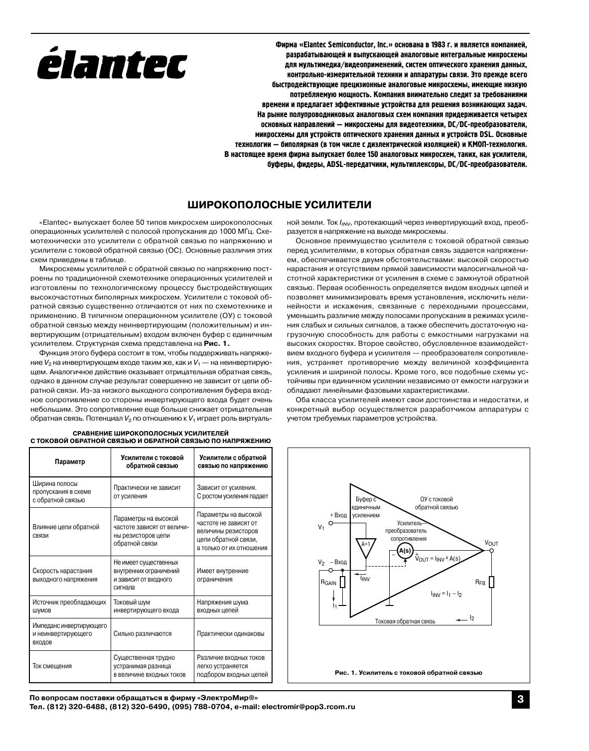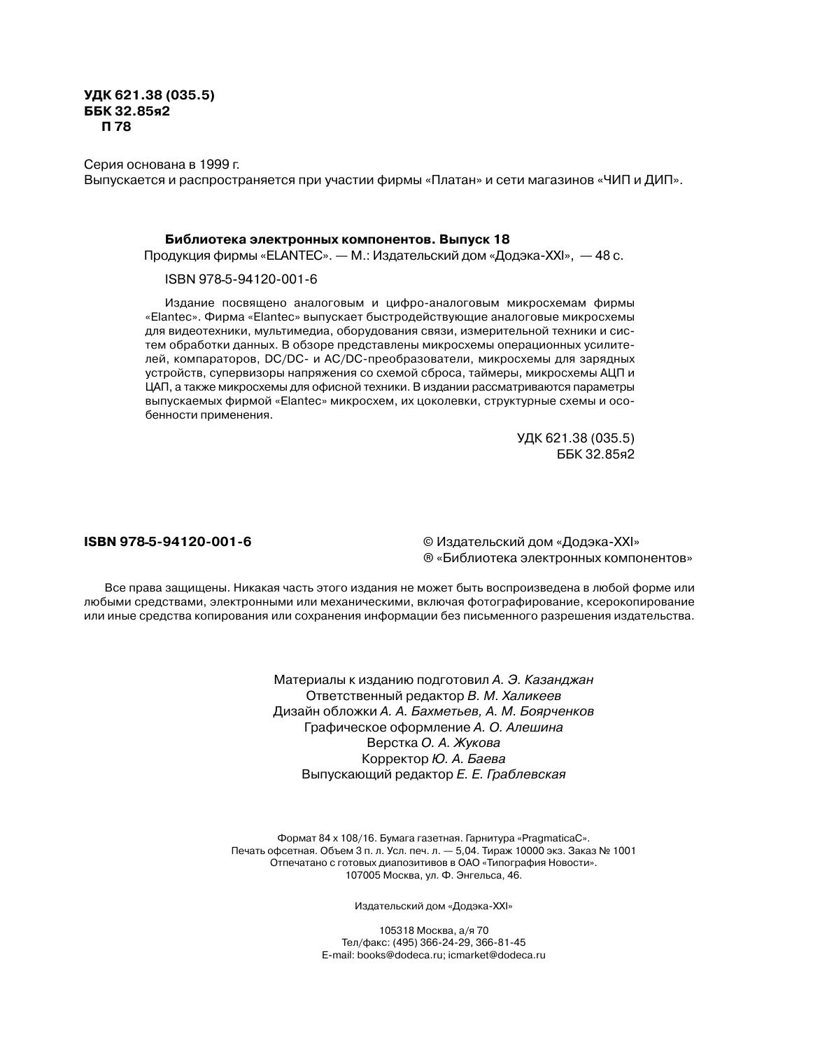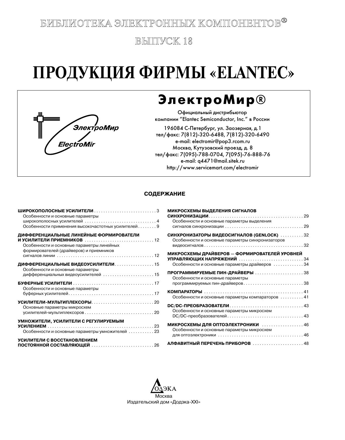 Издание посвящено аналоговым и цифро аналоговым микросхемам фирмы «Elantec». Фирма «Elantec» выпускает быстродействующие аналоговые микросхемы для видеотехники, мультимедиа, оборудования связи, измерительной техники и систем обработки данных. В обзоре представлены микросхемы операционных усилителей, компараторов, DC/DC и AC/DC преобразователи, микросхемы для зарядных устройств, супервизоры напряжения со схемой сброса, таймеры, микросхемы АЦП и ЦАП, а также микросхемы для офисной техники. В издании рассматриваются параметры выпускаемых фирмой «Elantec» микросхем, их цоколевки, структурные схемы и особенности применения.