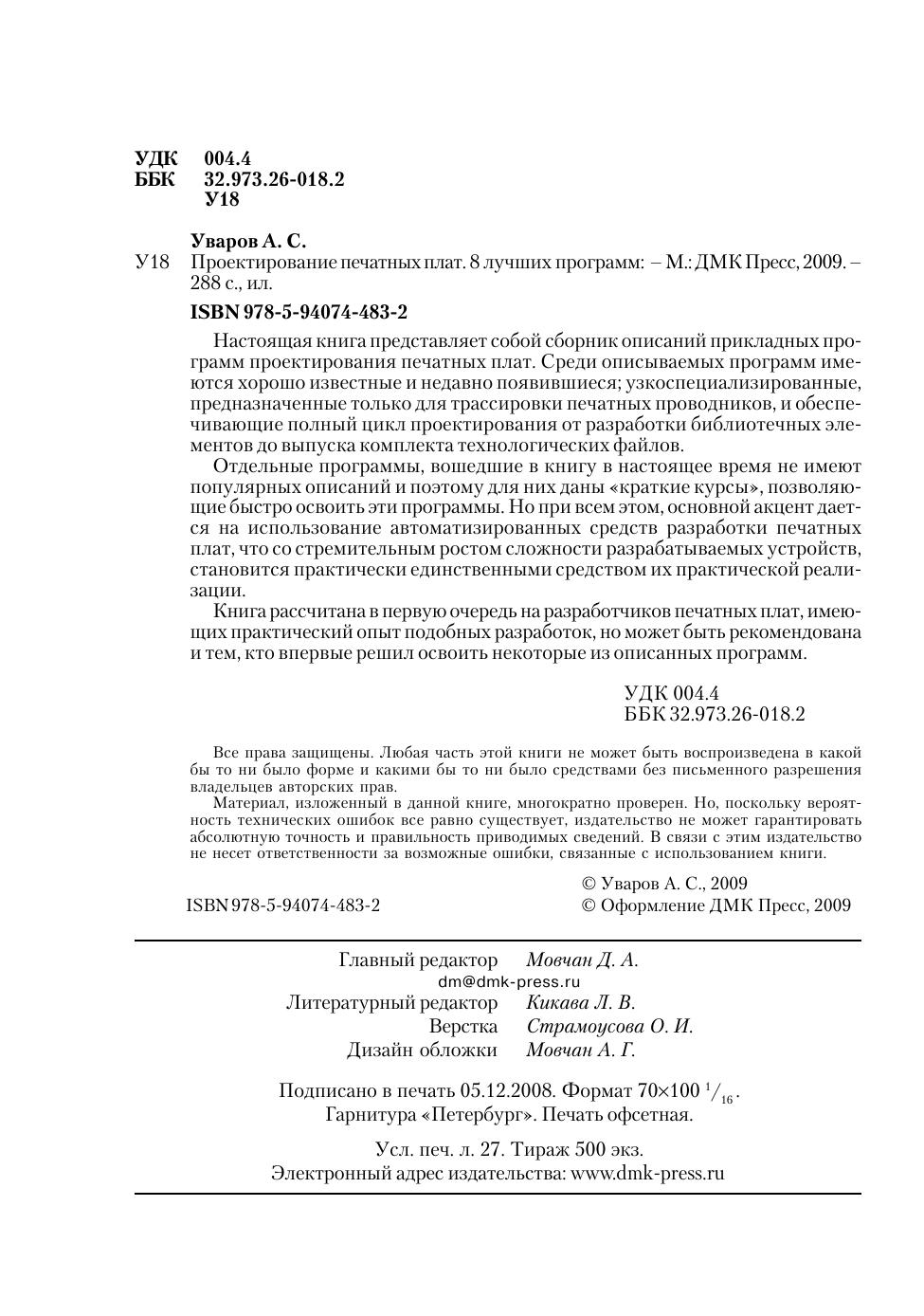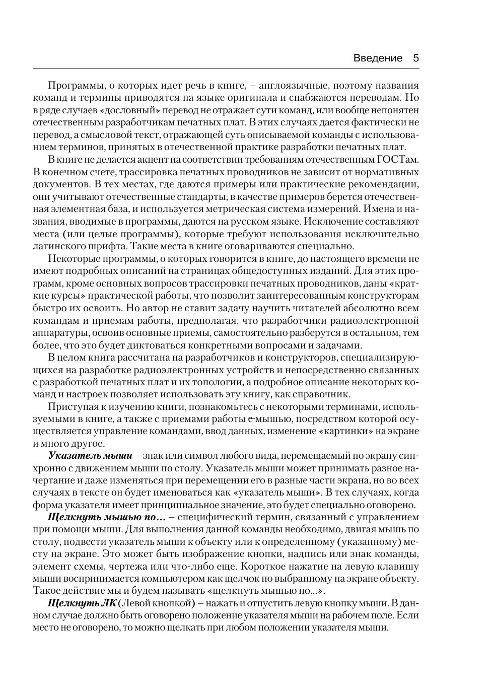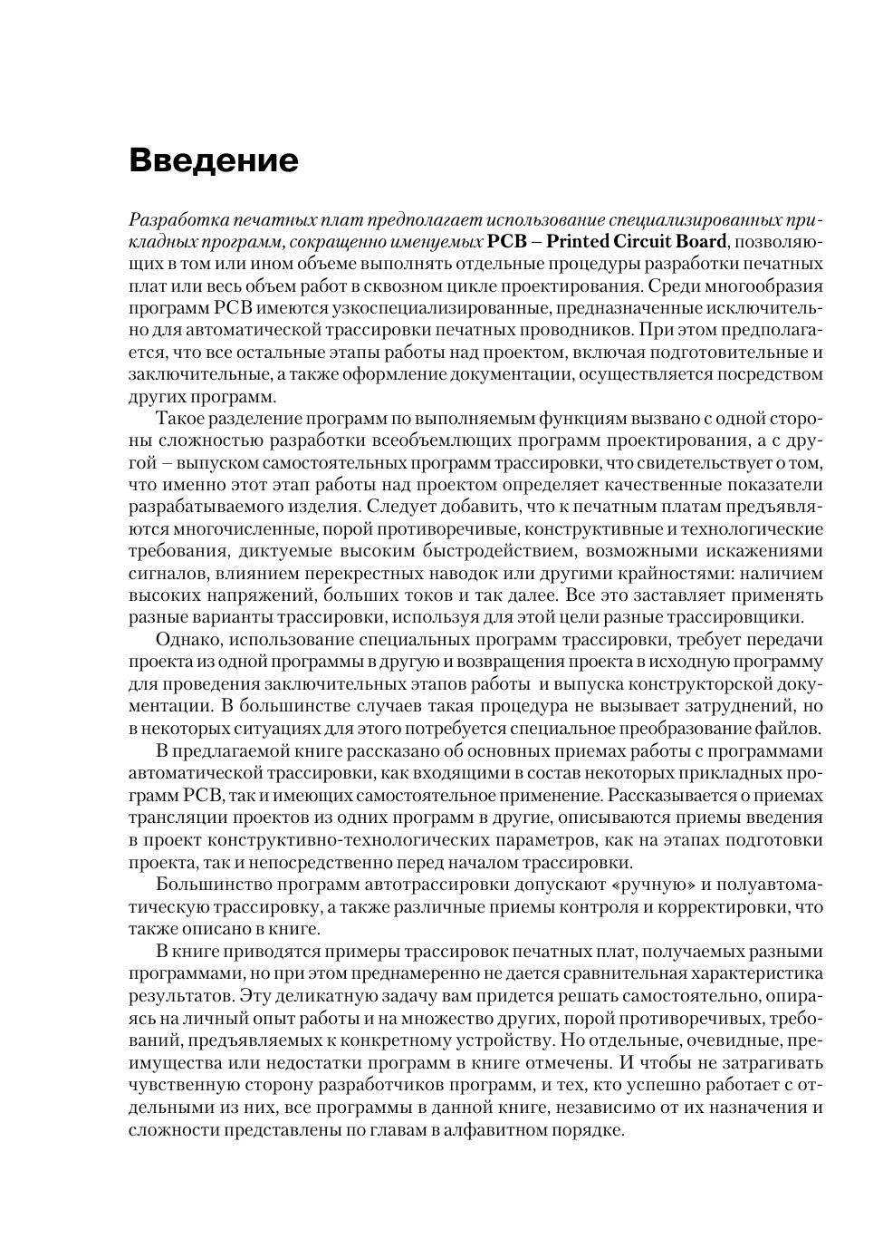 Настоящая книга представляет собой сборник описаний прикладных программ проектирования печатных плат. Среди описываемых программ имеются хорошо известные и недавно появившиеся, узкоспециализированные, предназначенные только для трассировки печатных проводников, и обеспечивающие полный цикл проектирования от разработки библиотечных элементов до выпуска комплекта технологических файлов. Отдельные программы, вошедшие в книгу в настоящее время не имеют популярных описаний и поэтому для них даны «краткие курсы», позволяющие быстро освоить эти программы. Но при всем этом, основной акцент дается на использование автоматизированных средств разработки печатных плат, что со стремительным ростом сложности разрабатываемых устройств, становится практически единственными средством их практической реализации. Книга рассчитана в первую очередь на разработчиков печатных плат, имеющих практический опыт подобных разработок, но может быть рекомендована и тем, кто впервые решил освоить некоторые из описанных программ.