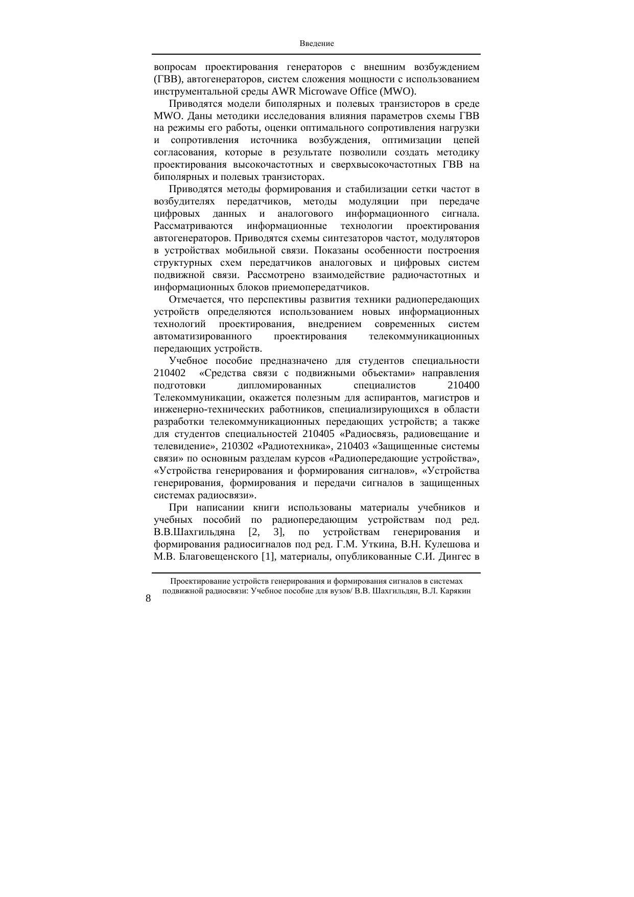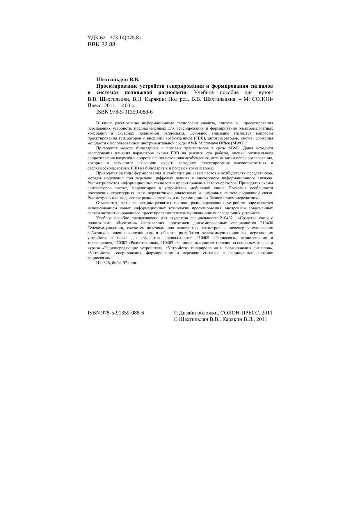 В книге рассмотрены информационные технологии анализа, синтеза и проектирования передающих устройств, предназначенных для генерирования и формирования электромагнитных колебаний в системах подвижной радиосвязи. Основное внимание уделяется вопросам проектирования генераторов с внешним возбуждением (ГВВ), автогенераторов, систем сложения мощности с использованием инструментальной среды AWR Мicrowave Office (MWO).Приводятся модели биполярных и полевых транзисторов в среде MWO. Даны методики исследования влияния параметров схемы ГВВ на режимы его работы, оценки оптимального сопротивления нагрузки и сопротивления источника возбуждения, оптимизации цепей согласования, которые в результате позволили создать методику проектирования высокочастотных и сверхвысокочастотных ГВВ на биполярных и полевых транзисторах.Приводятся методы формирования и стабилизации сетки частот в возбудителях передатчиков, методы модуляции при передаче цифровых данных и аналогового информационного сигнала. Рассматриваются информационные технологии проектирования автогенераторов. Приводятся схемы синтезаторов частот, модуляторов в устройствах мобильной связи. Показаны особенности построения структурных схем передатчиков аналоговых и цифровых систем подвижной связи. Рассмотрено взаимодействие радиочастотных и информационных блоков приемопередатчиков.Отмечается, что перспективы развития техники радиопередающих устройств определяются использованием новых информационных технологий проектирования, внедрением современных систем автоматизированного проектирования телекоммуникационных передающих устройств.Учебное пособие предназначено для студентов специальности 210402 «Средства связи с подвижными объектами» направления подготовки дипломированных специалистов 210400 Телекоммуникации, окажется полезным для аспирантов, магистров и инженерно-технических работников, специализирующихся в области разработки телекоммуникационных передающих устройств а также для студентов специальностей 210405 «Радиосвязь, радиовещание и телевидение», 210302 «Радиотехника», 210403 «Защищенные системы связи» по основным разделам курсов «Радиопередающие устройства», «Устройства генерирования и формирования сигналов», «Устройства генерирования, формирования и передачи сигналов в защищенных системах радиосвязи».