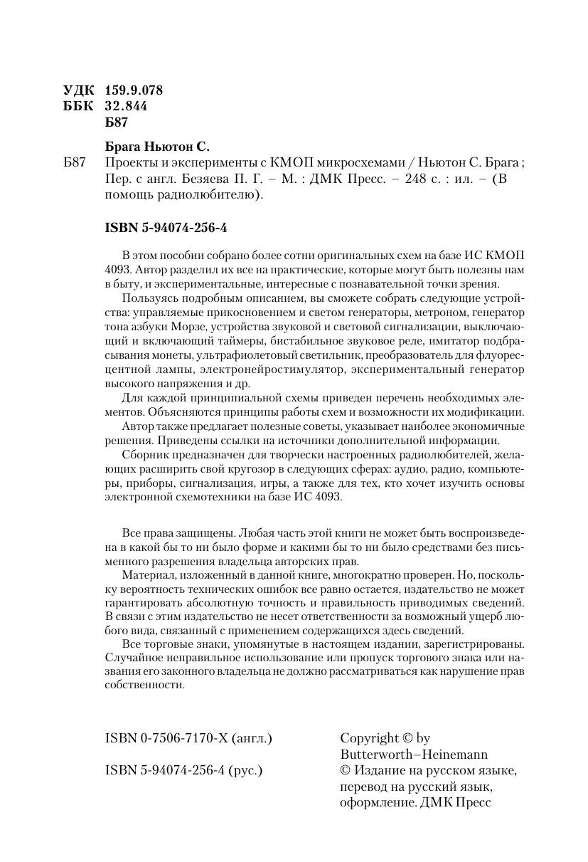 В этом пособии собрано более сотни оригинальных схем на базе ИС КМОП 4093. Автор разделил их все на практические, которые могут быть полезны нам в быту, и экспериментальные, интересные с познавательной точки зрения. Пользуясь подробным описанием, вы сможете собрать следующие устройства: управляемые прикосновением и светом генераторы, метроном, генератор тона азбуки Морзе, устройства звуковой и световой сигнализации, выключающий и включающий таймеры, бистабильное звуковое реле, имитатор подбрасывания монеты, ультрафиолетовый светильник, преобразователь для флуоресцентной лампы, электронейростимулятор, экспериментальный генератор высокого напряжения и др. Для каждой принципиальной схемы приведен перечень необходимых элементов. Объясняются принципы работы схем и возможности их модификации. Автор также предлагает полезные советы, указывает наиболее экономичные решения. Приведены ссылки на источники дополнительной информации.