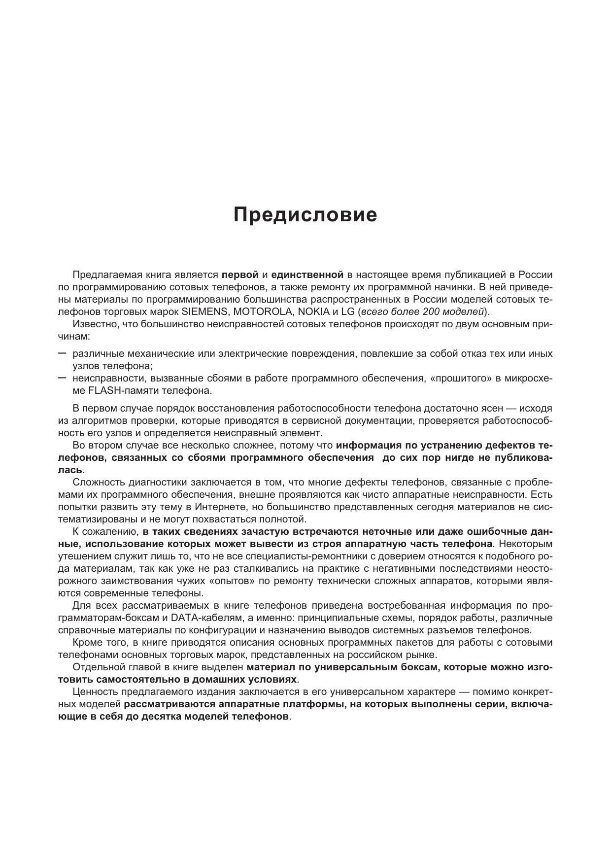 Предлагаемая книга является уникальной в своем роде - аналогов ей пока нет не только в России, но и в странах СНГ и Балтии.В пособии собраны материалы по программированию более 200 моделей сотовых телефонов торговых марок SIEMENS, MOTOROLA, NOKIA и LG.