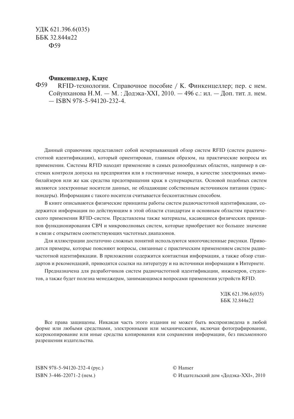 Данный справочник представляет собой исчерпывающий обзор систем RFID (систем радиочастотной идентификации), который ориентирован, главным образом, на практические вопросы их применения. Системы RFID находят применение в самых разнообразных областях, например в системах контроля допуска на предприятия или в гостиничные номера, в качестве электронных иммобилайзеров или же как средства предотвращения краж в супермаркетах. Основой подобных системявляются электронные носители данных, не обладающие собственным источником питания (транспондеры). Информация с такого носителя считывается бесконтактным способом. В книге описываются физические принципы работы систем радиочастотной идентификации, содержится информация по действующим в этой области стандартам и основным областям практического применения RFID-систем. Представлены также материалы, касающиеся физических принципов функционирования СВЧ и микроволновых систем, которые приобретают все большее значение в связи с открытием соответствующих частотных диапазонов. Для иллюстрации достаточно сложных понятий используются многочисленные рисунки. Приводятся примеры, которые поясняют вопросы, связанные с практическим применением систем радиочастотной идентификации. В приложении содержится контактная информация, а также обзор стандартов и рекомендаций, приводятся ссылки на литературу и на источники информации в Интернете. Предназначена для разработчиков систем радиочастотной идентификации, инженеров, студентов, а также будет полезна менеджерам, занимающимся вопросами применения устройств RFID.