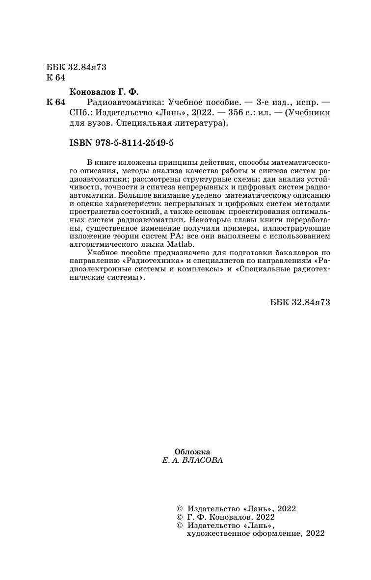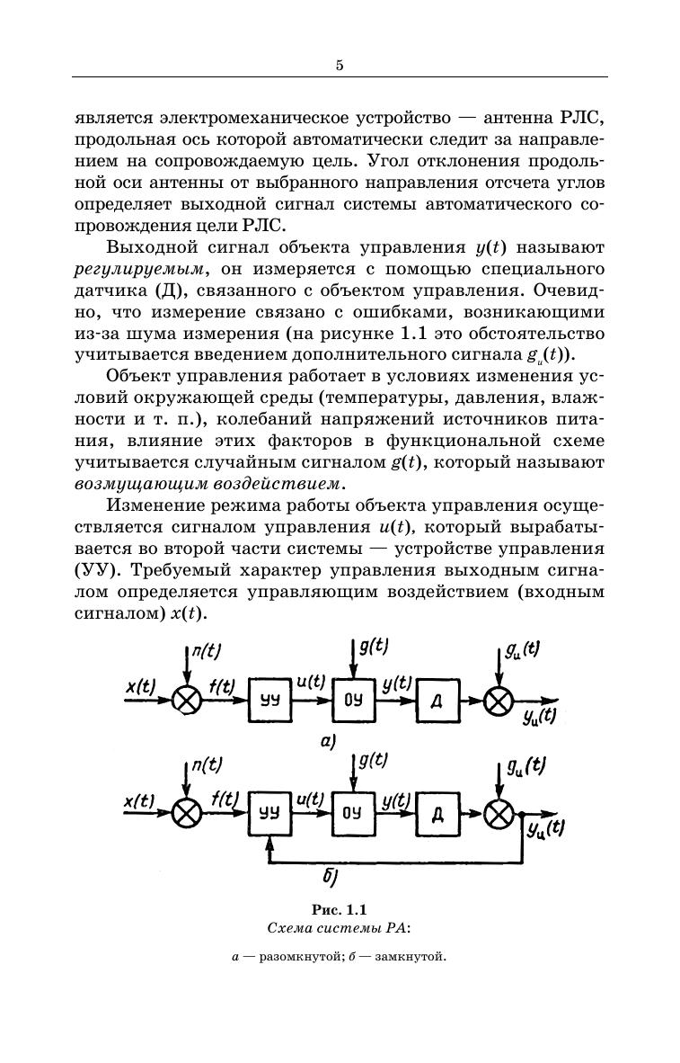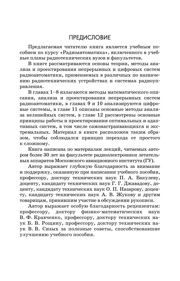 В книге изложены принципы действия, способы математического описания, методы анализа качества работы и синтеза систем радиоавтоматики, рассмотрены структурные схемы, дан анализ устойчивости, точности и синтеза непрерывных и цифровых систем радиоавтоматики. Большое внимание уделено математическому описанию и оценке характеристик непрерывных и цифровых систем методами пространства состояний, а также основам проектирования оптимальных систем радиоавтоматики. Некоторые главы книги переработаны, существенное изменение получили примеры, иллюстрирующие изложение теории систем РА: все они выполнены с использованием алгоритмического языка Matlab. Учебное пособие предназначено для подготовки бакалавров по направлению «Радиотехника» и специалистов по направлениям «Радиоэлектронные системы и комплексы» и «Специальные радиотехнические системы».