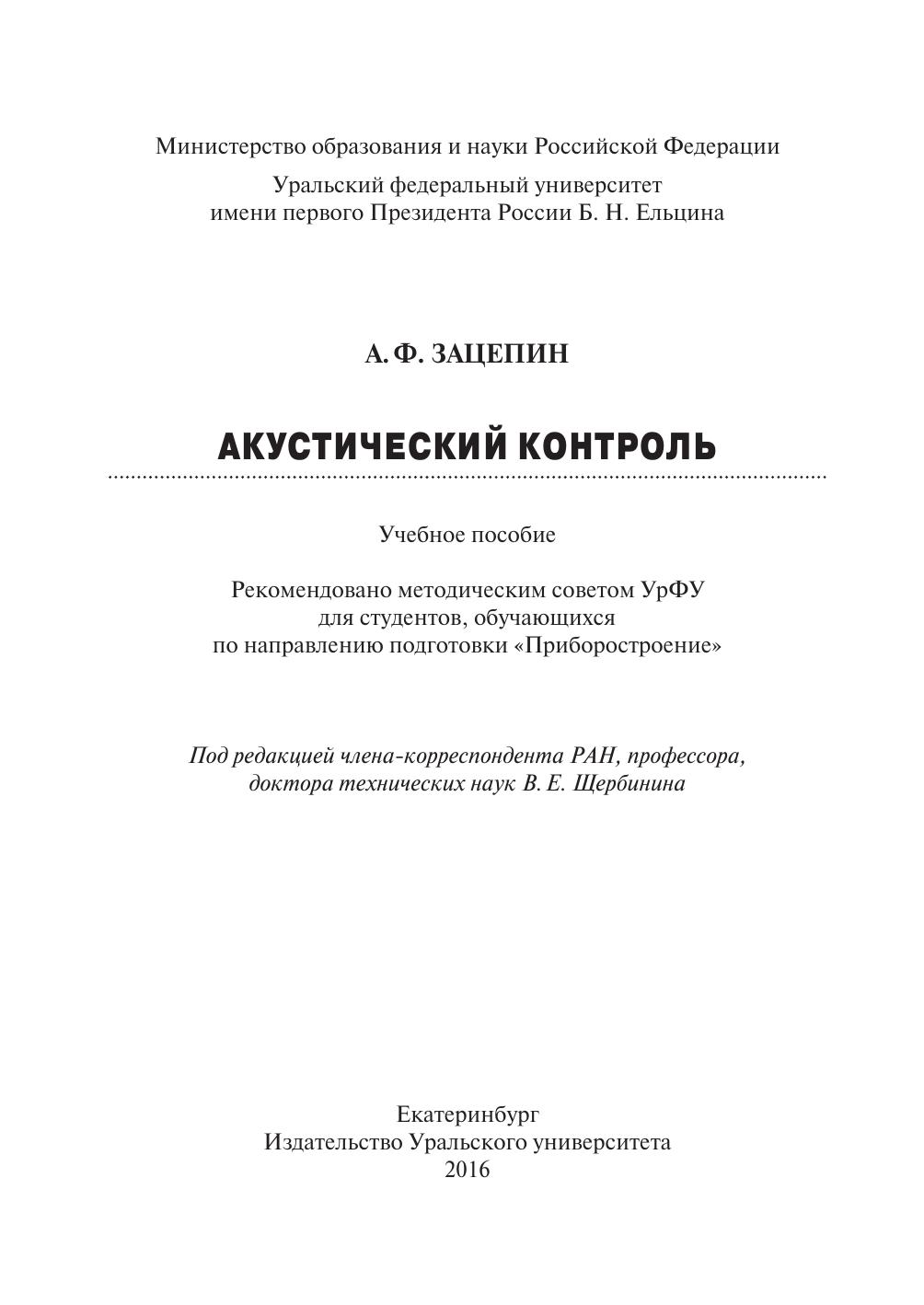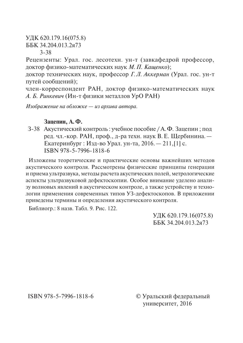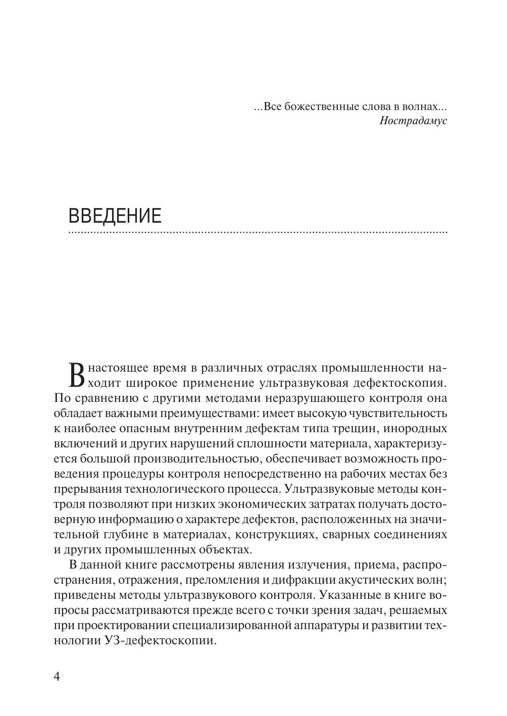 Изложены теоретические и практические основы важнейших методов акустического контроля. Рассмотрены физические принципы генерации и приема ультразвука, методы расчета акустических полей, метрологические аспекты ультразвуковой дефектоскопии. Особое внимание уделено анализу волновых явлений в акустическом контроле, а также устройству и технологии применения современных типов УЗ-дефектоскопов. В приложении приведены термины и определения акустического контроля.