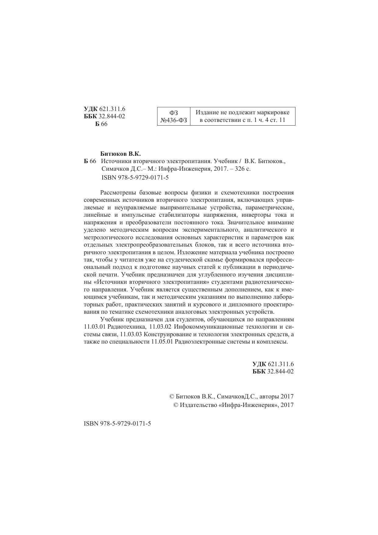 Рассмотрены базовые вопросы физики и схемотехники построения современных источников вторичного электропитания, включающих управляемые и неуправляемые выпрямительные устройства, параметрические, линейные и импульсные стабилизаторы напряжения, инверторы тока и напряжения и преобразователи постоянного тока. Значительное внимание уделено методическим вопросам экспериментального, аналитического и метрологического исследования основных характеристик и параметров как отдельных электропреобразовательных блоков, так и всего источника вторичного электропитания в целом. Изложение материала учебника построено так, чтобы у читателя уже на студенческой скамье формировался профессиональный подход к подготовке научных статей к публикации в периодической печати. Учебник предназначен для углубленного изучения дисциплины "Источники вторичного электропитания" студентами радиотехнического направления. Учебник является существенным дополнением, как к имеющимся учебникам, так и методическим указаниям по выполнению лабораторных работ, практических занятий и курсового и дипломного проектирования по тематике схемотехники аналоговых электронных устройств.