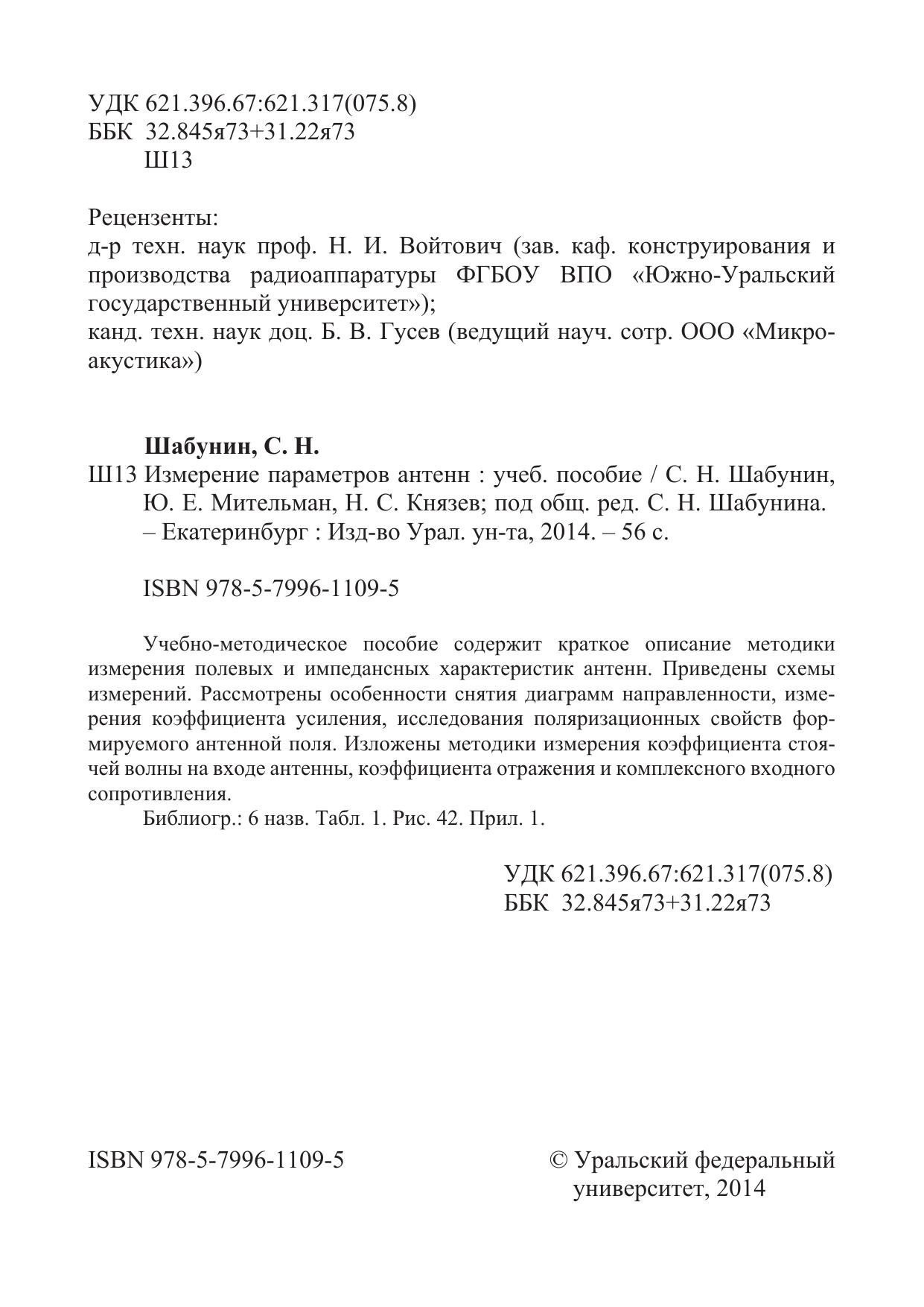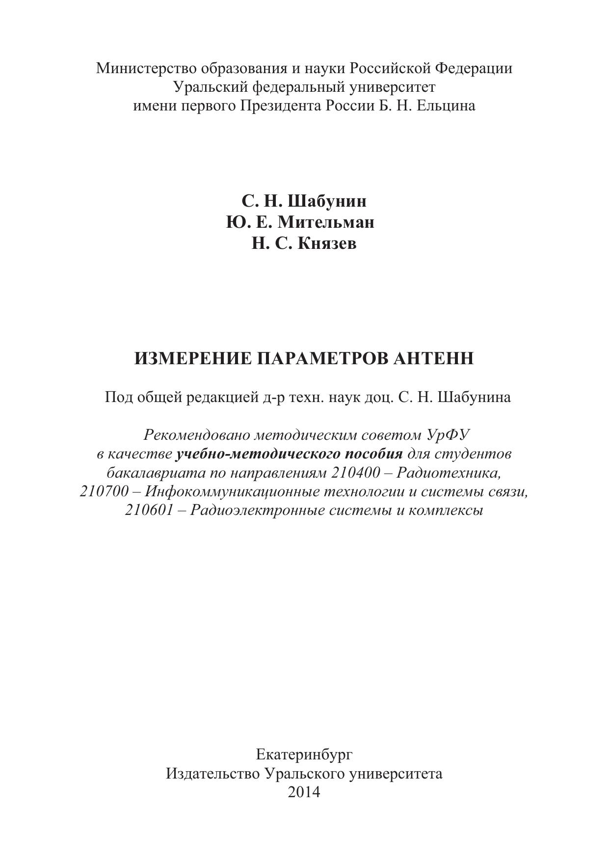 Учебно-методическое пособие содержит краткое описание методики измерения полевых и импедансных характеристик антенн. Приведены схемы измерений. Рассмотрены особенности снятия диаграмм направленности, измерения коэффициента усиления, исследования поляризационных свойств формируемого антенной поля. Изложены методики измерения коэффициента стоячей волны на входе антенны, коэффициента отражения и комплексного входного сопротивления.