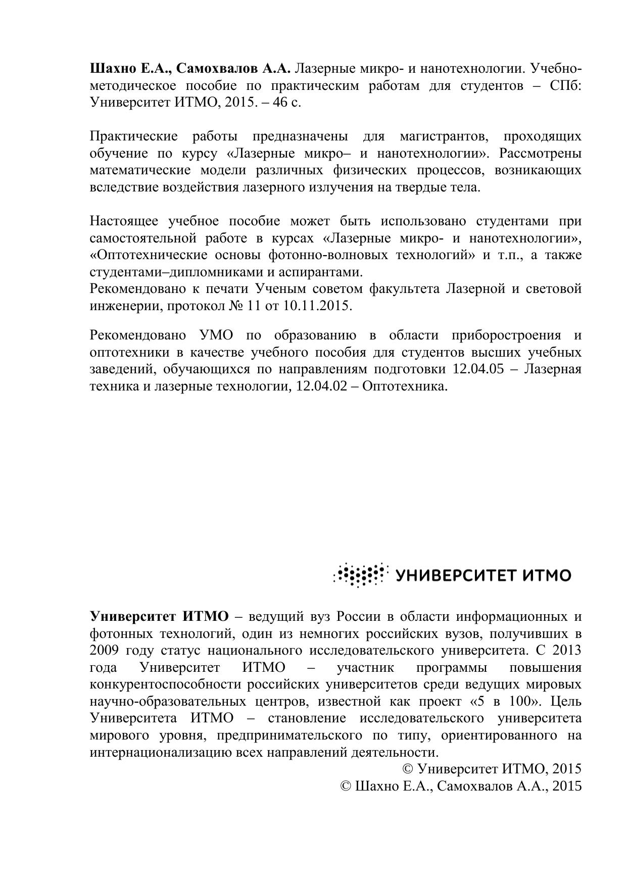Практические работы предназначены для магистрантов, проходящих обучение по курсу «Лазерные микро– и нанотехнологии». Рассмотрены математические модели различных физических процессов, возникающих вследствие воздействия лазерного излучения на твердые тела. Настоящее учебное пособие может быть использовано студентами при самостоятельной работе в курсах «Лазерные микро- и нанотехнологии», «Оптотехнические основы фотонно-волновых технологий» и т.п., а также студентами–дипломниками и аспирантами. Рекомендовано к печати Ученым советом факультета Лазерной и световой инженерии, протокол № 11 от 10.11.2015. Рекомендовано УМО по образованию в области приборостроения и оптотехники в качестве учебного пособия для студентов высших учебных заведений, обучающихся по направлениям подготовки 12.04.05 – Лазерная техника и лазерные технологии, 12.04.02 – Оптотехника.