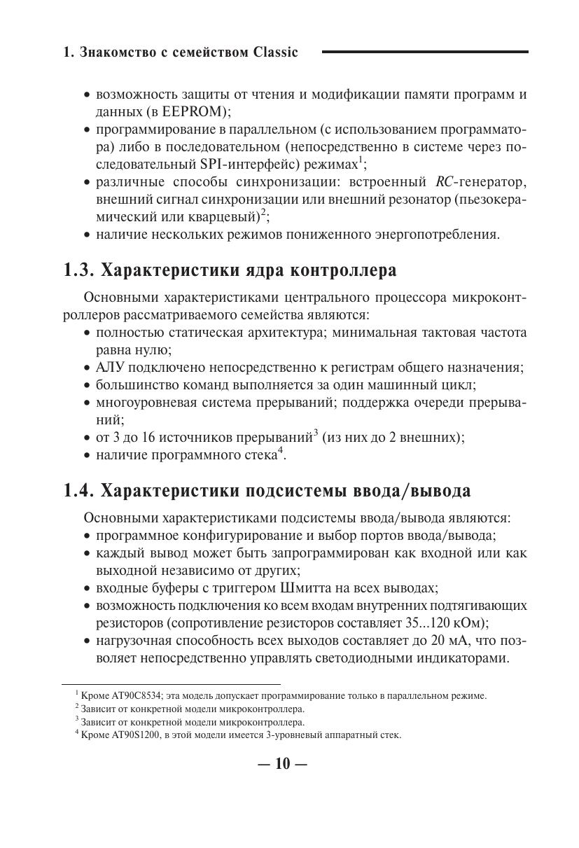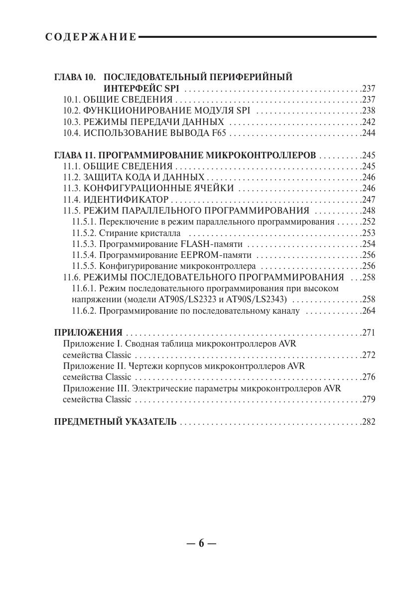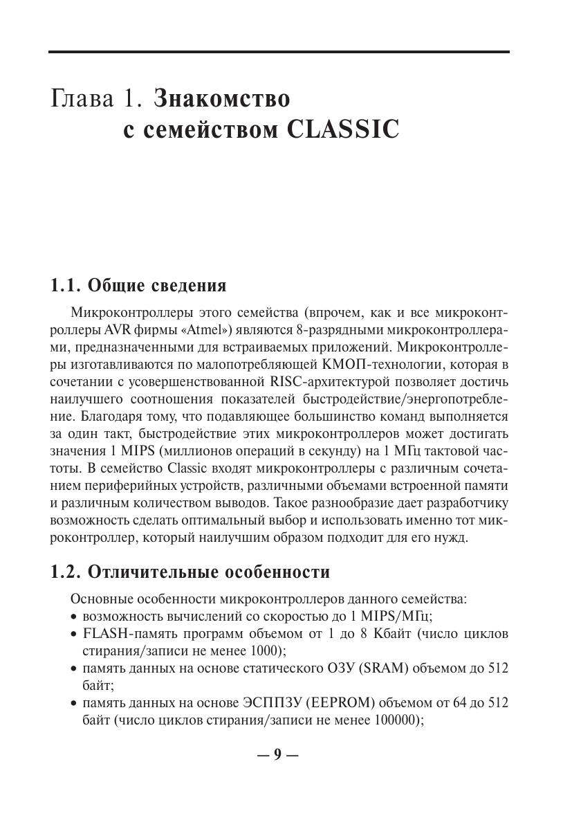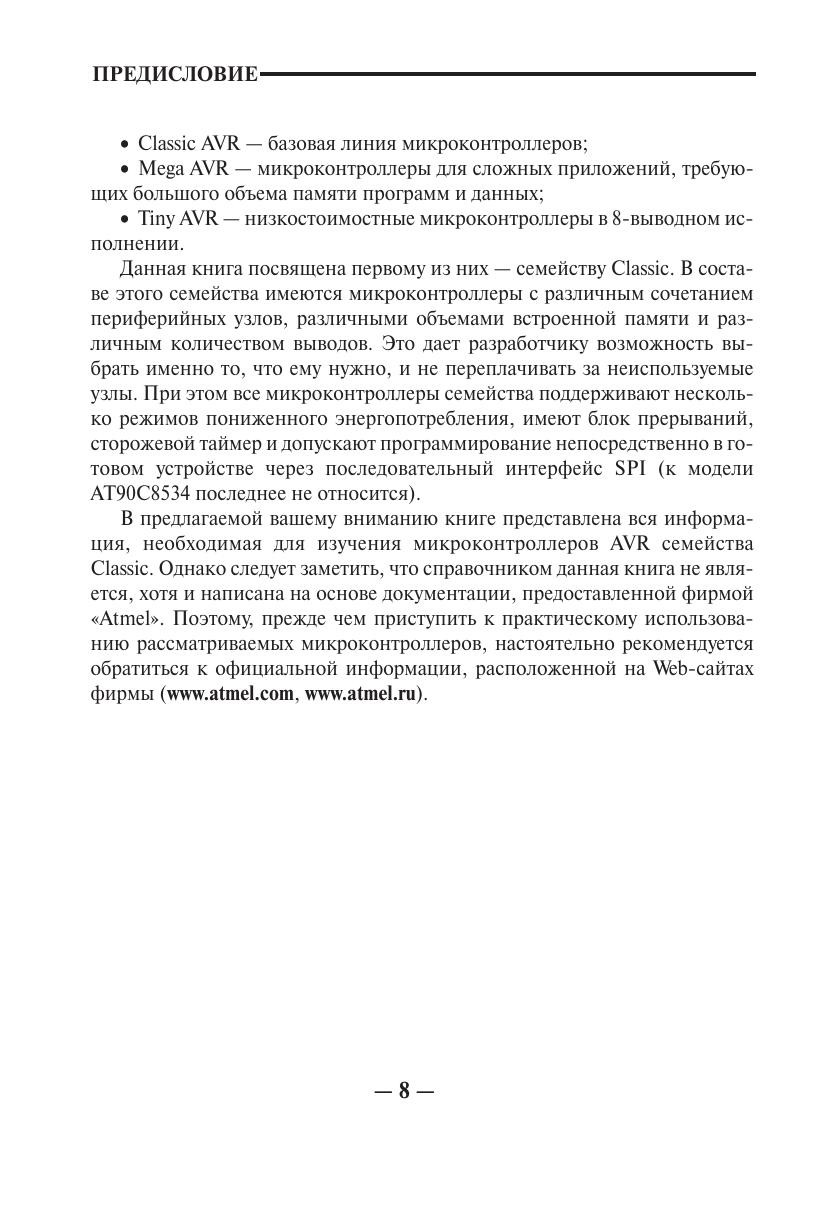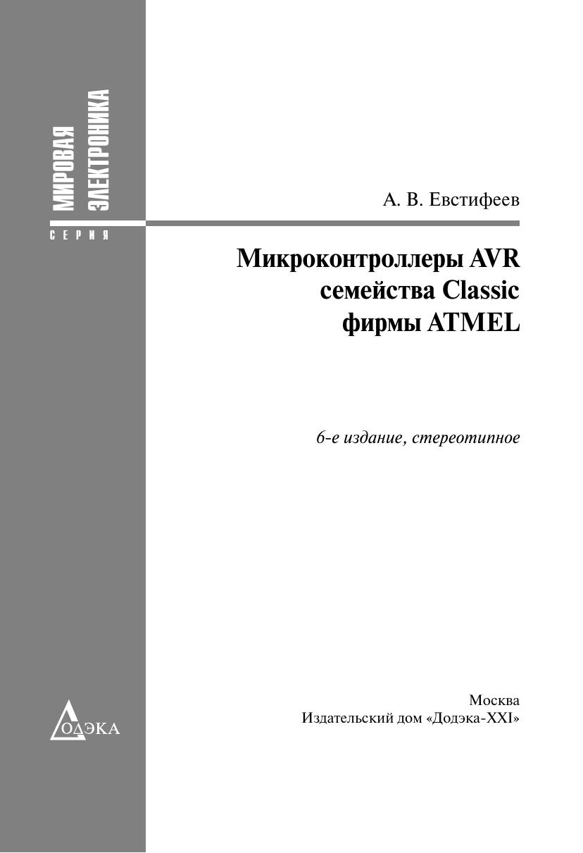 Книга представляет собой справочное издание по применению микроконтроллеров AVR семейства Classic фирмы ATMEL. Рассмотрены особенности архитектуры, приведены основные электрические параметры. Подробно описаны система команд, периферия, а также способы программирования. Предназначена для разработчиков радиоэлектронной аппаратуры, инженеров, студентов технических вузов.