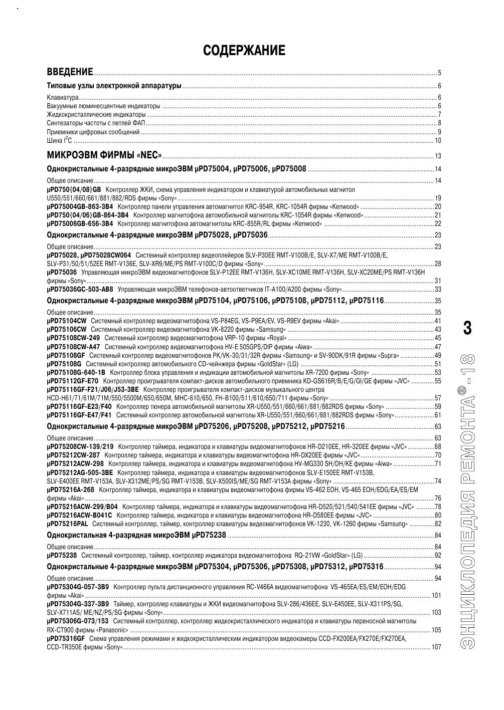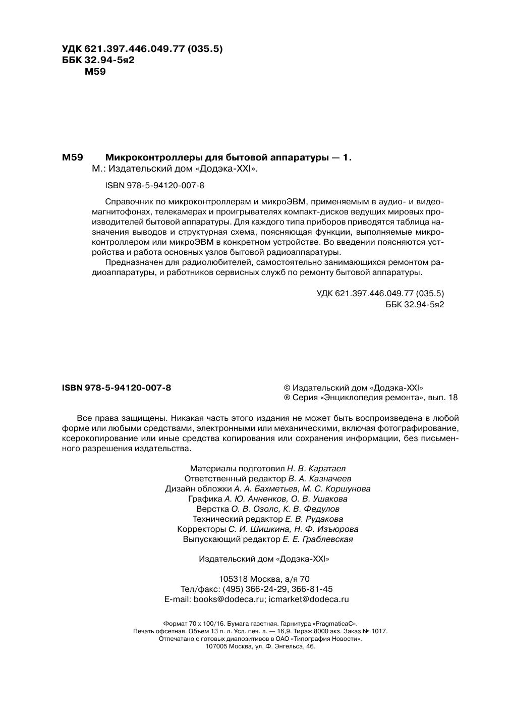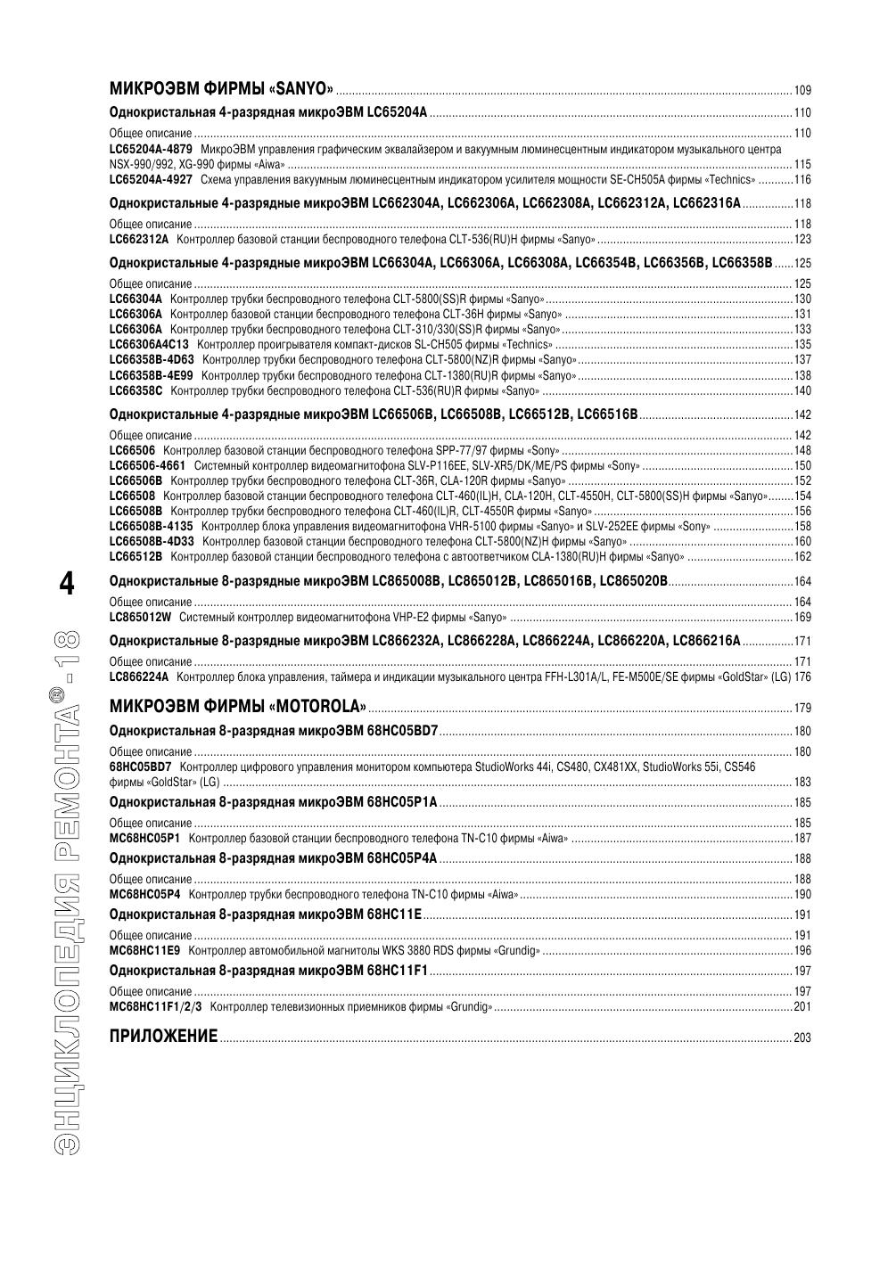 Справочник по микроконтроллерам и микро-ЭВМ, применяемым в аудио- и видео-магнитофонах, телекамерах и проигрывателях компакт-дисков ведущих мировых производителей бытовой аппаратуры. Для каждого типа приборов приводятся таблица назначения выводов и структурная схема, поясняющая функции, выполняемые микро-контроллером или микро-ЭВМ в конкретном устройстве. Во введении поясняются устройства и работа основных узлов бытовой радиоаппаратуры. Предназначен для радиолюбителей, самостоятельно занимающихся ремонтом радиоаппаратуры, и работников сервисных служб по ремонту бытовой аппаратуры.