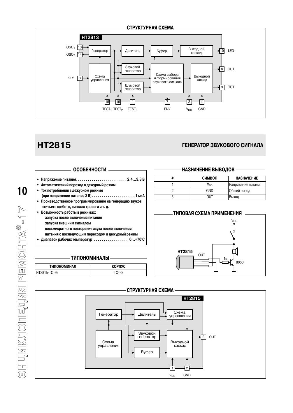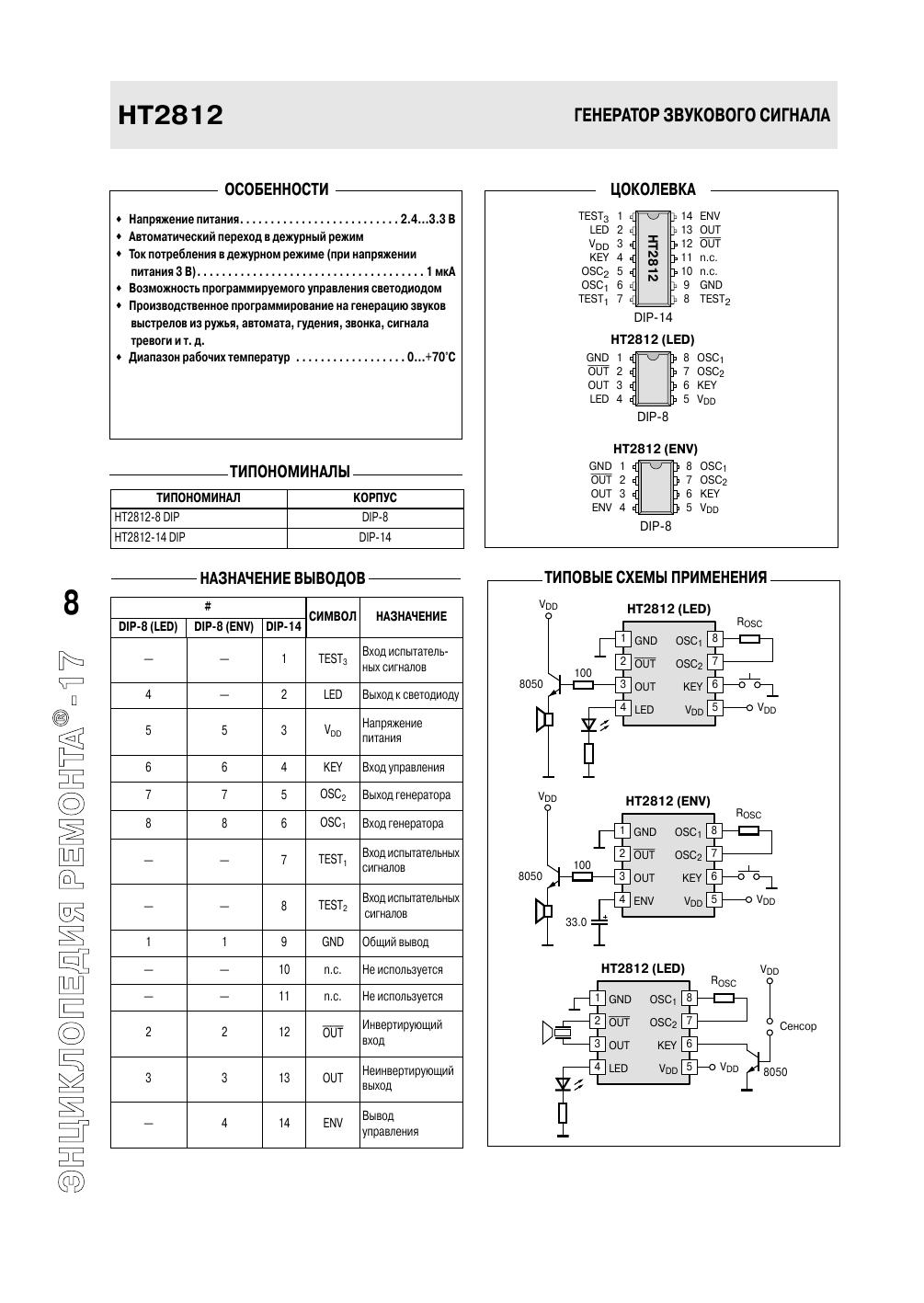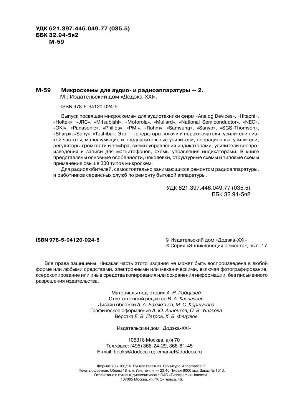 Выпуск посвящен микросхемам для аудиотехники фирм «Analog Devices», «Hitachi», «Holtek», «JRC», «Mitsubishi», «Motorola», «Mullard», «National Semiconductor», «NEC», «OKI», «Panasonic», «Philips», «PMI», «Rohm», «Samsung», «Sanyo», «SGS Thomson»,«Sharp», «Sony», «Toshiba». Это — генераторы, ключи и переключатели, усилители низкой частоты, малошумящие и предварительные усилители, операционные усилители, регуляторы громкости и тембра, схемы управления индикаторами, усилители воспроизведения и записи для магнитофонов, схемы управления индикаторами. В книге представлены основные особенности, цоколевки, структурные схемы и типовые схемы применения свыше 300 типов микросхем. Для радиолюбителей, самостоятельно занимающихся ремонтом радиоаппаратуры, и работников сервисных служб по ремонту бытовой аппаратуры.