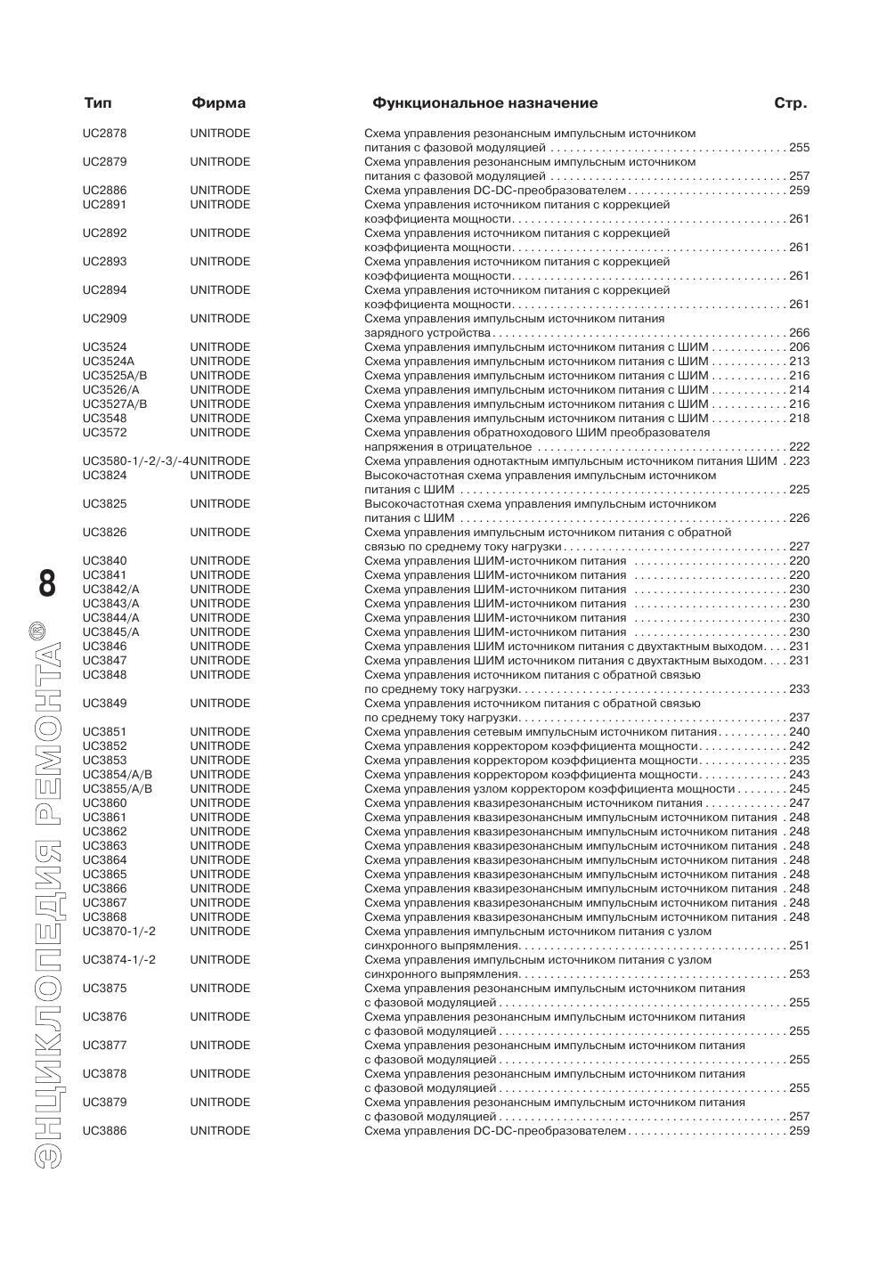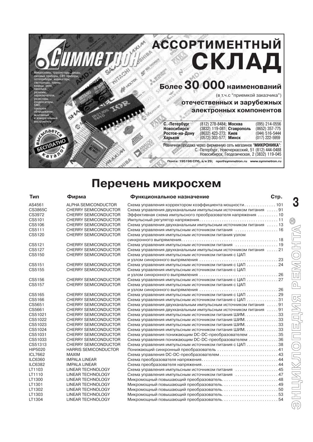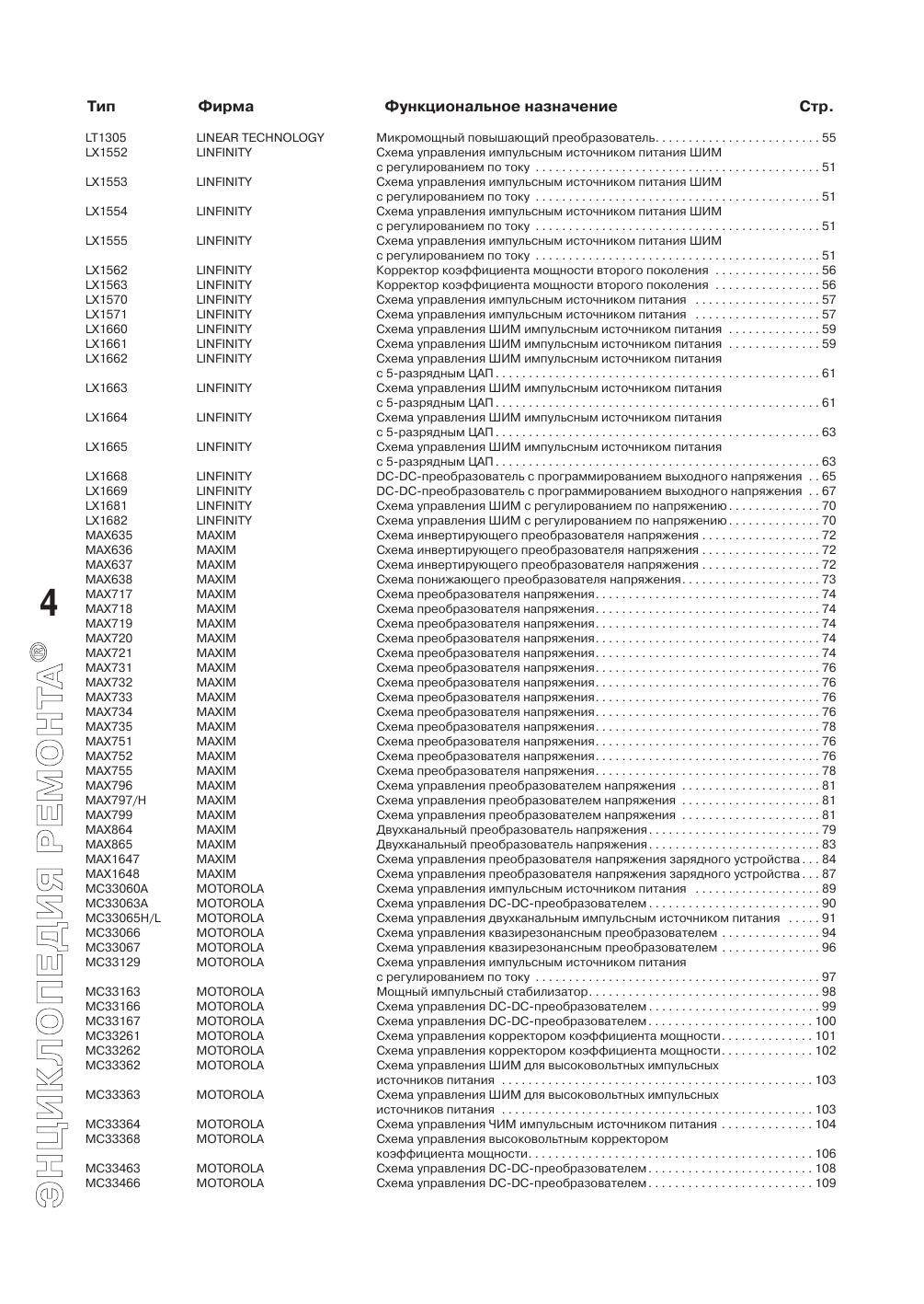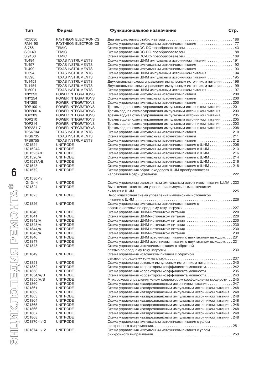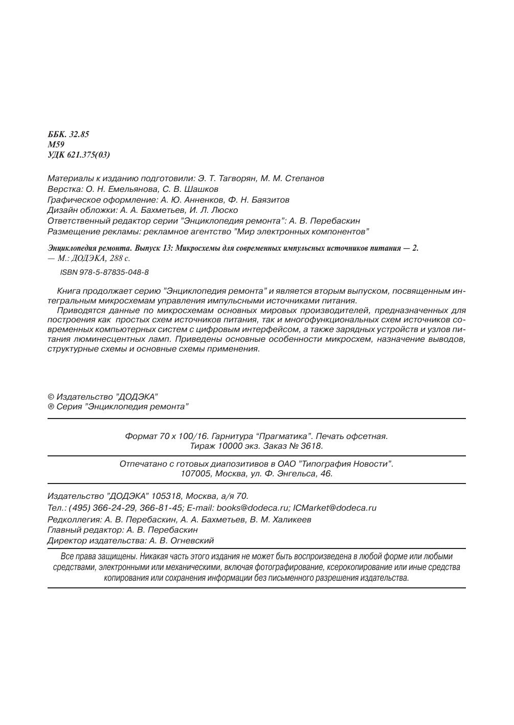 Книга продолжает серию ”Энциклопедия ремонта” и является вторым выпуском, посвященным интегральным микросхемам управления импульсными источниками питания. Приводятся данные по микросхемам основных мировых производителей, предназначенных для построения как простых схем источников питания, так и многофункциональных схем источников современных компьютерных систем с цифровым интерфейсом, а также зарядных устройств и узлов питания люминесцентных ламп. Приведены основные особенности микросхем, назначение выводов, структурные схемы и основные схемы применения.