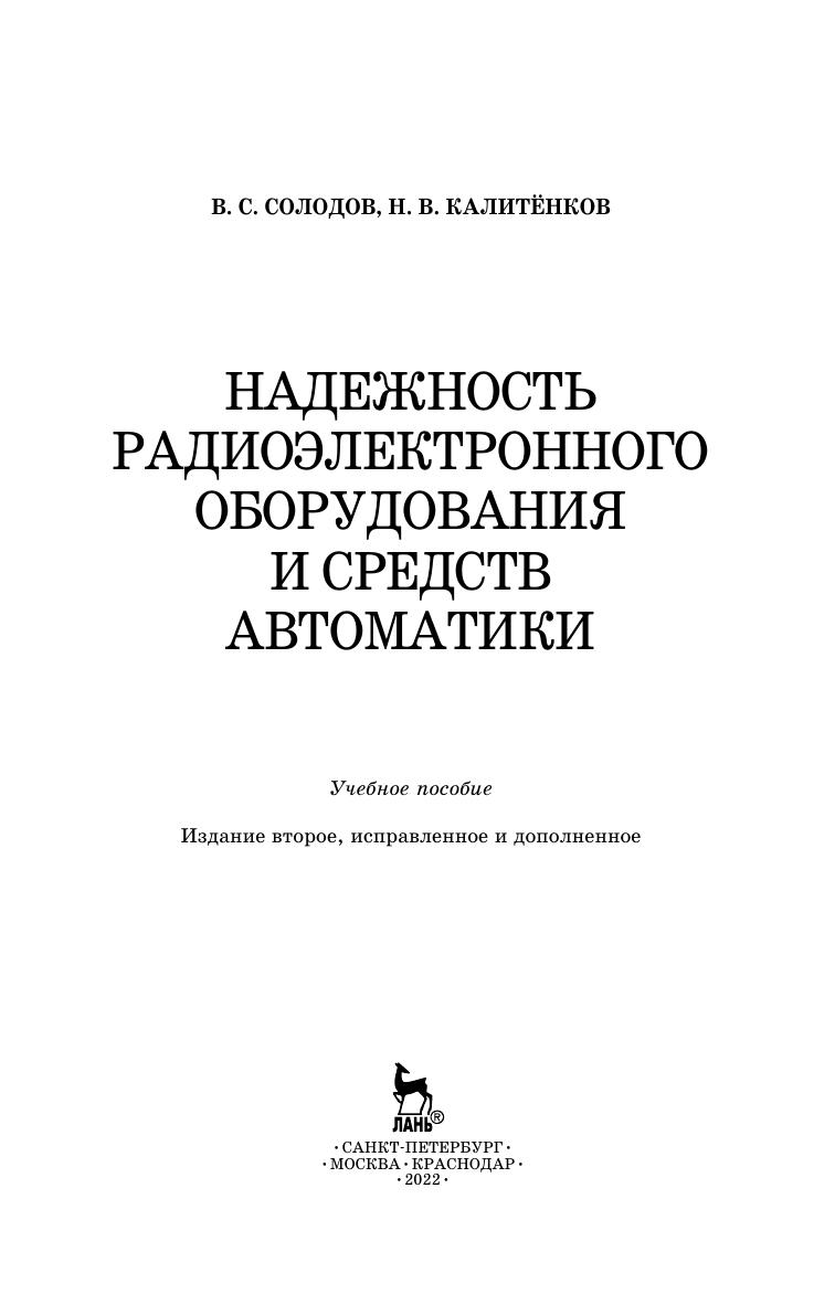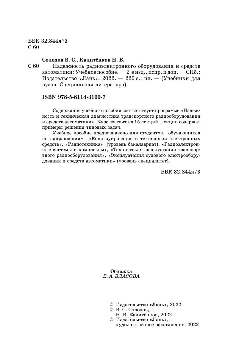 Содержание учебного пособия соответствует программе «Надежность и техническая диагностика транспортного радиооборудования и средств автоматики». Курс состоит из 15 лекций, лекции содержат примеры решения типовых задач. Учебное пособие предназначено для студентов, обучающихся по направлениям «Конструирование и технология электронных средств», «Радиотехника» (уровень бакалавриат), «Радиоэлектронные системы и комплексы», «Техническая эксплуатация транспортного радиооборудования», «Эксплуатация судового электрооборудования и средств автоматики» (уровень специалитет).
