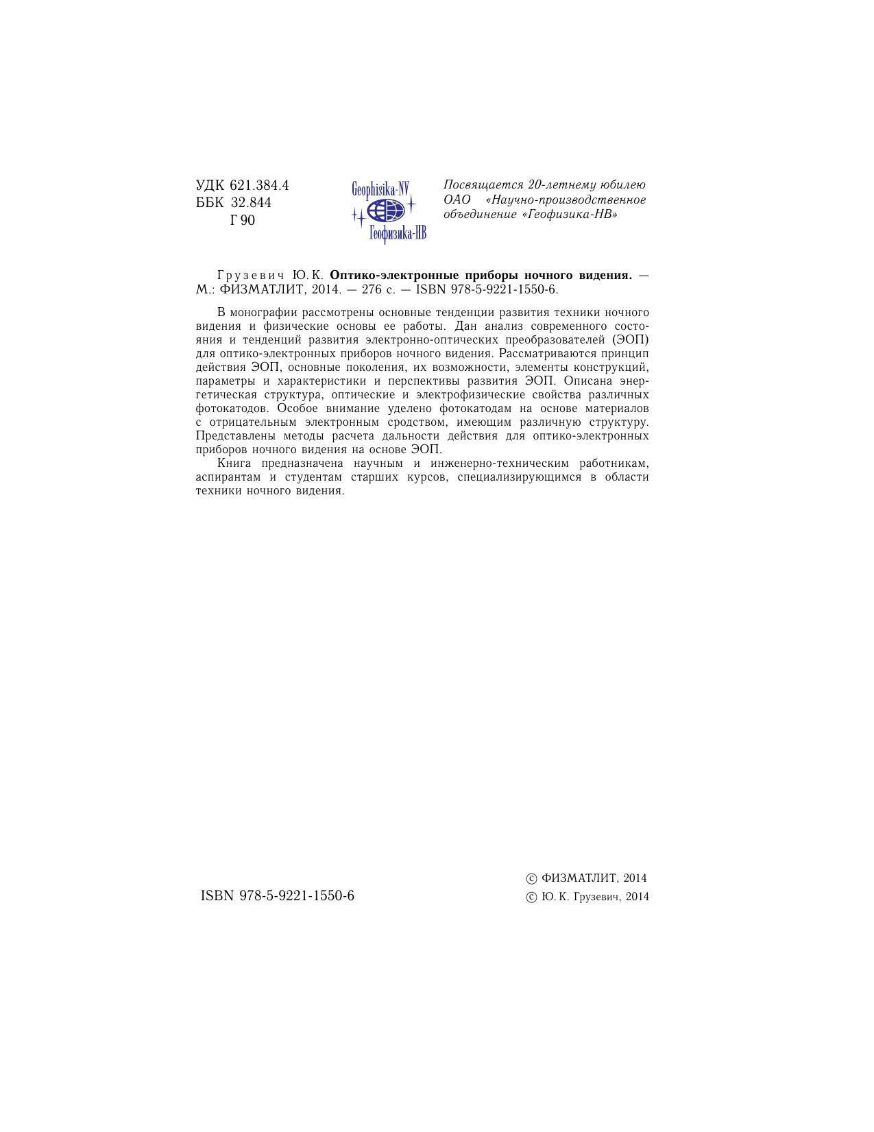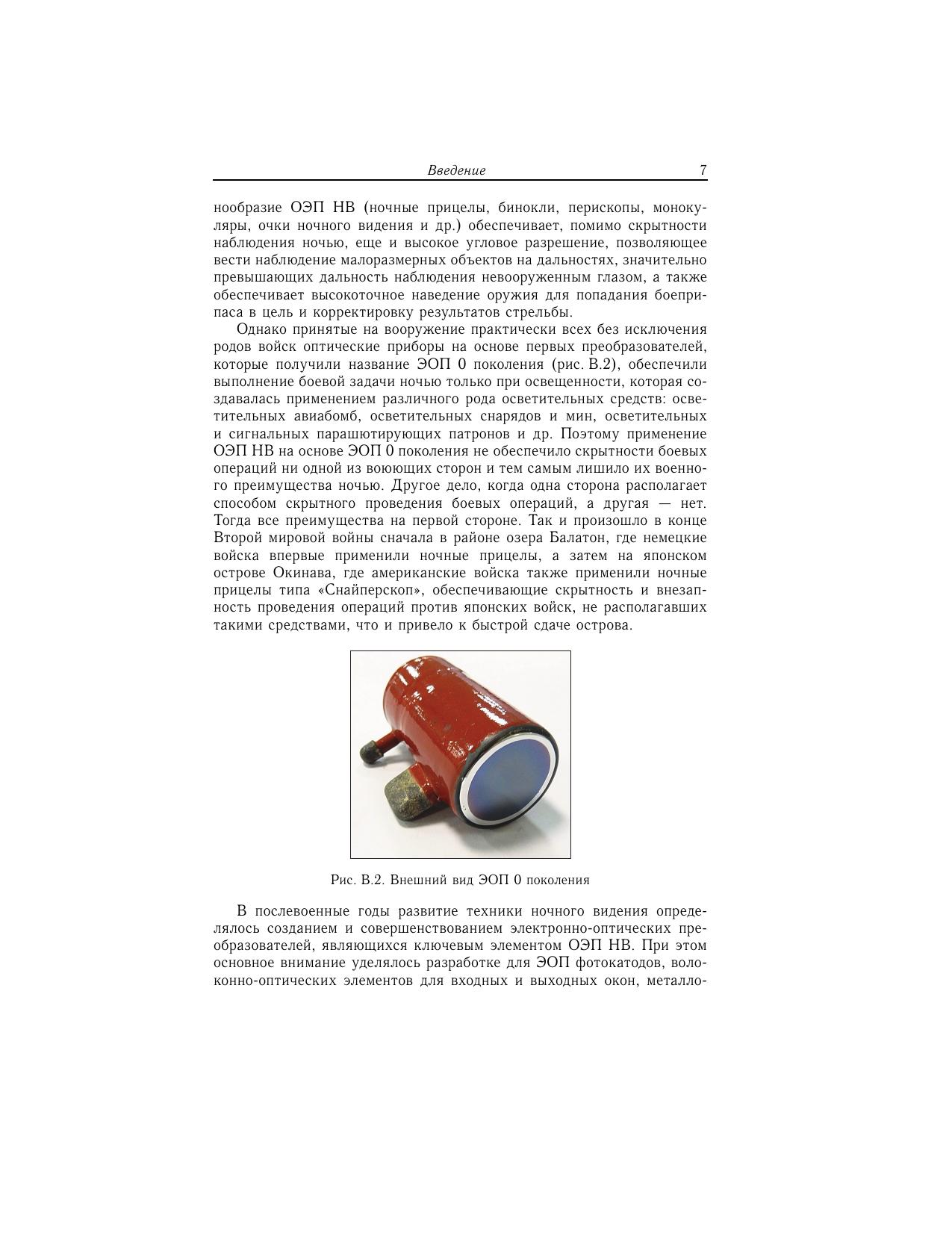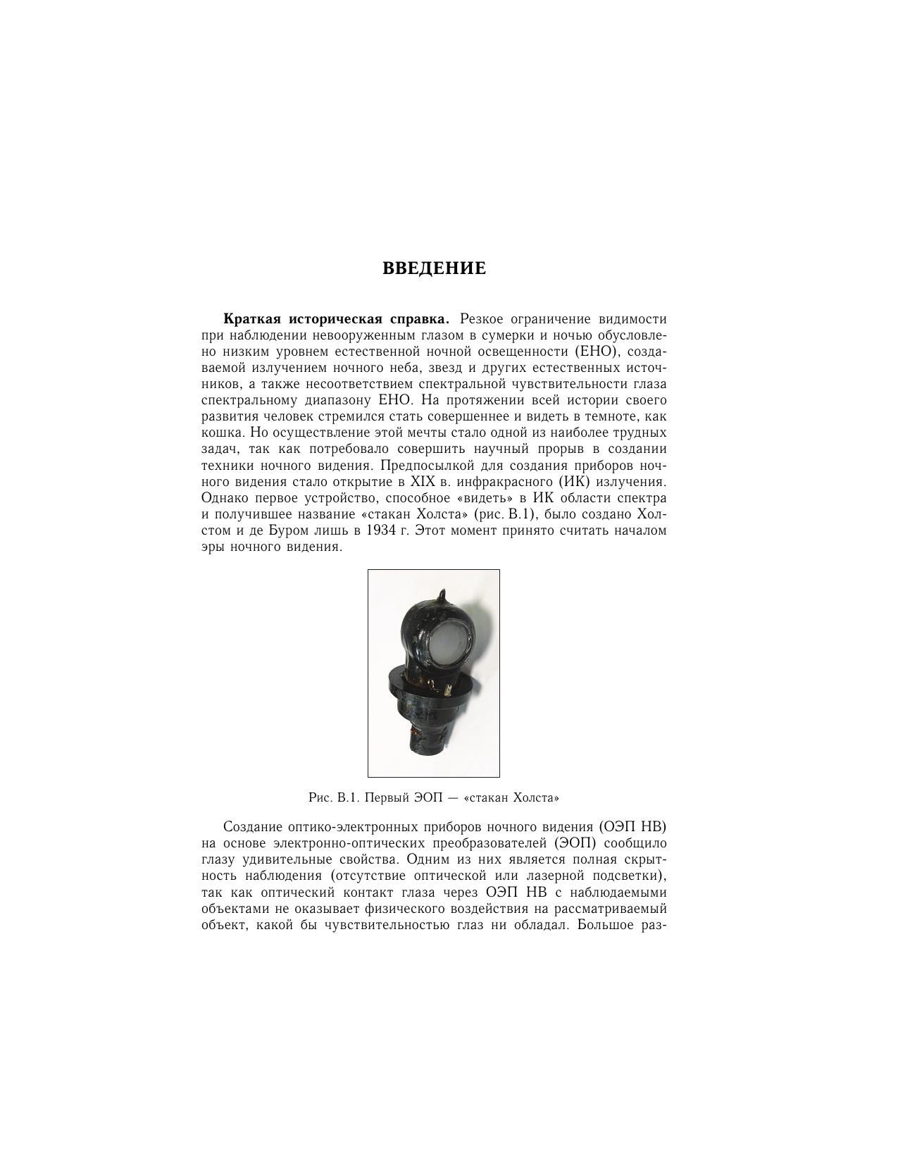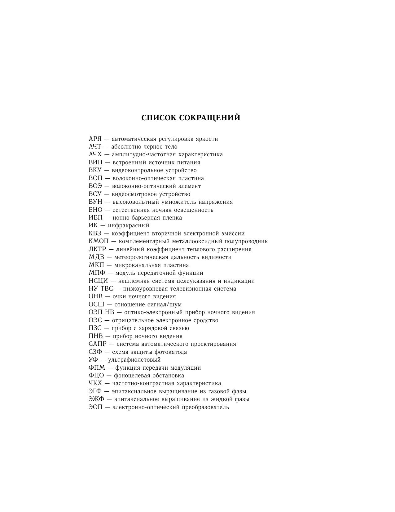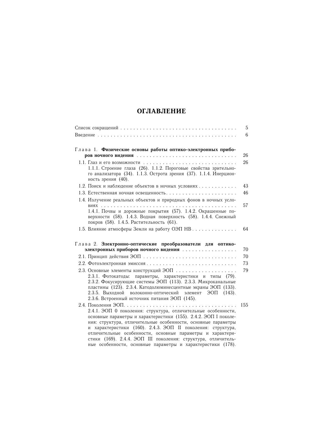 В монографии рассмотрены основные тенденции развития техники ночного видения и физические основы ее работы. Дан анализ современного состояния и тенденций развития электронно-оптических преобразователей (ЭОП) для оптико-электронных приборов ночного видения. Рассматриваются принцип действия ЭОП, основные поколения, их возможности, элементы конструкций, параметры и характеристики и перспективы развития ЭОП. Описана энергетическая структура, оптические и электрофизические свойства различных фотокатодов. Особое внимание уделено фотокатодам на основе материалов с отрицательным электронным сродством, имеющим различную структуру. Представлены методы расчета дальности действия для оптико-электронных приборов ночного видения на основе ЭОП.