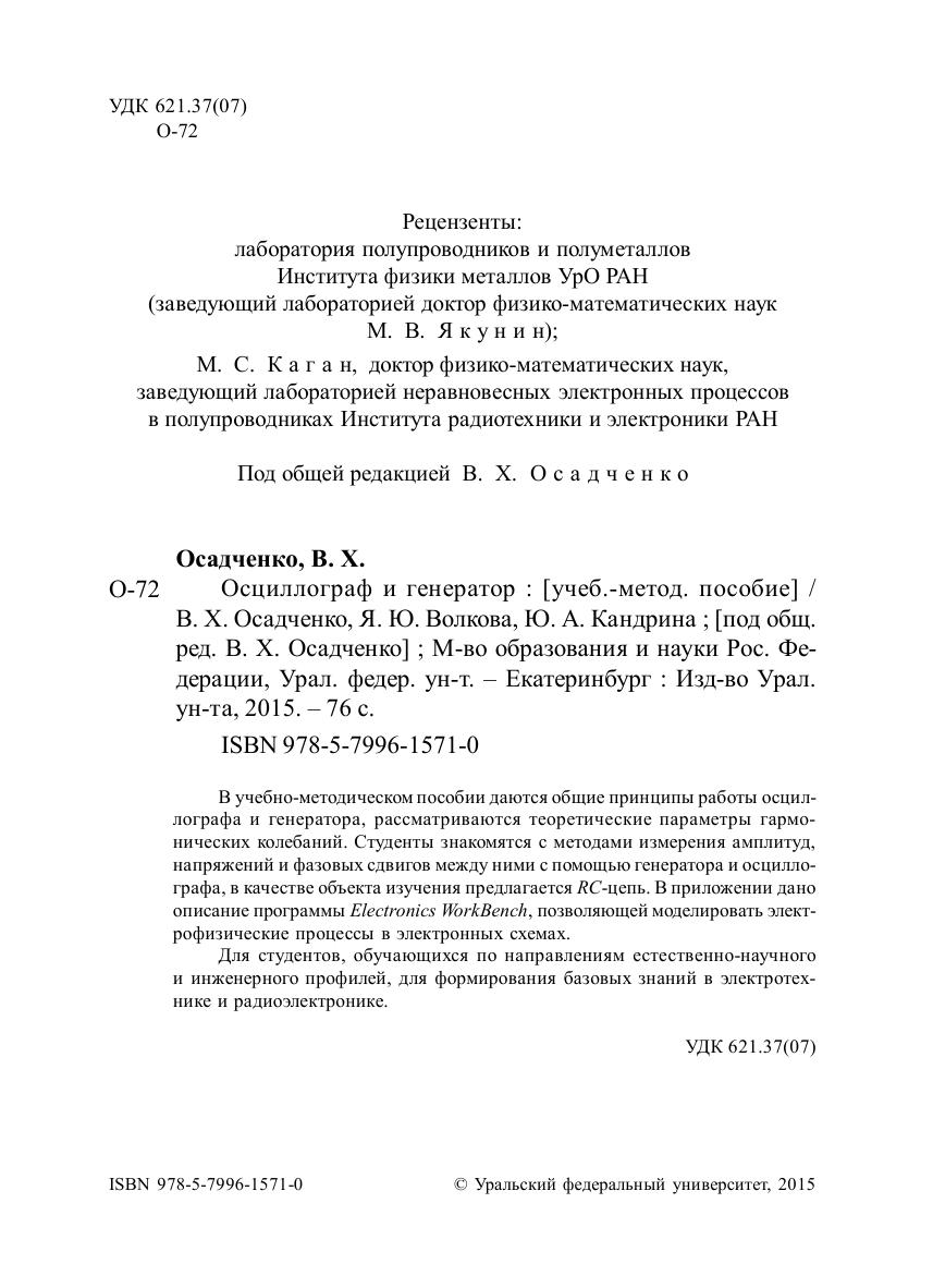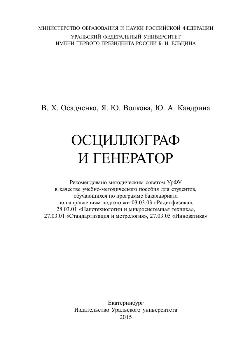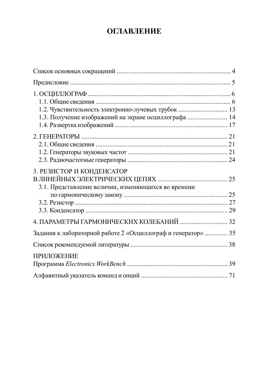 В учебно-методическом пособии даются общие принципы работы осциллографа и генератора, рассматриваются теоретические параметры гармонических колебаний. Студенты знакомятся с методами измерения амплитуд, напряжений и фазовых сдвигов между ними с помощью генератора и осциллографа, в качестве объекта изучения предлагается RC-цепь. В приложении дано описание программы Electronics WorkBench, позволяющей моделировать электрофизические процессы в электронных схемах. Для студентов, обучающихся по направлениям естественно-научного и инженерного профилей, для формирования базовых знаний в электротехнике и радиоэлектронике.