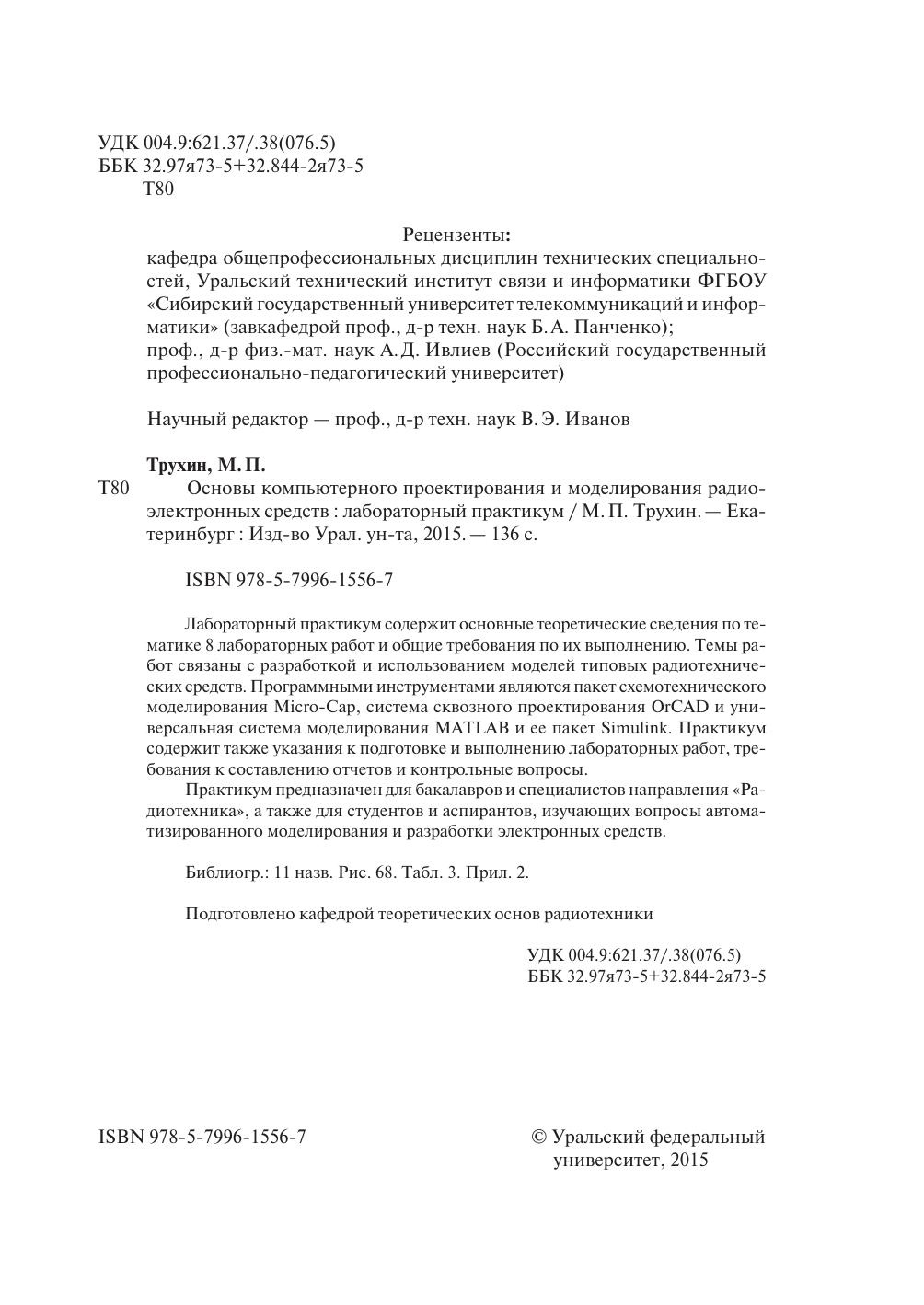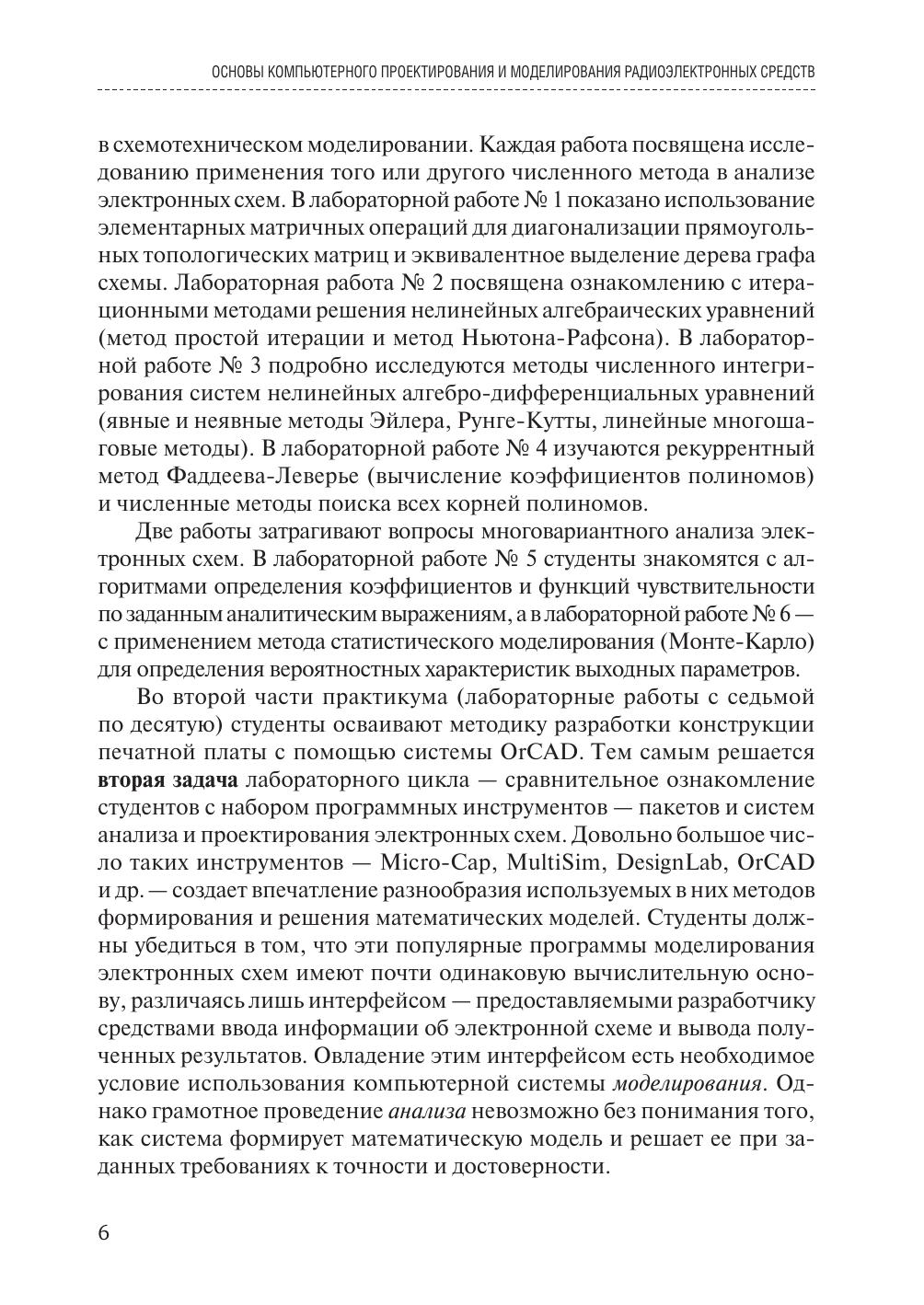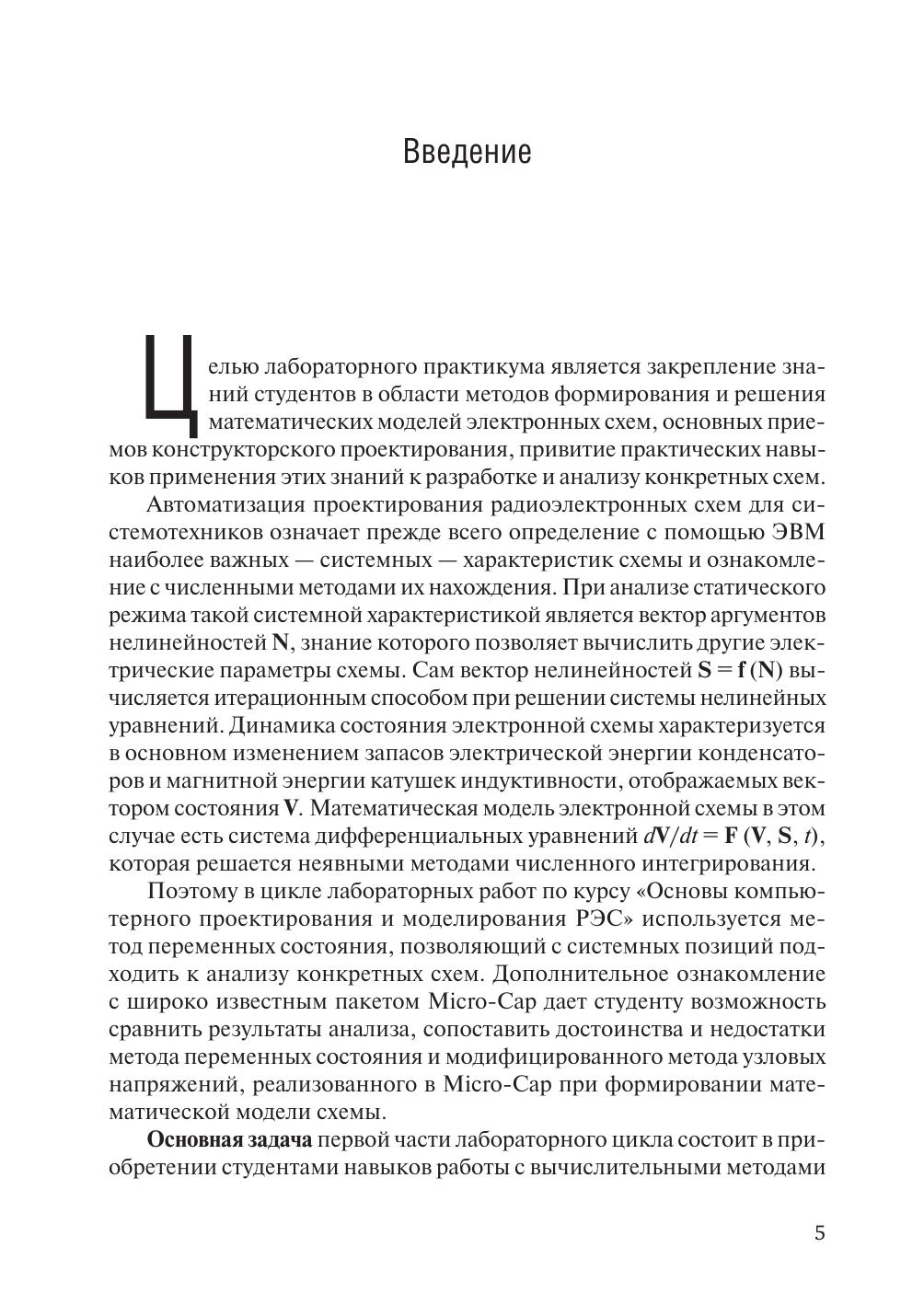 Лабораторный практикум содержит основные теоретические сведения по тематике 8 лабораторных работ и общие требования по их выполнению. Темы работ связаны с разработкой и использованием моделей типовых радиотехнических средств. Программными инструментами являются пакет схемотехнического моделирования Micro-Cap, система сквозного проектирования OrCAD и универсальная система моделирования MATLAB и ее пакет Simulink. Практикум содержит также указания к подготовке и выполнению лабораторных работ, требования к составлению отчетов и контрольные вопросы. Практикум предназначен для бакалавров и специалистов направления «Радиотехника», а также для студентов и аспирантов, изучающих вопросы автоматизированного моделирования и разработки электронных средств.