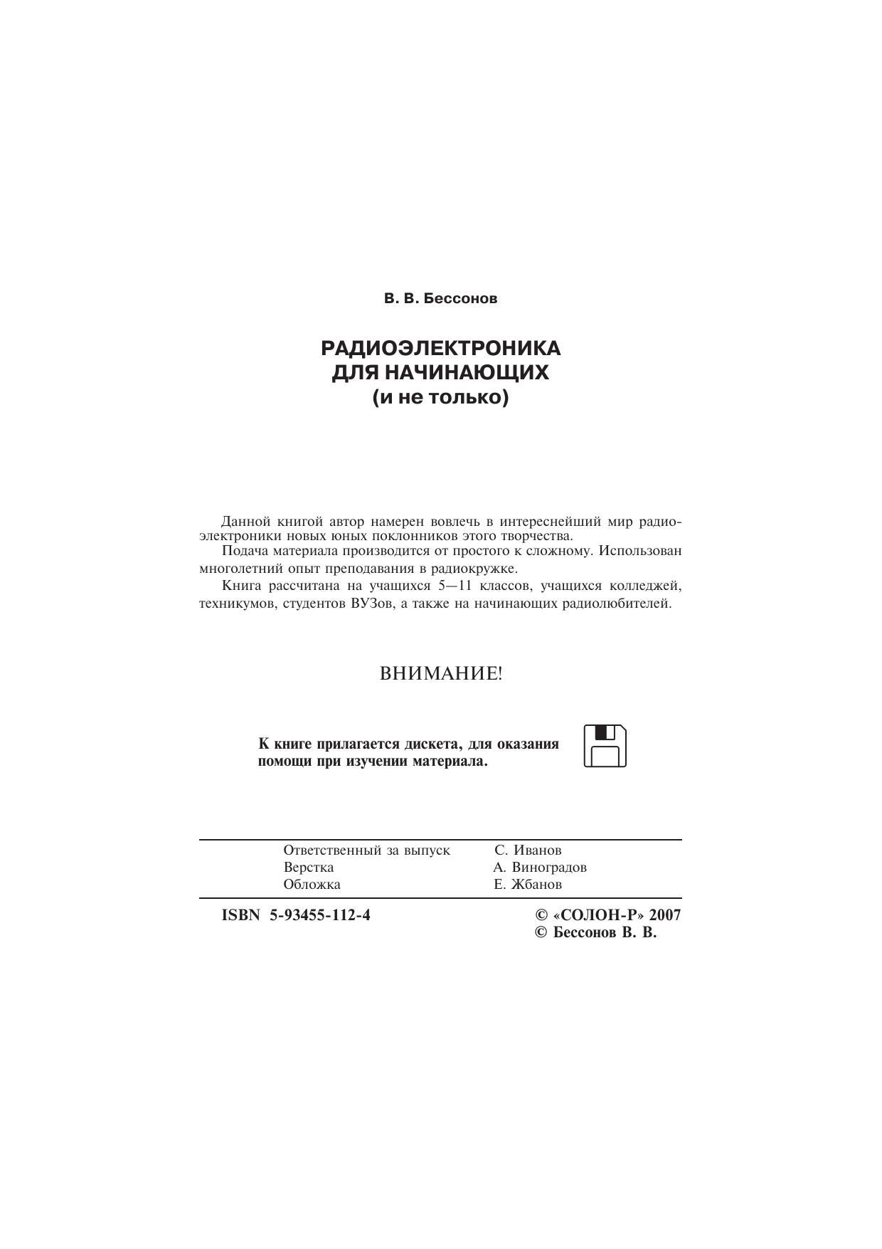 Книга «Радиоэлектроника для начинающих (и не только)» написана педагогом-практиком, по многолетнему опыту знающим как заинтересовать учащихся для появления у них интереса к радиоэлектронике.Теоретический материал в книге излагается в доступной для начинающих радиолюбителей форме, для понимания физических процессов используются аналогии из механики и гидравлики, с которыми они часто встречаются в жизни.Конструкции, рекомендуемые для самостоятельного изготовления, взяты из курса, который автор уже много лет ведет в радиокружке. Автор книги надеется, что авторы используемых в книге статей благосклонно отнесутся к такому подходу. Рекомендуемые конструкции подобраны таким образом, что каждый радиолюбитель может проверить свои знания на практике. Если в предлагаемой для изготовления конструкции радиолюбитель найдет незнакомые для себя элементы (транзисторы, микросхемы и т.д.), он может обратиться к соответствующей главе книги, где, как правило, может найти ответ на свой вопрос.