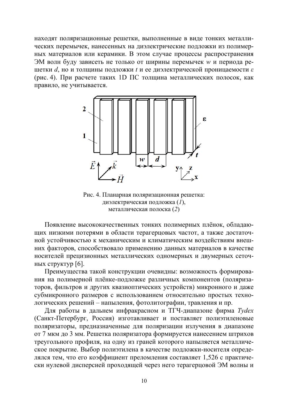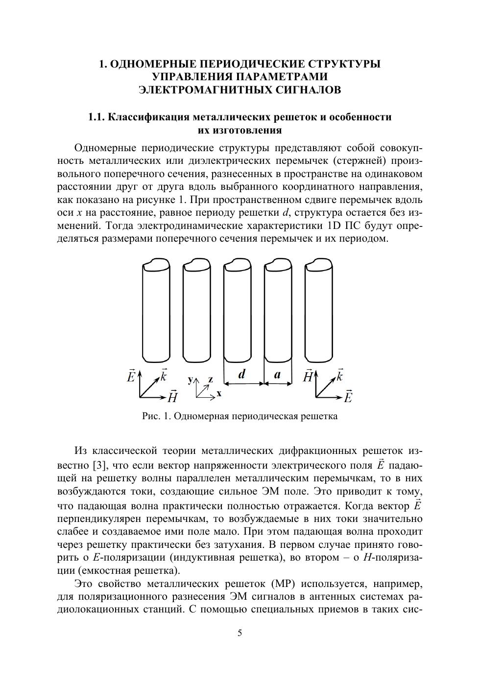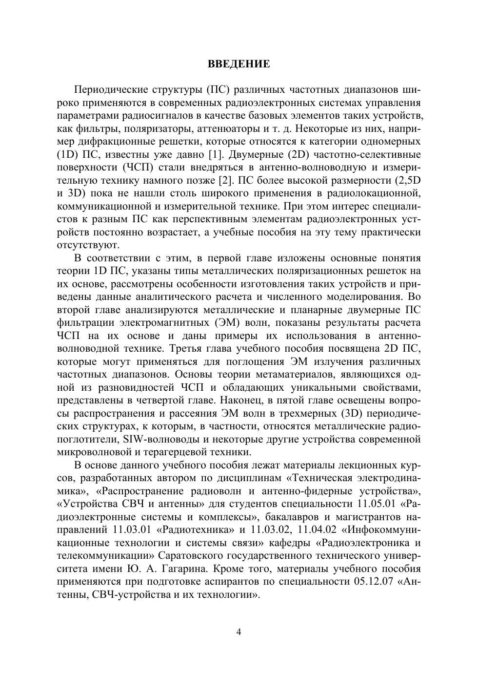 В учебном пособии рассмотрены вопросы распространения, поглощения и рассеяния линейно поляризованных электромагнитных волн в одномерных (1D), двумерных (2D) и трехмерных (3D) периодических структурах, описаны методы их математического моделирования и технологической реализации, приведены примеры практического использования в различных устройствах микроволновой и терагерцевой техники.