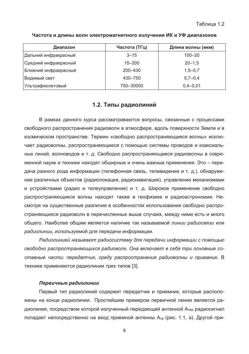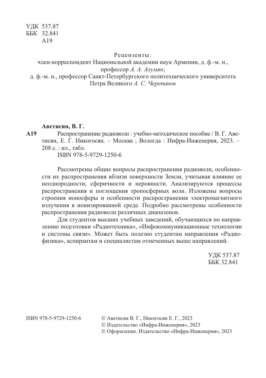 Рассмотрены общие вопросы распространения радиоволн, особенности их распространения вблизи поверхности Земли, учитывая влияние ее неоднородности, сферичности и неровности. Анализируются процессы распространения и поглощения тропосферных волн. Изложены вопросы строения ионосферы и особенности распространения электромагнитного излучения в ионизированной среде. Подробно рассмотрены особенности распространения радиоволн различных диапазонов.