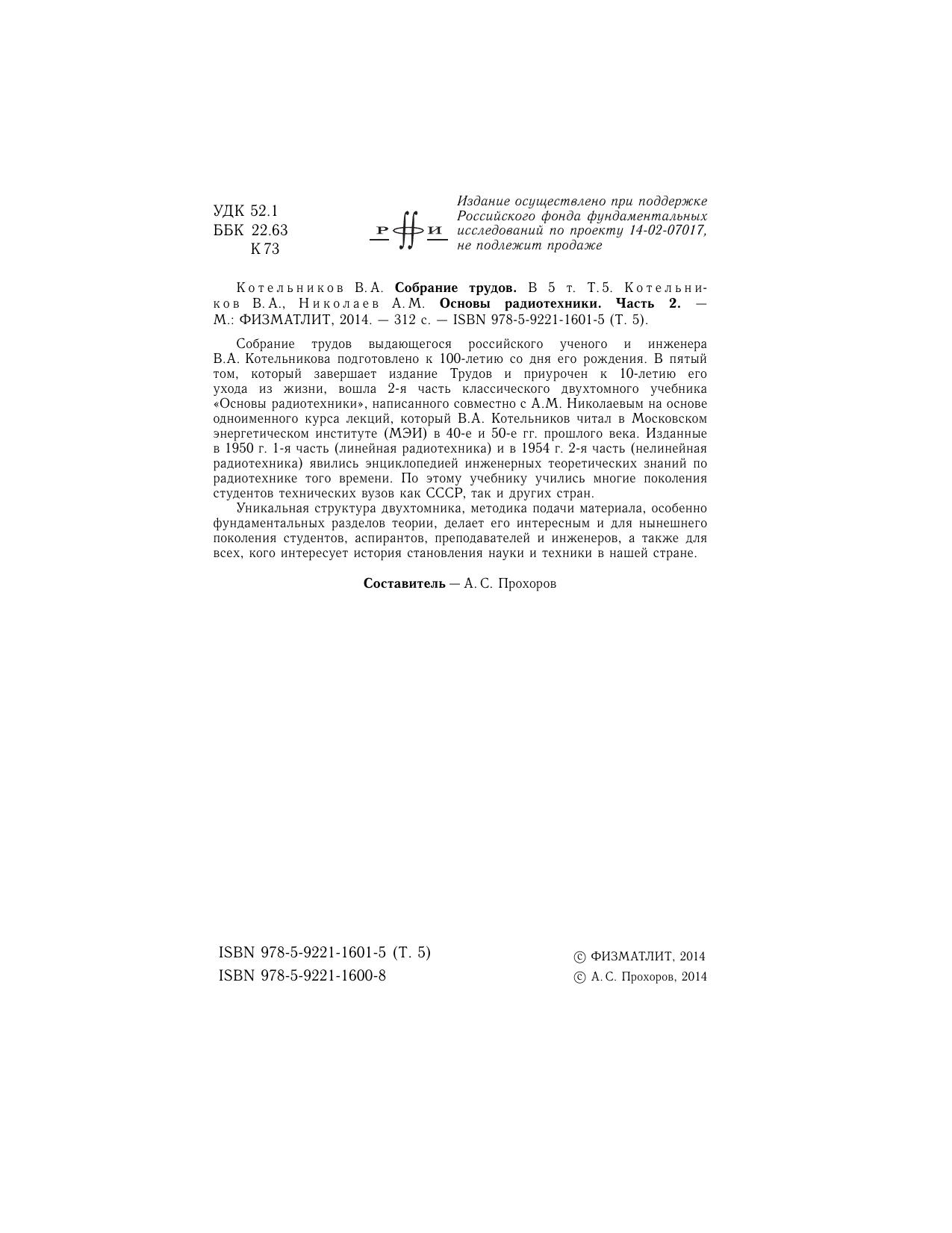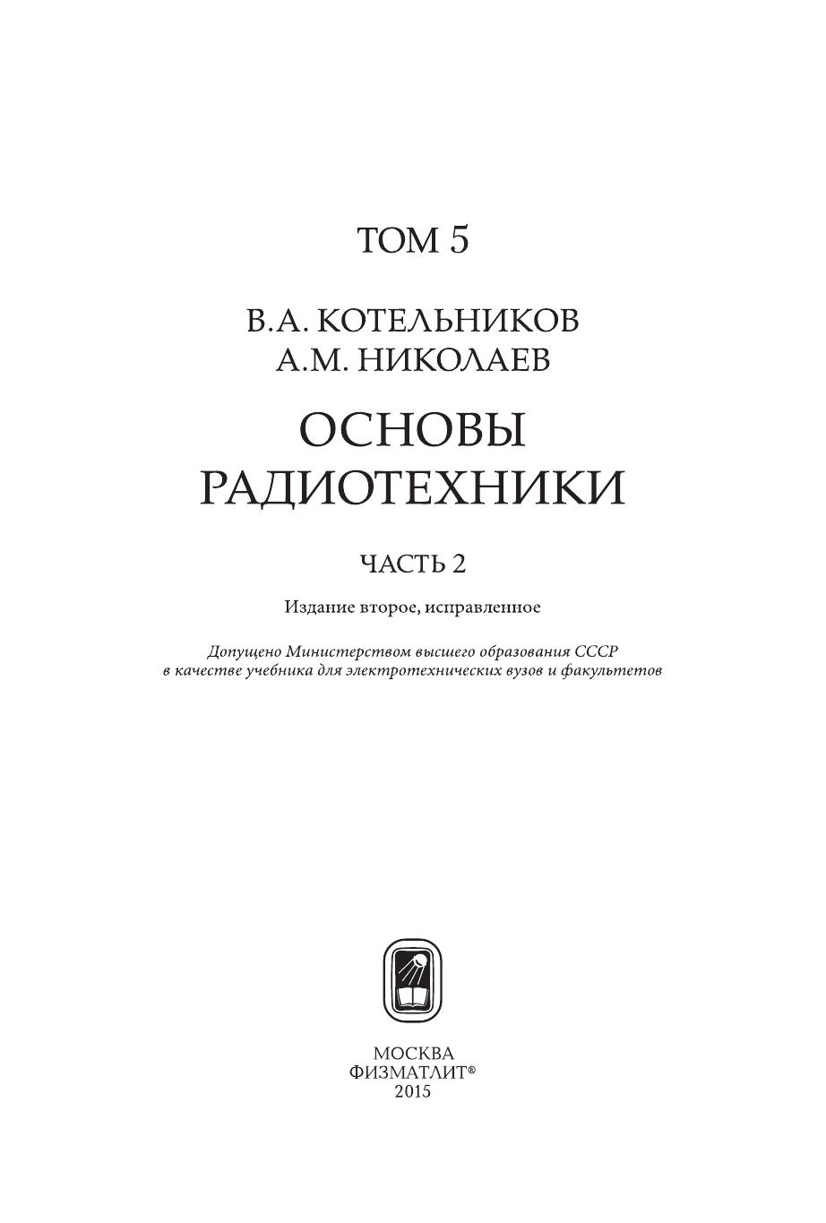 Собрание трудов выдающегося российского ученого и инженера В.А. Котельникова подготовлено к 100-летию со дня его рождения. В пятый том, который завершает издание Трудов и приурочен к 10-летиюего ухода из жизни, вошла 2-я часть классического двухтомного учебника «Основы радиотехники», написанного совместно с А.М. Николаевым на основе одноименного курса лекций, который В.А. Котельников читал в Московском энергетическом институте (МЭИ) в 40-е и 50-е гг. прошлого века. Изданные в 1950 г. 1-я часть (линейная радиотехника) и в 1954 г. 2-я часть (нелинейная радиотехника) явились энциклопедией инженерных теоретических знаний по радиотехнике того времени. По этому учебнику учились многие поколения студентов технических вузов как СССР, так и других стран.