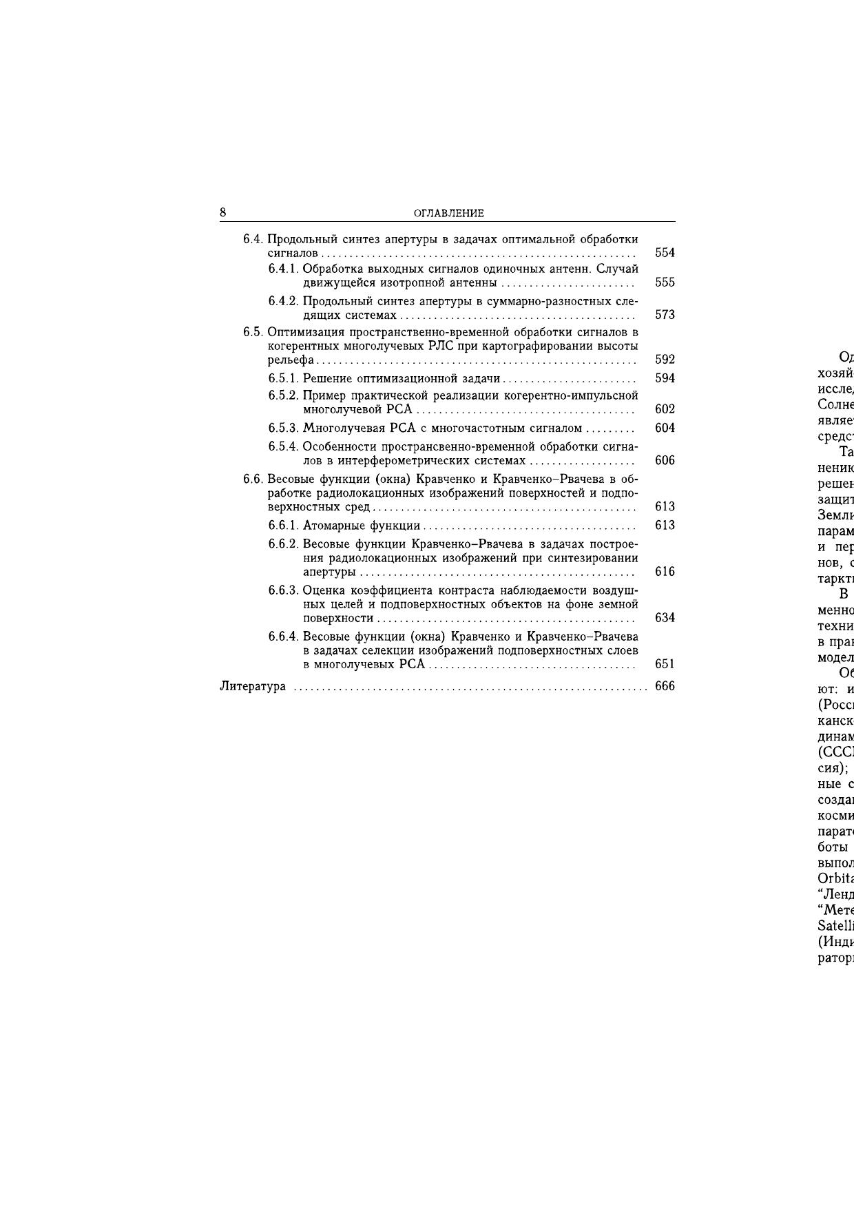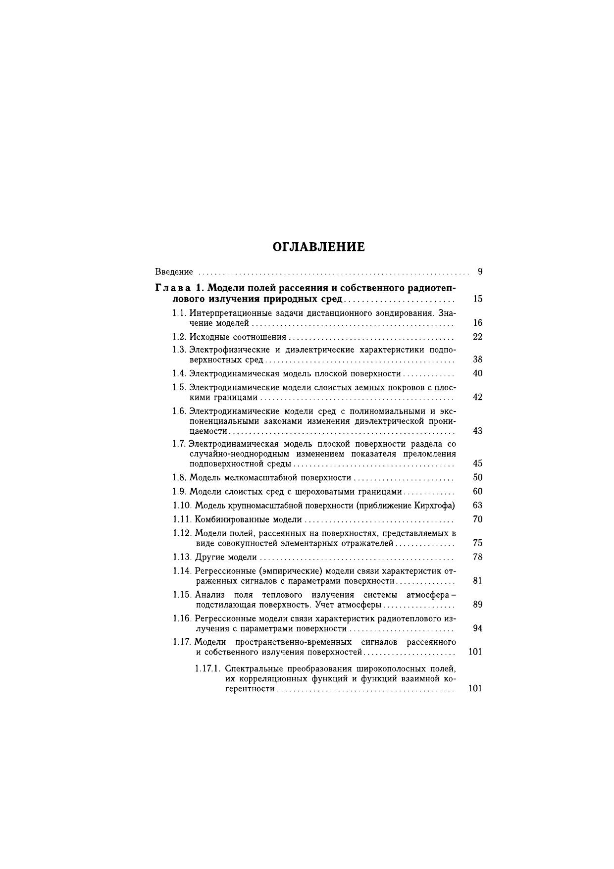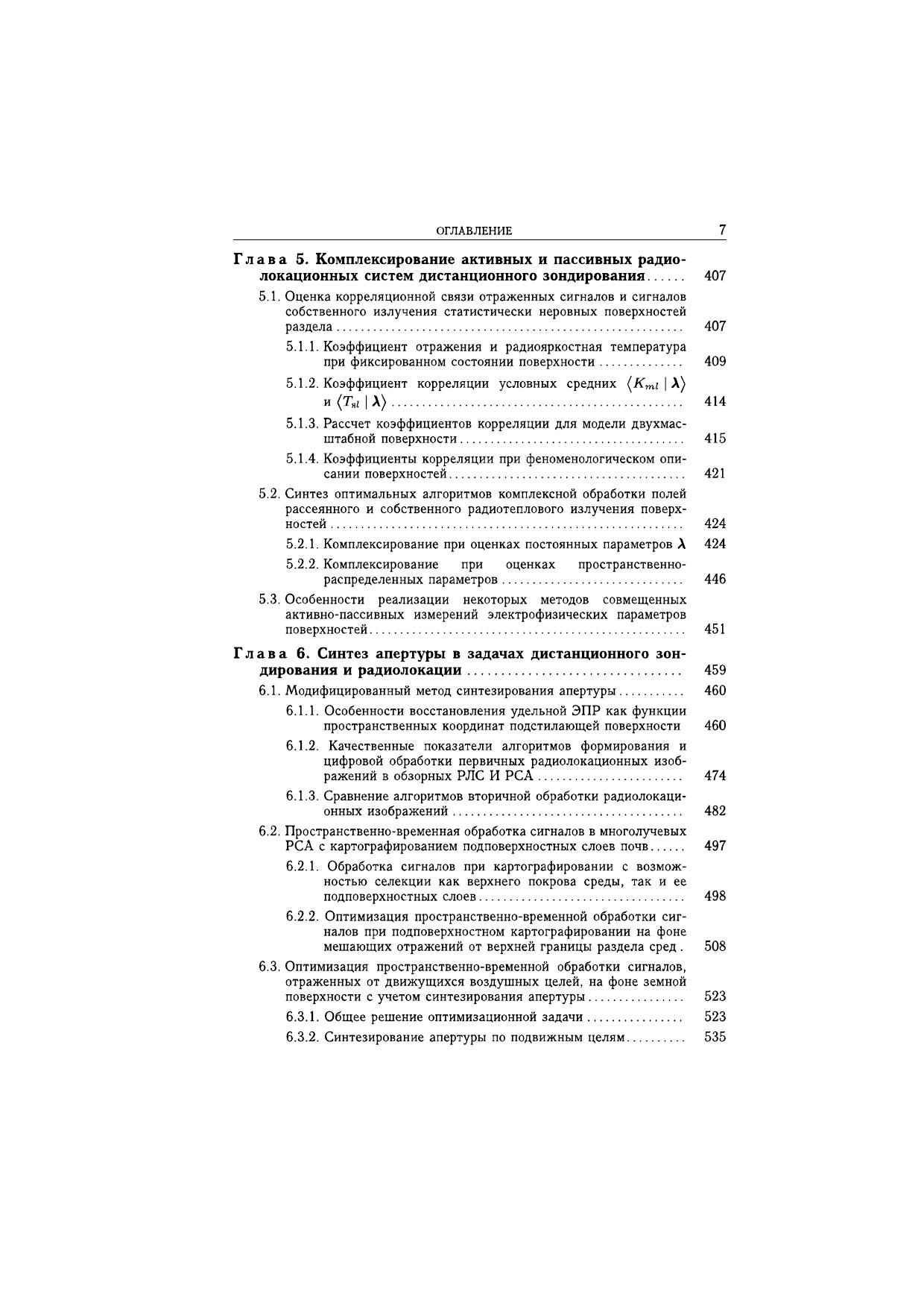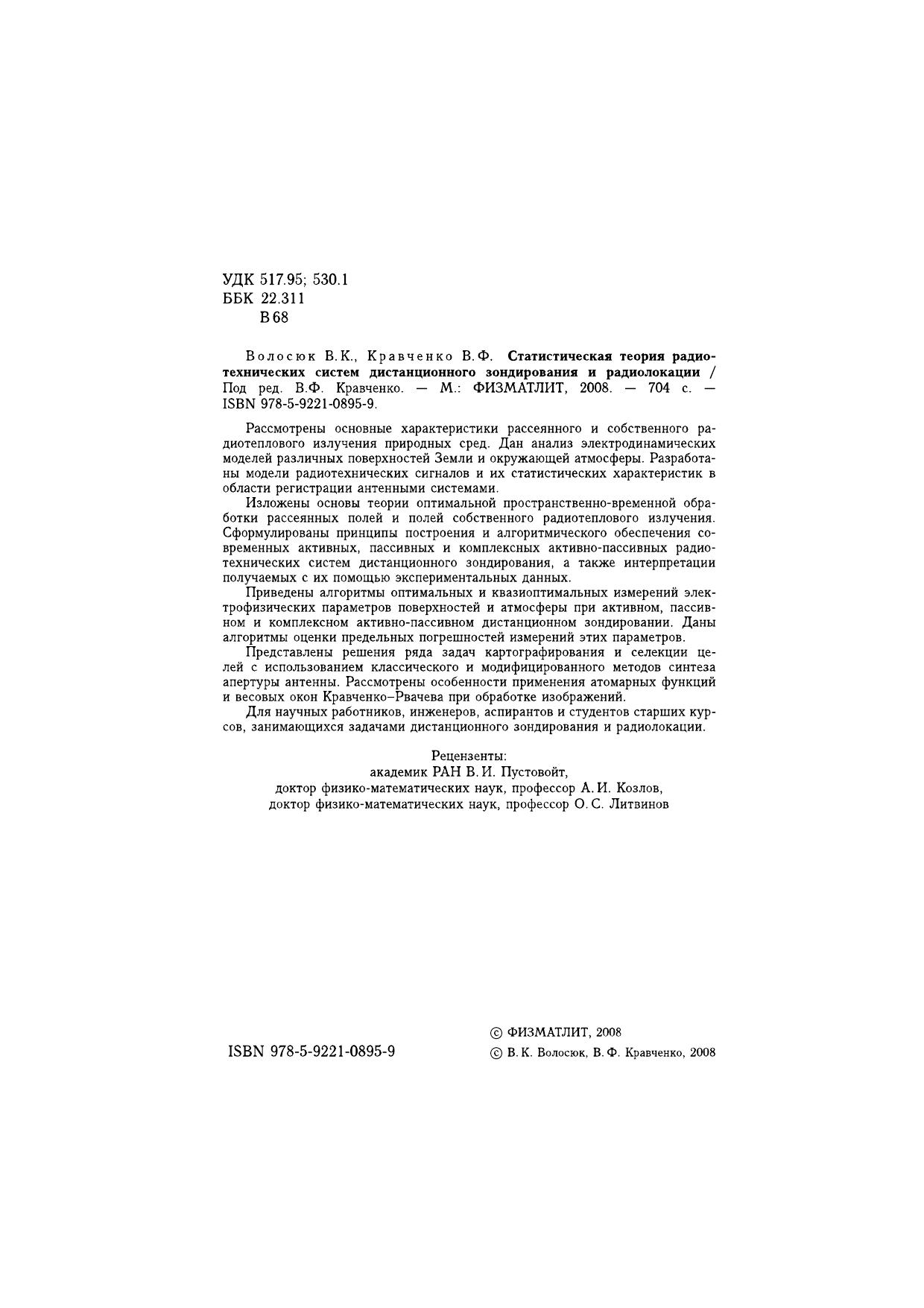 Рассмотрены основные характеристики рассеянного и собственного радиотеплового излучения природных сред. Дан анализ электродинамических моделей различных поверхностей Земли и окружающей атмосферы. Разработаны модели радиотехнических сигналов и их статистических характеристик в области регистрации антенными системами. Изложены основы теории оптимальной пространственно-временной обработки рассеянных полей и полей собственного радиотеплового излучения. Сформулированы принципы построения и алгоритмического обеспечения современных активных, пассивных и комплексных активно-пассивных радиотехнических систем дистанционного зондирования, а также интерпретации получаемых с их помощью экспериментальных данных. Приведены алгоритмы оптимальных и квазиоптимальных измерений электрофизических параметров поверхностей и атмосферы при активном, пассивном и комплексном активно-пассивном дистанционном зондировании и оценки предельных погрешностей измерений этих параметров. Представлены решения ряда задач картографирования и селекции целей с использованием классического и модифицированного методов синтеза апертуры антенны. Рассмотрены особенности применения атомарных функций и весовых окон Кравченко-Рвачева при обработке изображений. Для научных работников, инженеров, аспирантов и cтудентов старших курсов, занимающихся задачами дистанционного зондирования и радиолокации.