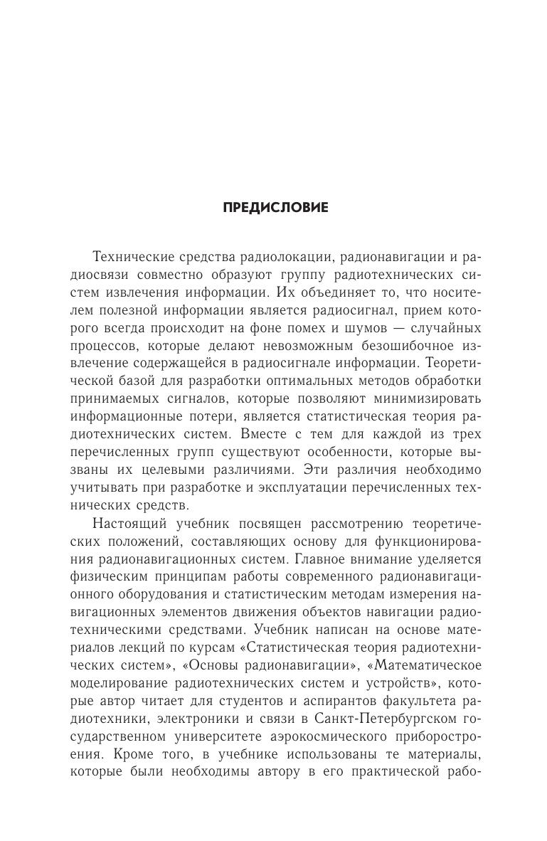 Настоящий учебник посвящен рассмотрению положений, составляющих теоретическую базу работы радионавигационных систем. Основное внимание уделяется физическим и математическим принципам функционирования современного радионавигационного оборудования. Рассмотрены особенности канала распространения радионавигационных сигналов, статистические методы их оптимальной обработки, методы измерения радионавигационных параметров, определения точности оценки местоположения объекта навигации. В учебнике даны примеры современных радионавигационных систем, используемых в авиационной радионавигации. Книга предназначена для студентов и аспирантов радиотехнических специальностей высших учебных заведений, а также может быть полезна широкому кругу специалистов, занимающихся вопросами разработки и исследования средств радионавигации и радиолокации.