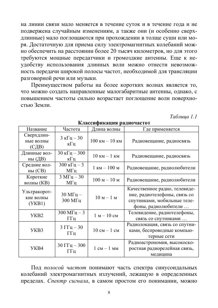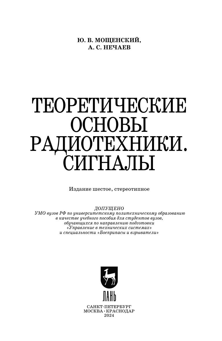 Рассмотрены и описаны вопросы общей теории сигналов, гармонического анализа и их спектрального представления. Подробно рассмотрены различные виды модуляции, корреляционный анализ, основы теории случайных сигналов, рассмотрены дискретные и цифровые сигналы. Каждый раздел завершается контрольными вопросами, в конце пособия приведены задачи для закрепления теоретического материала. В пособии заложены основы для последующего изучения таких дисциплин, как теоретические основы ближней радиолокации, теория обработки сигналов в автоматических системах управления, теория обработки информации в системах ближней локации, статистический анализ и синтез радиотехнических устройств и систем управления средствами поражения, моделирование радиотехнических систем, радиотехнические цепи и сигналы, статистическая радиотехника, приемопередающие и антенно-фидерные устройства. Предназначено для студентов, обучающихся по направлениям подготовки и специальностей высшего образования «Оружие и системы вооружения» и «Управление в технических системах». Также может быть полезно инженерам и аспирантам радиотехнических специальностей.