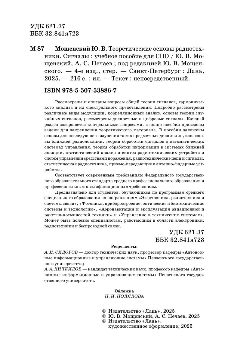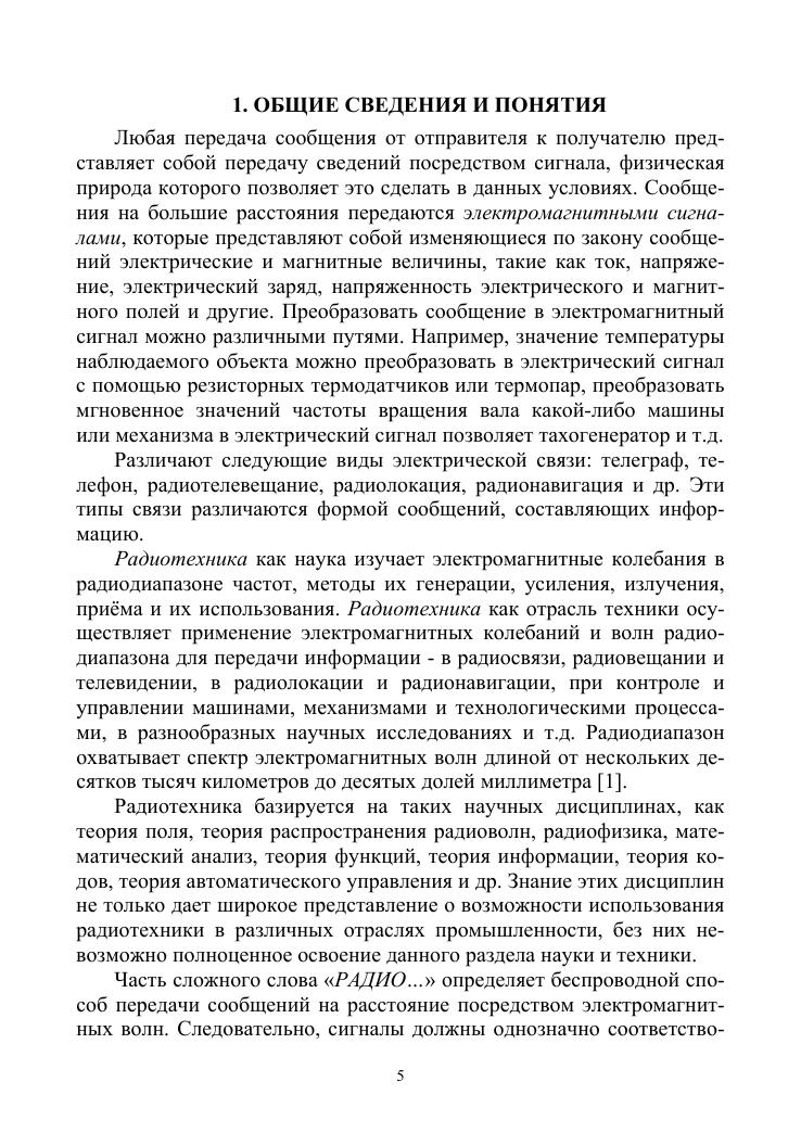 Рассмотрены и описаны вопросы общей теории сигналов, гармонического анализа и их спектрального представления. Подробно рассмотрены различные виды модуляции, корреляционный анализ, основы теории случайных сигналов, рассмотрены дискретные и цифровые сигналы. Каждый раздел завершается контрольными вопросами, в конце пособия приведены задачи для закрепления теоретического материала. В пособии заложены основы для последующего изучения таких предметных дисциплин, как основы ближней радиолокации, теория обработки сигналов в автоматических системах управления, теория обработки информации в системах ближней локации, статистический анализ и синтез радиотехнических устройств и систем управления средствами поражения, радиотехнические цепи и сигналы, статистическая радиотехника, приемопередающие и антенно-фидерные устройства. Соответствует современным требованиям Федерального государственного образовательного стандарта среднего профессионального образования и профессиональным квалификационным требованиям. Предназначено для студентов, обучающихся по программам среднего специального образования по направлениям «Электроника, радиотехника и системы связи», «Фотоника, приборостроение, оптические и биотехнические системы и технологии», «Аэронавигация и эксплуатация авиационной и ракетно-космической техники» и «Управление в технических системах». Может быть полезно специалистам, работающим в области электроники, радиотехники и беспроводной связи.