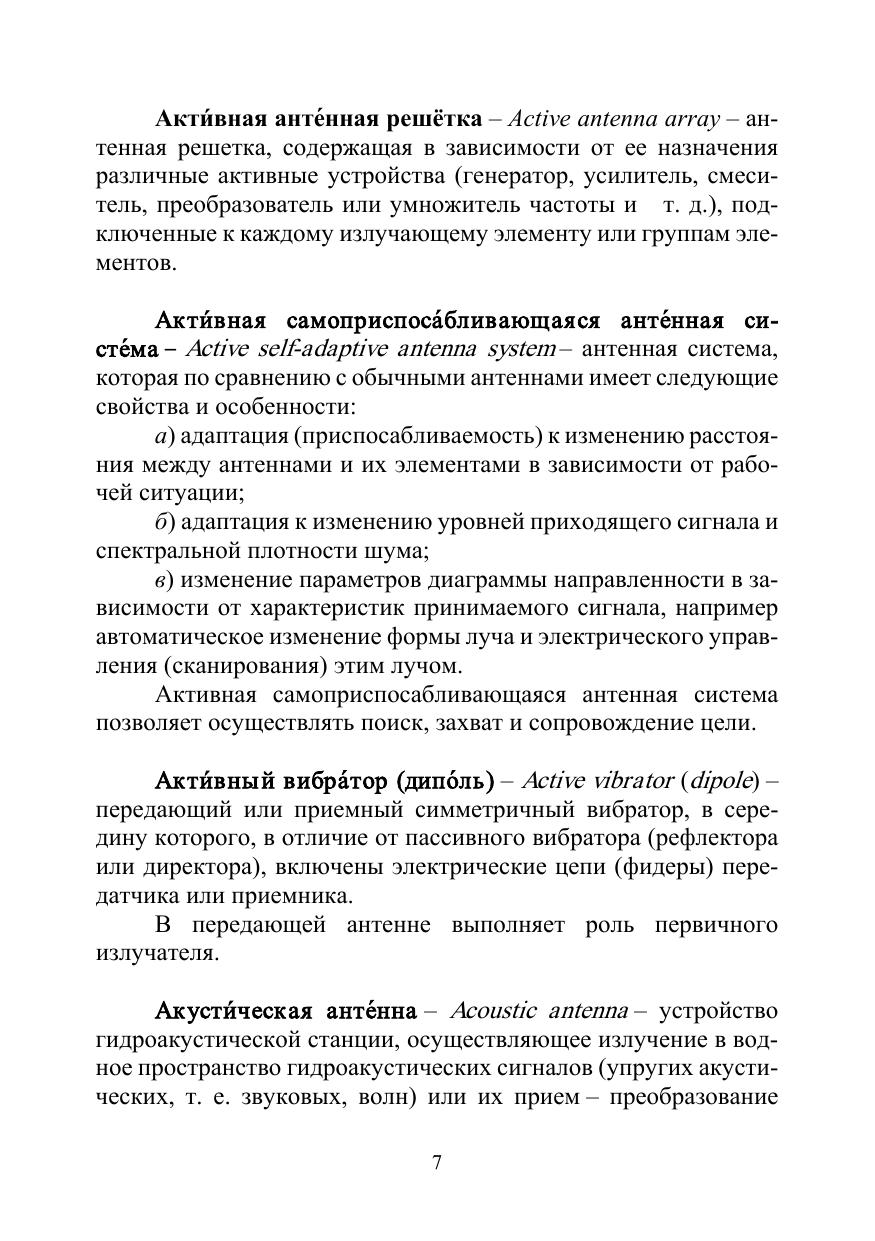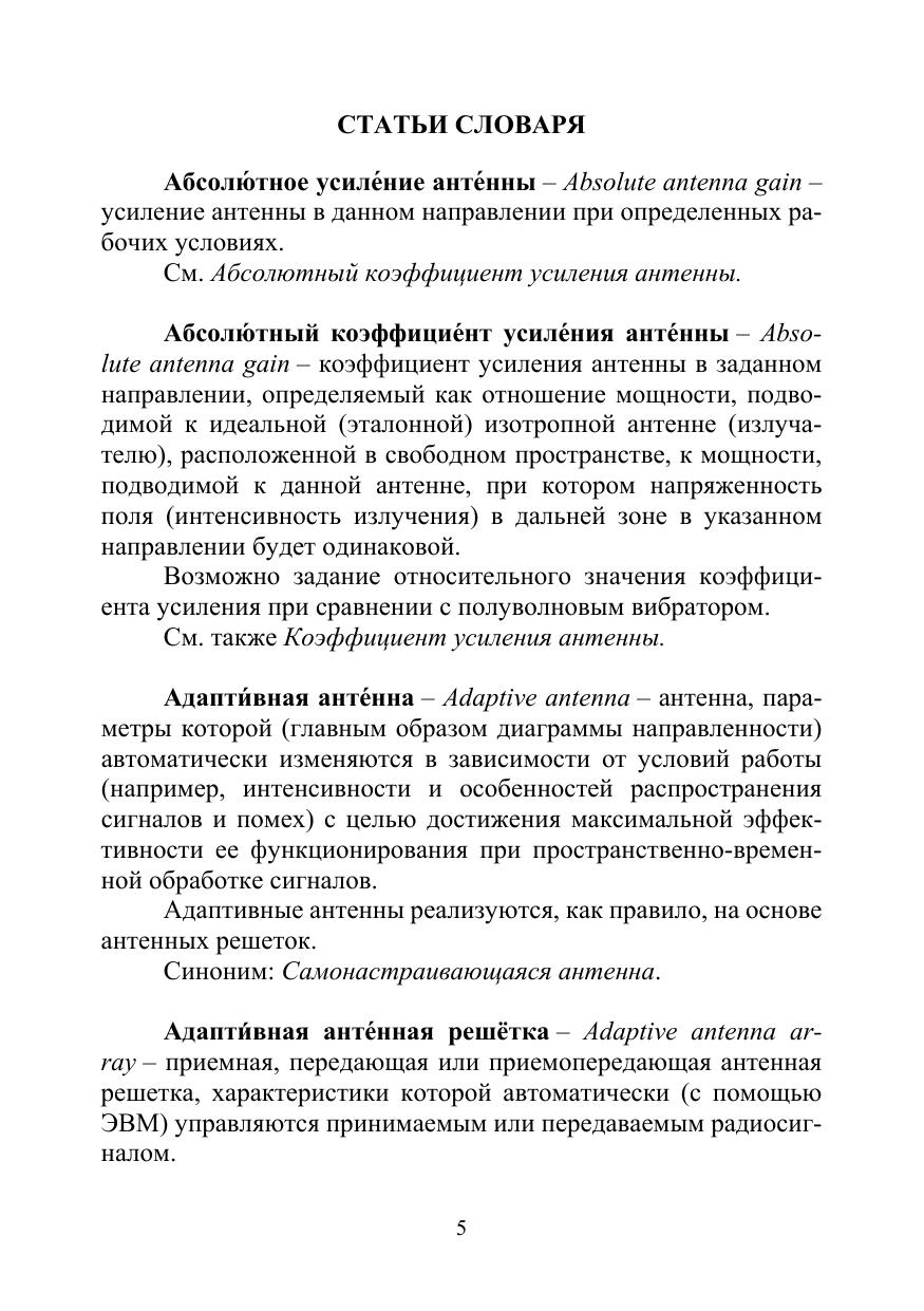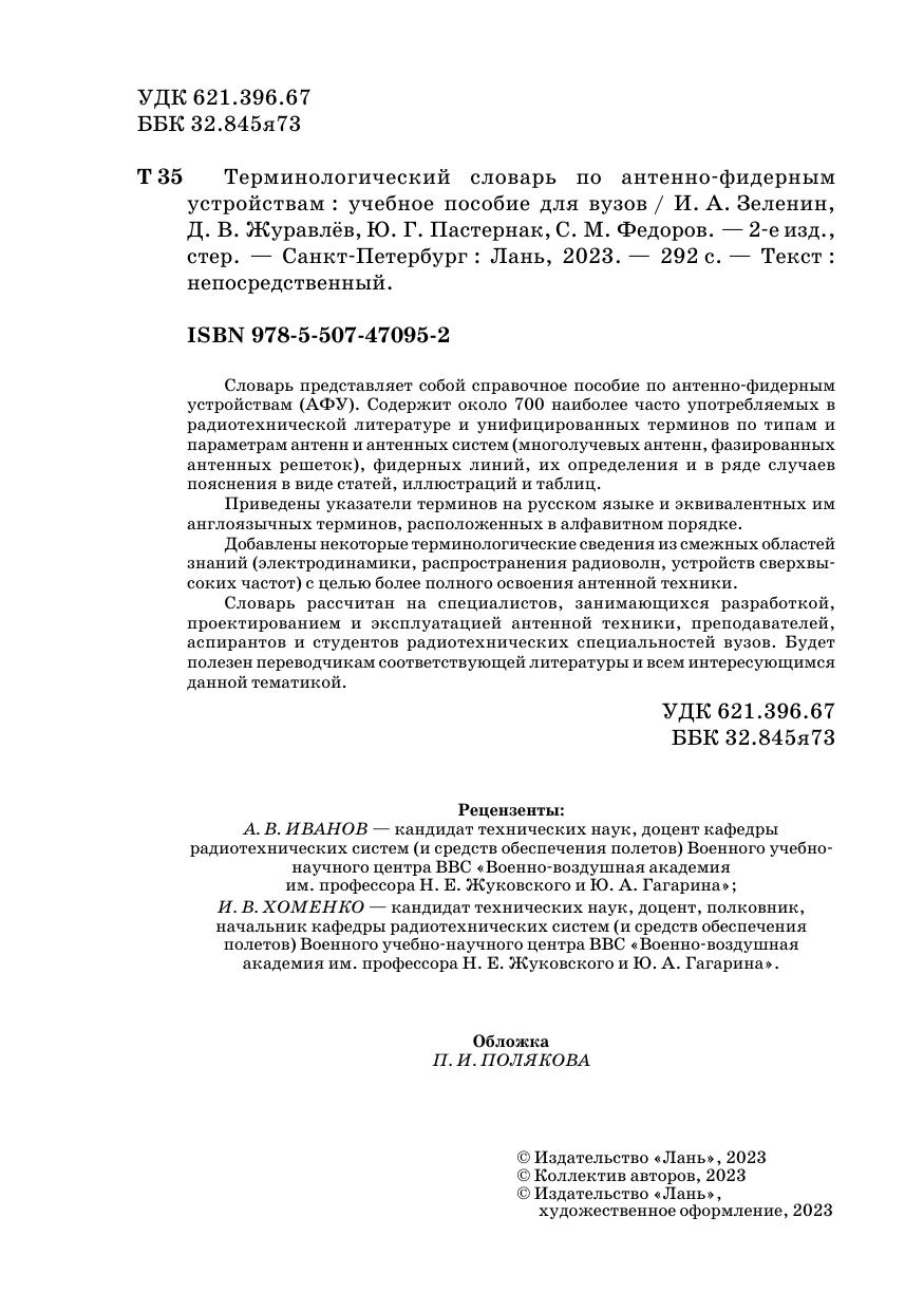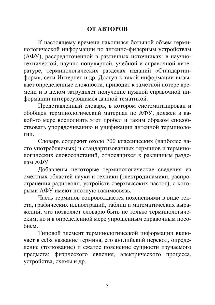 Словарь представляет собой справочное пособие по антенно-фидерным устройствам (АФУ). Содержит около 700 наиболее часто употребляемых в радиотехнической литературе и унифицированных терминов по типам и параметрам антенн и антенных систем (многолучевых антенн, фазированных антенных решеток), фидерных линий, их определения и в ряде случаев пояснения в виде статей, иллюстраций и таблиц. Приведены указатели терминов на русском языке и эквивалентных им англоязычных терминов, расположенных в алфавитном порядке. Добавлены некоторые терминологические сведения из смежных областей знаний (электродинамики, распространения радиоволн, устройств сверхвысоких частот) с целью более полного освоения антенной техники. Словарь рассчитан на специалистов, занимающихся разработкой, проектированием и эксплуатацией антенной техники, преподавателей, аспирантов и студентов радиотехнических специальностей вузов. Будет полезен переводчикам соответствующей литературы и всем интересующимся данной тематикой.